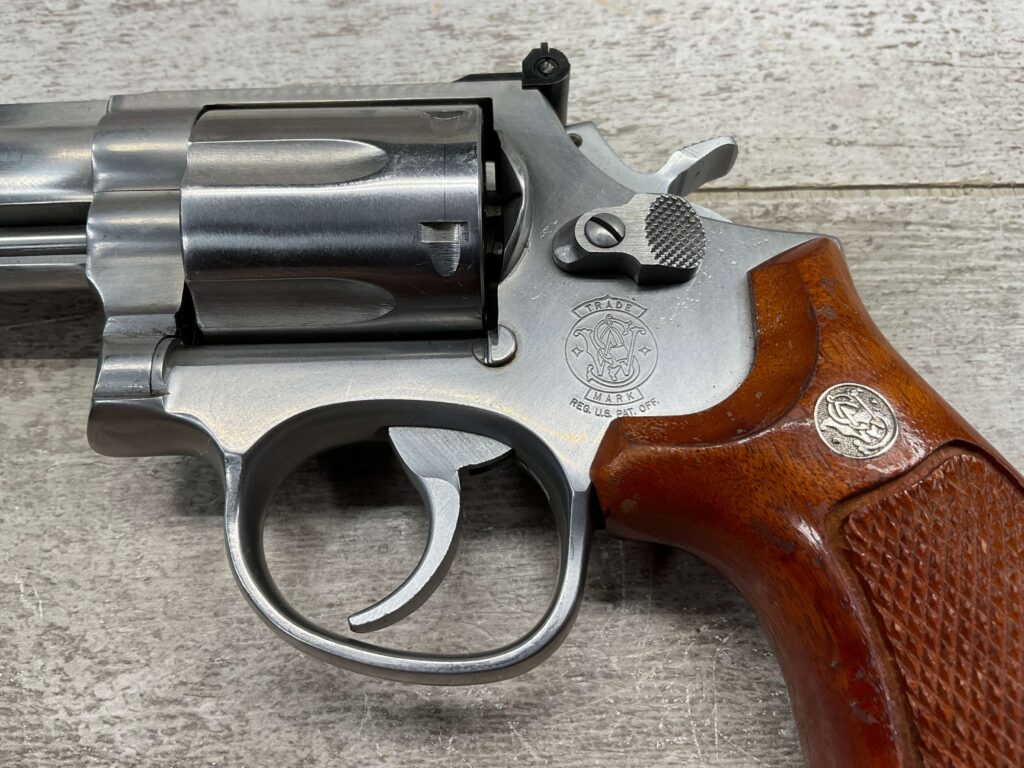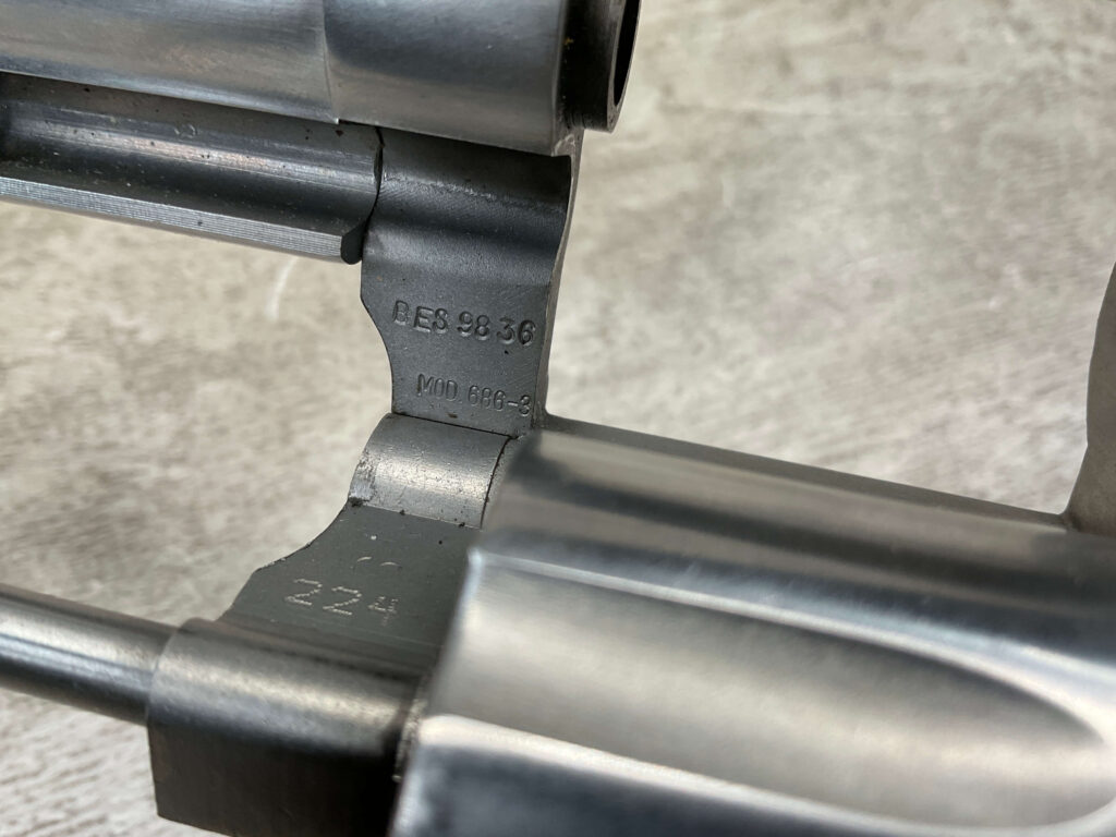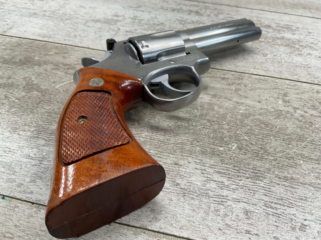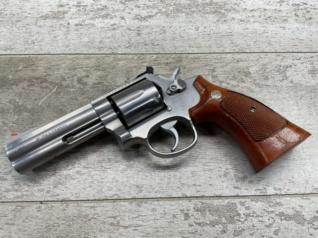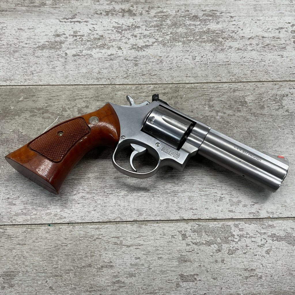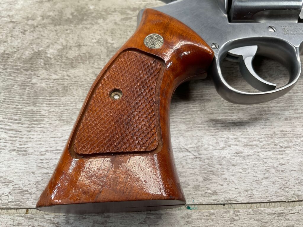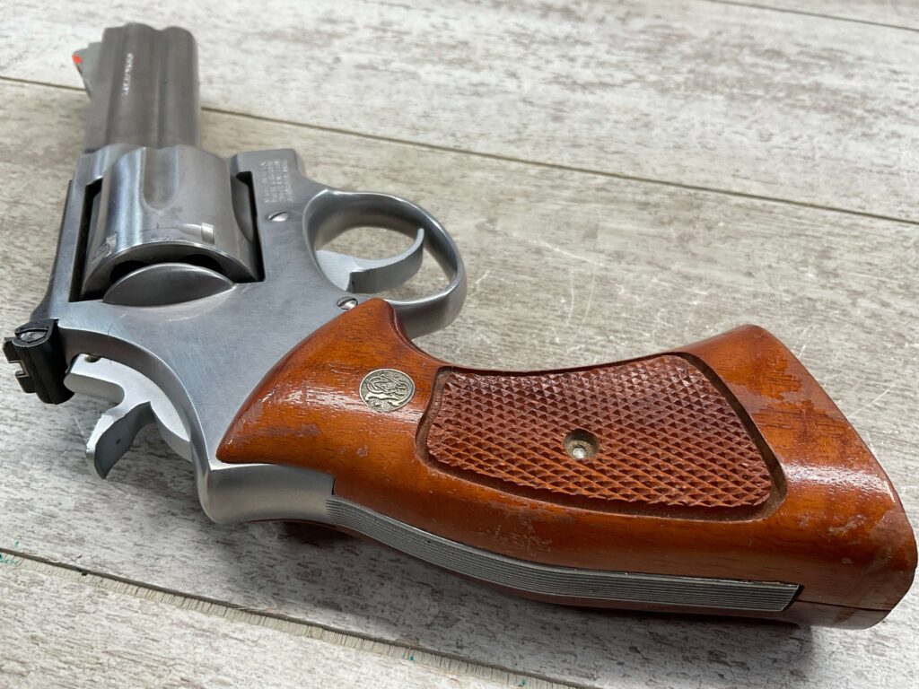 SMITH & WESSON S&W 686-3 .357 MAGNUM STAINLESS STEEL REVOLVER #BES9836, 4 1/8″ BARREL, EXC STAINLESS STEEL FINISH W/VERY LIGHT HANDLING MARKS, EXC BORE & RIFLING, VG CHECKERED WALNUT GRIPS W/LIGHT WEAR & PIECE MISSING ON BACKSTRAP, REAR ADJ SIGHT, BLADE FRONT SIGHT, TIGHT LOCK UP, 90%+ OVERALL