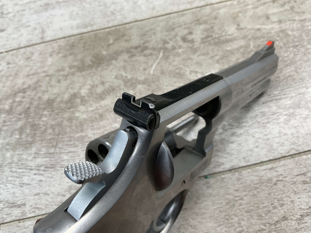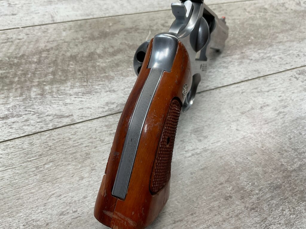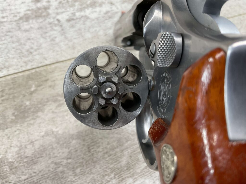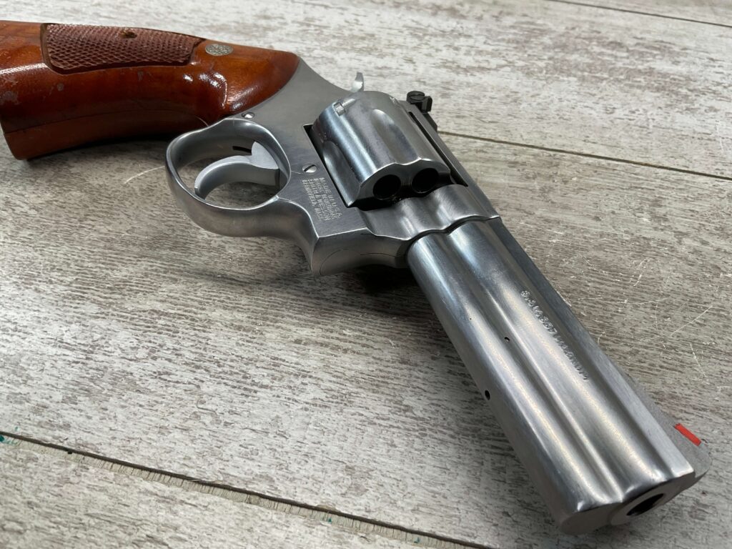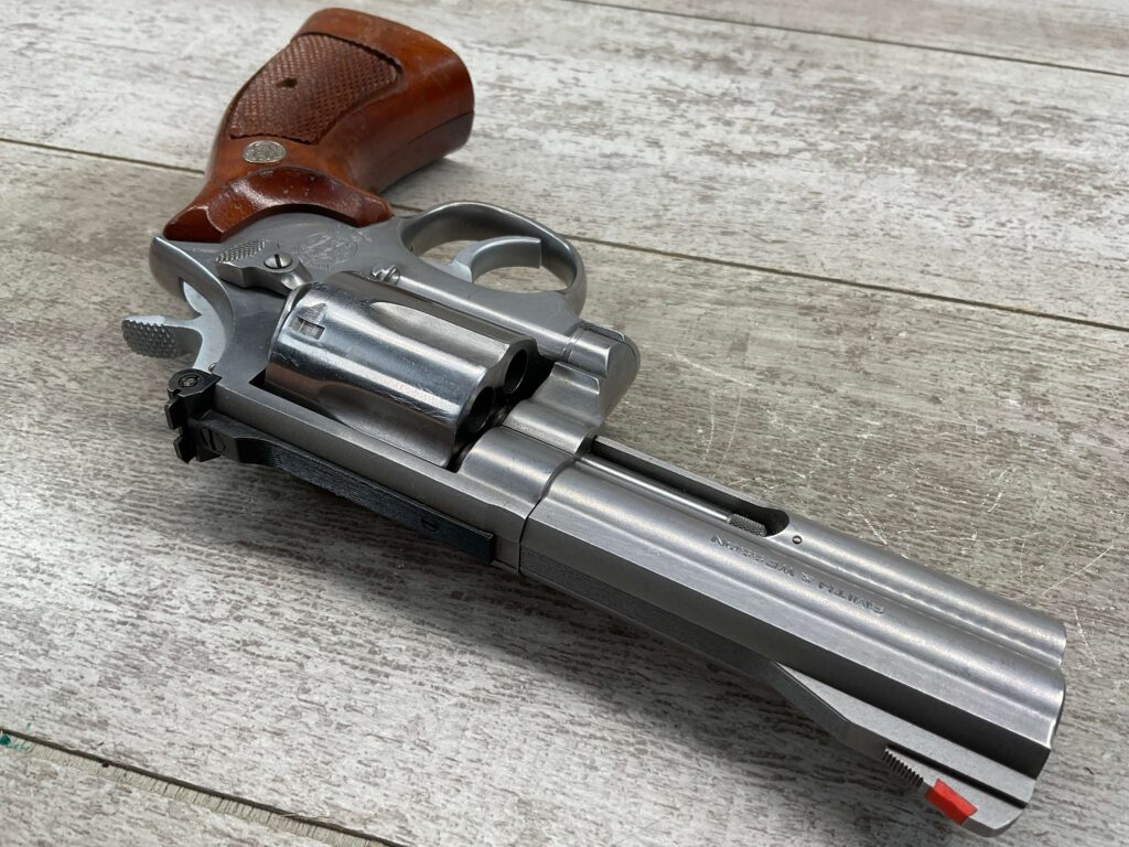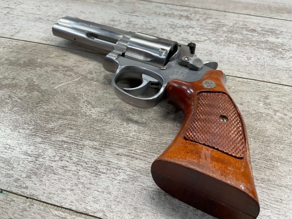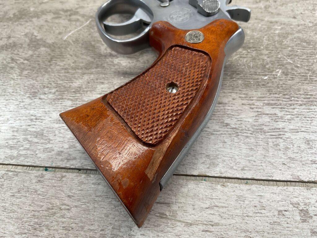 SMITH & WESSON S&W 686-3 .357 MAGNUM STAINLESS STEEL REVOLVER #BES9836, 4 1/8″ BARREL, EXC STAINLESS STEEL FINISH W/VERY LIGHT HANDLING MARKS, EXC BORE & RIFLING, VG CHECKERED WALNUT GRIPS W/LIGHT WEAR & PIECE MISSING ON BACKSTRAP, REAR ADJ SIGHT, BLADE FRONT SIGHT, TIGHT LOCK UP, 90%+ OVERALL