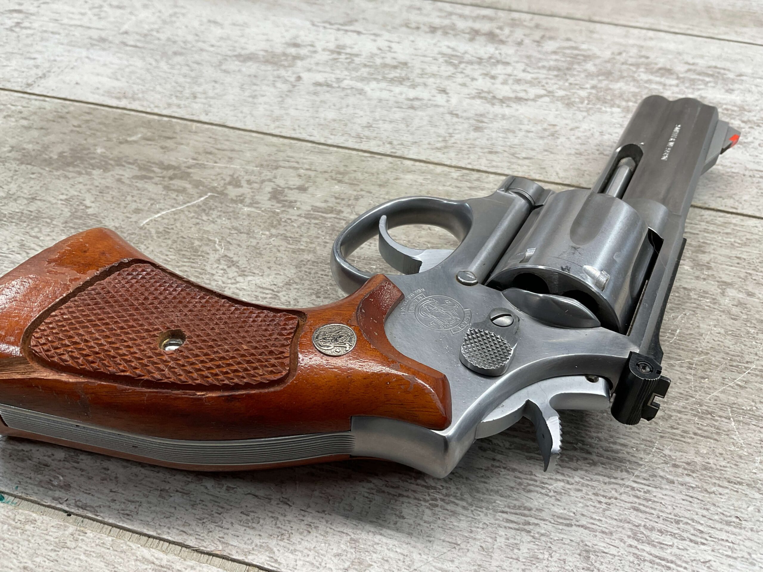 SMITH & WESSON S&W 686-3 .357 MAGNUM STAINLESS STEEL REVOLVER #BES9836, 4 1/8″ BARREL, EXC STAINLESS STEEL FINISH W/VERY LIGHT HANDLING MARKS, EXC BORE & RIFLING, VG CHECKERED WALNUT GRIPS W/LIGHT WEAR & PIECE MISSING ON BACKSTRAP, REAR ADJ SIGHT, BLADE FRONT SIGHT, TIGHT LOCK UP, 90%+ OVERALL