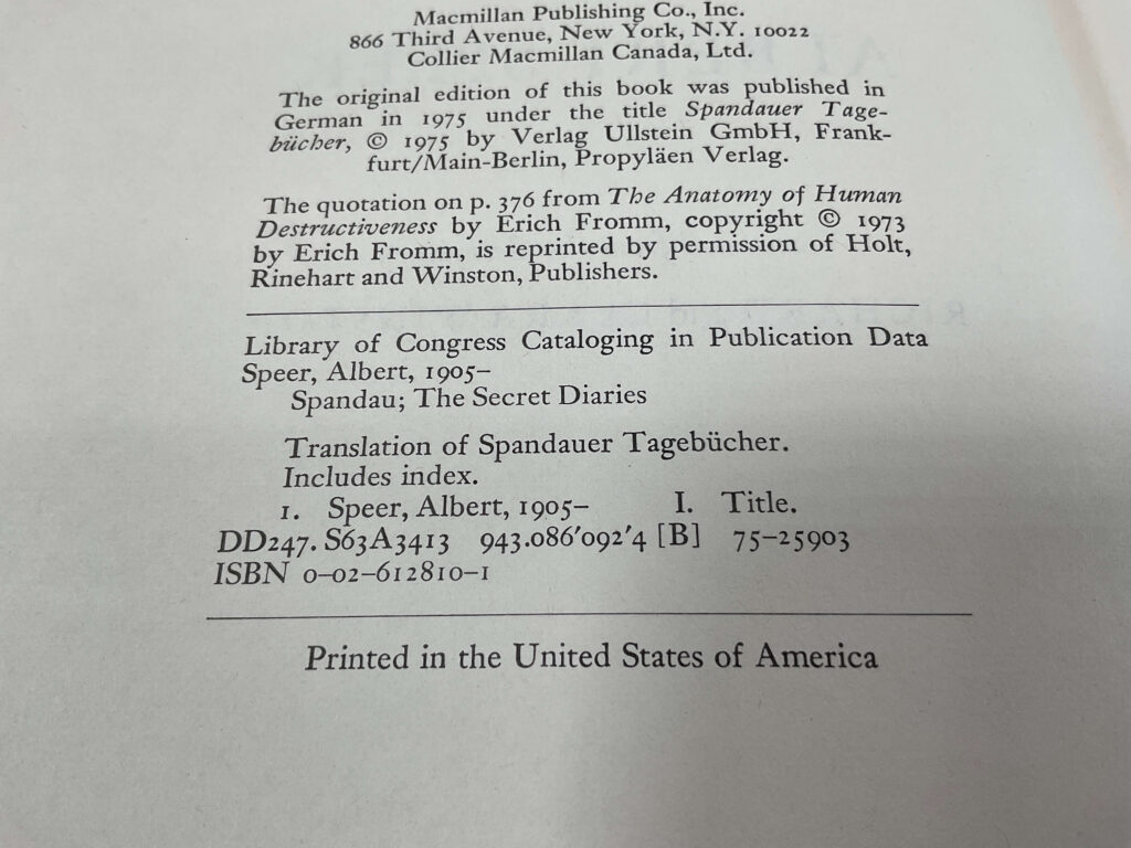 SPANDAU: THE SECRET DIARIES by ALBERT SPEER, 1975, HARDCOVER, ISBN: 0-02-612810-1