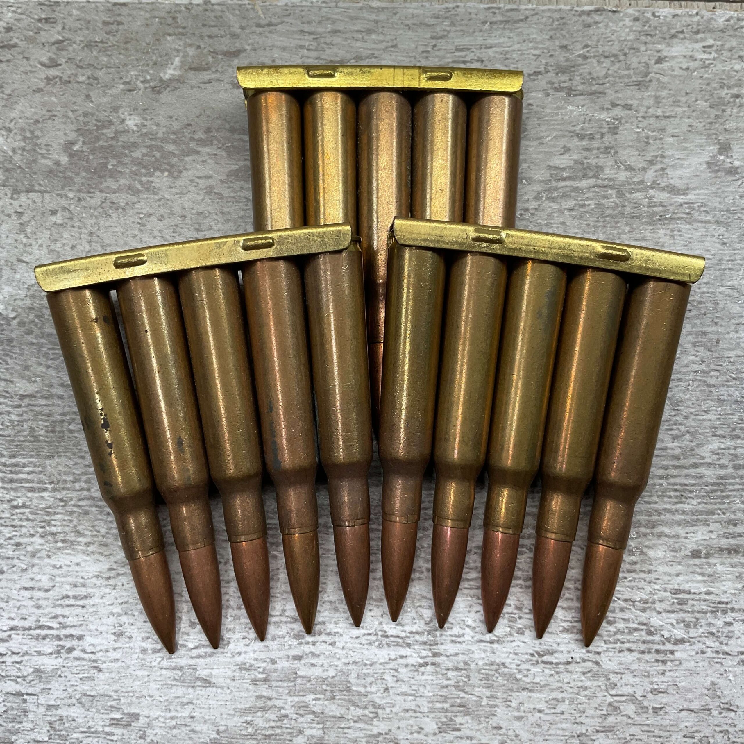SPANISH 1950 7X57MM MAUSER AMMO, VINTAGE, ON STRIPPER CLIPS, HEADSTAMP “PS / 1950”.