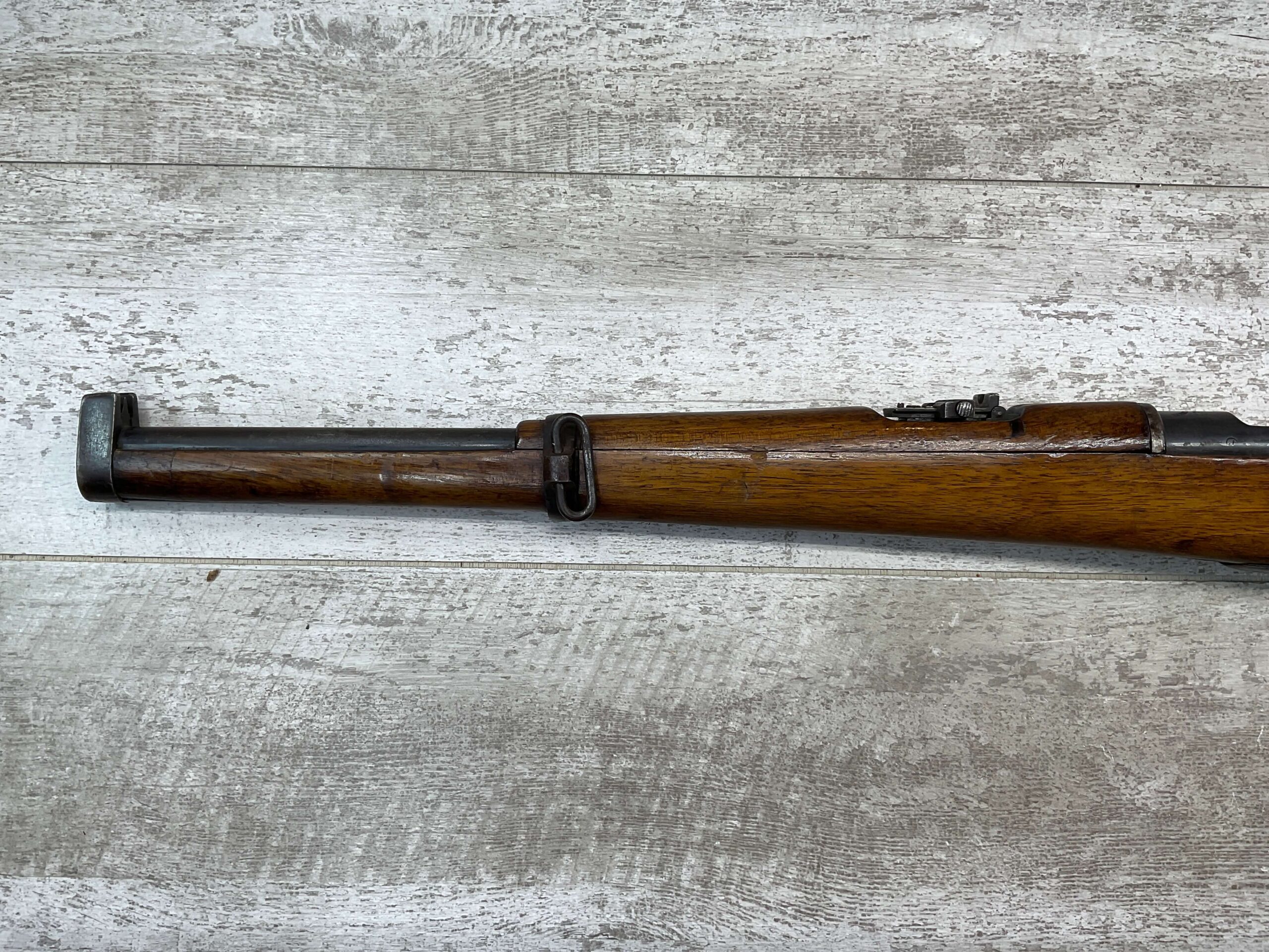 SPANISH OVIEDO MODEL 1895 CARBINE 7X57 MAUSER BOLT ACTION RIFLE #G9524, 1915 MFR, 18″ BBL, POOR BORE W/FROSTING THROUGHOUT, VG WOOD W/DINGS & IMPRESSIONS FROM USE/AGE & MATCHING # TO RECEIVER, BOLT ASSEMBLY MARKED “740”, FRONT BLADE SIGHT W/WINGS, LADDER STYLE REAR SIGHT GRADUATED TO 1400 METERS, GOOD ORIGINAL BLUE FINISH W/HIGH EDGE WEAR & SOME AREAS TURNING GREY PATINA, ORIGINAL SADDLE RING, SMOOTH ACTION, RARE SPANISH CAVALRY CARBINE!!