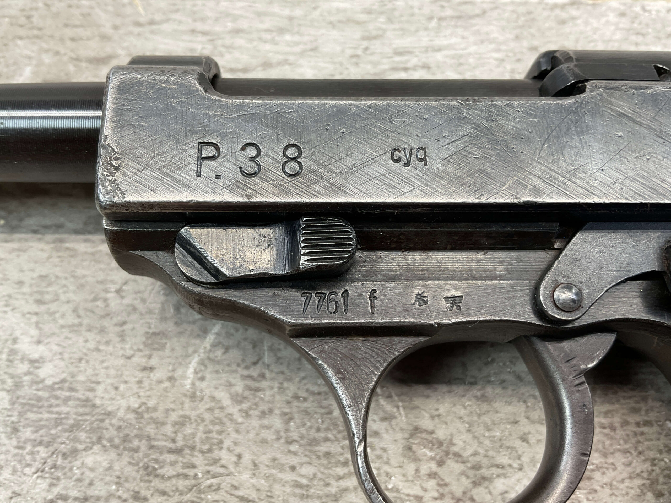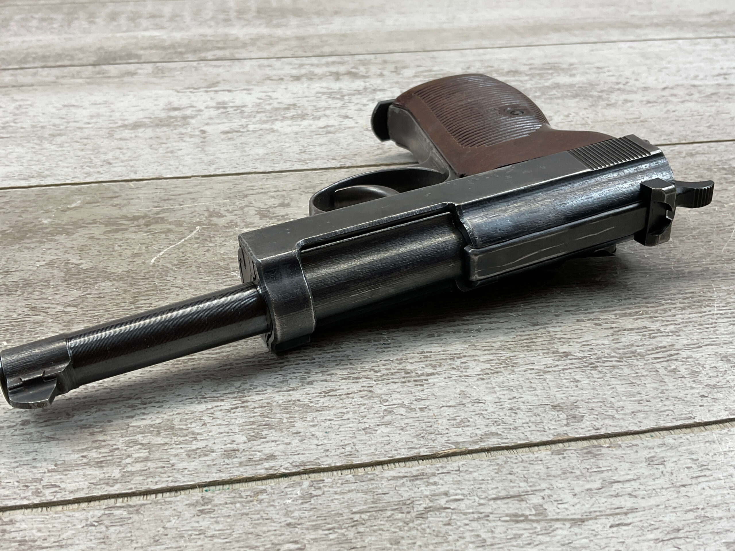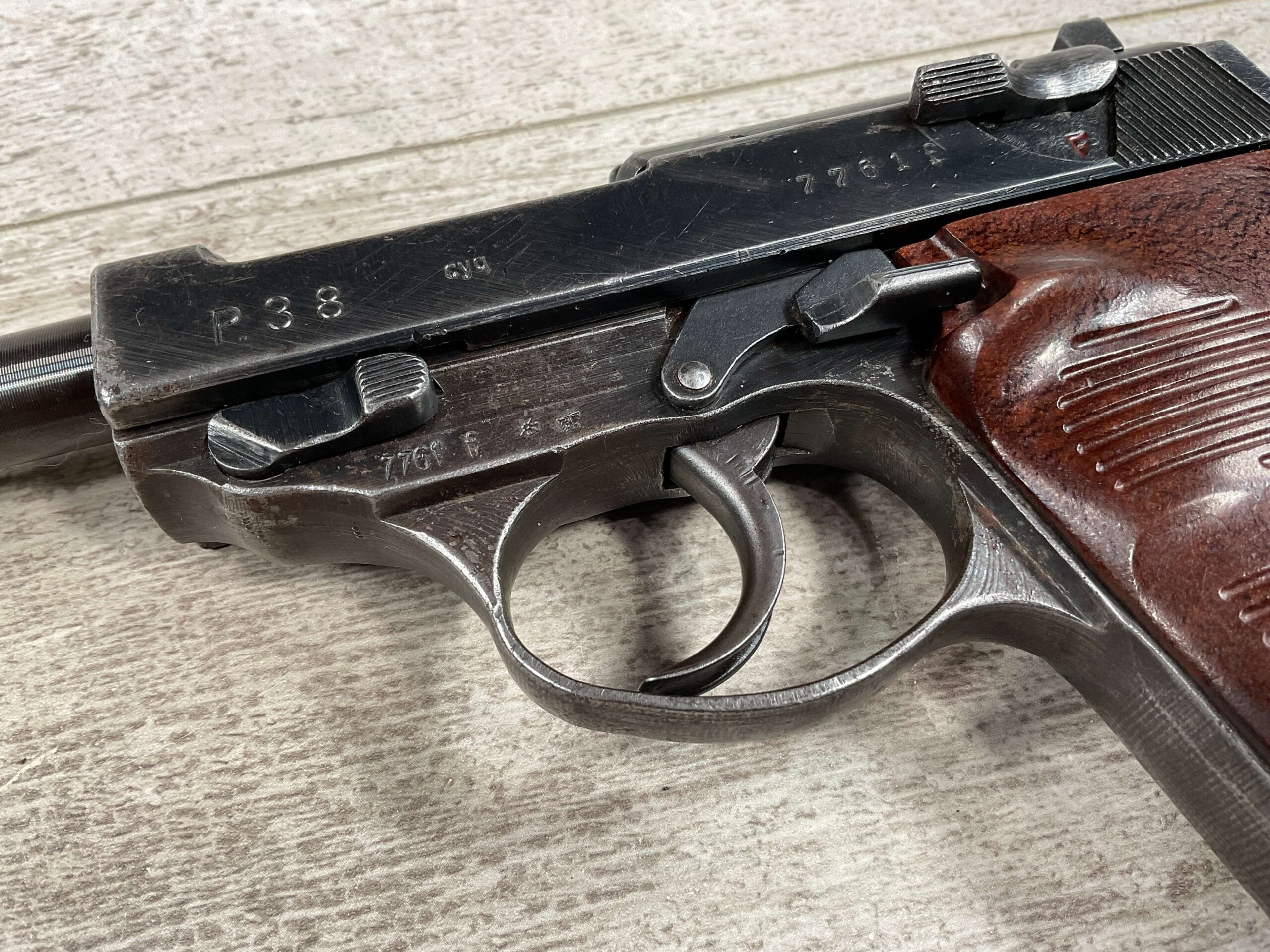 SPREEWERK cyq P38 9MM PISTOL #7761f, ARMORERS REPLACEMENT WaA135 5″ BARREL, REWORK MAGAZINE, MATCHING LOCKING BLOCK, ORIGINAL FINISH W/LIGHT HIGH EDGE WEAR, BRIGHT BORE W/LIGHTLY WORN RIFLING & LIGHT FROSTING IN THE GROOVES, EXC BROWN SPREEWERK GRIPS, 95+% OVERALL