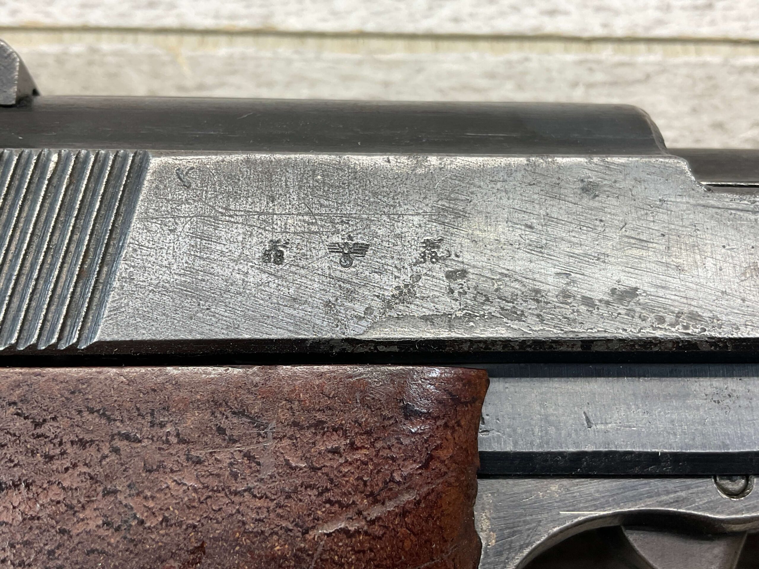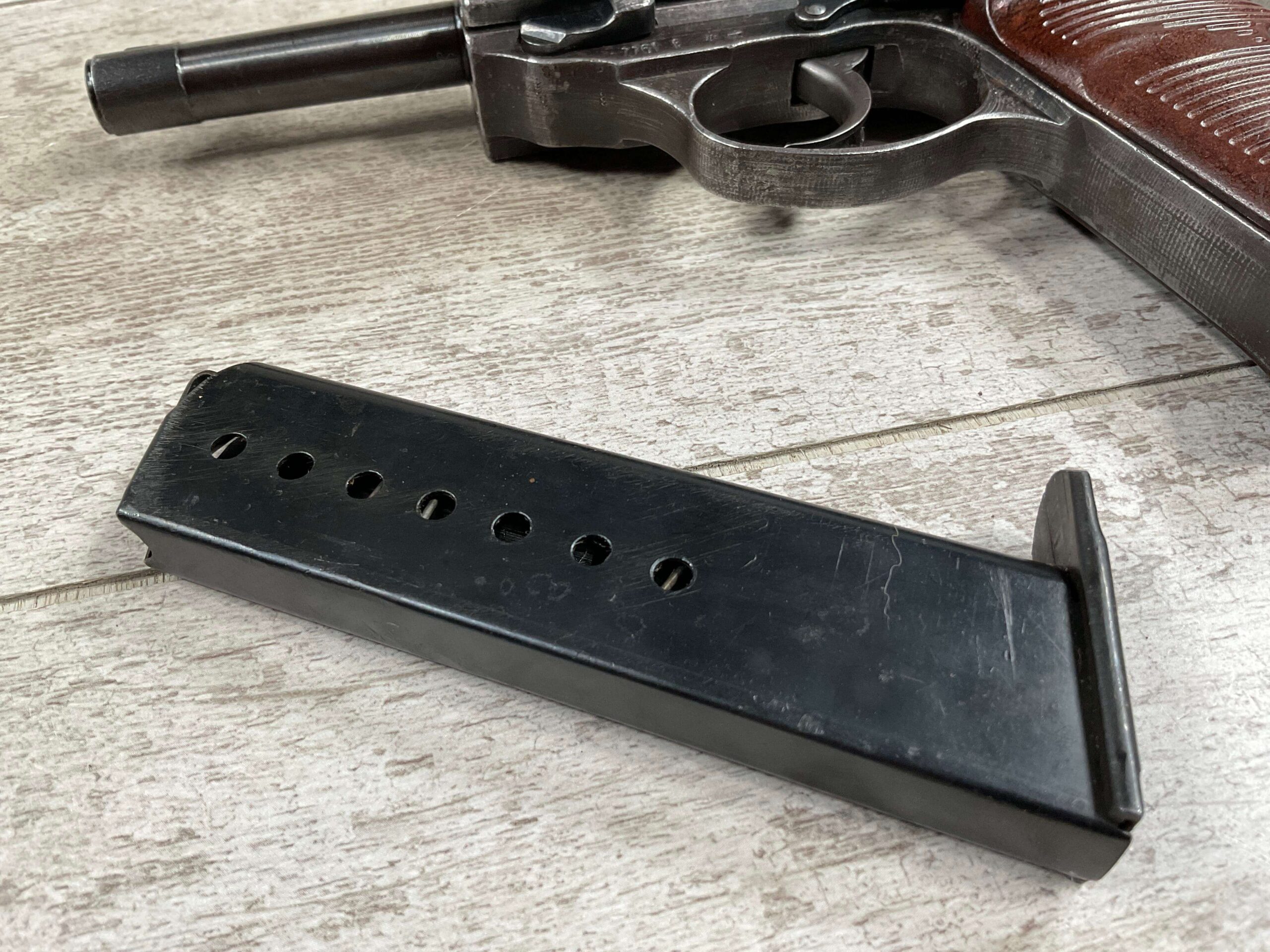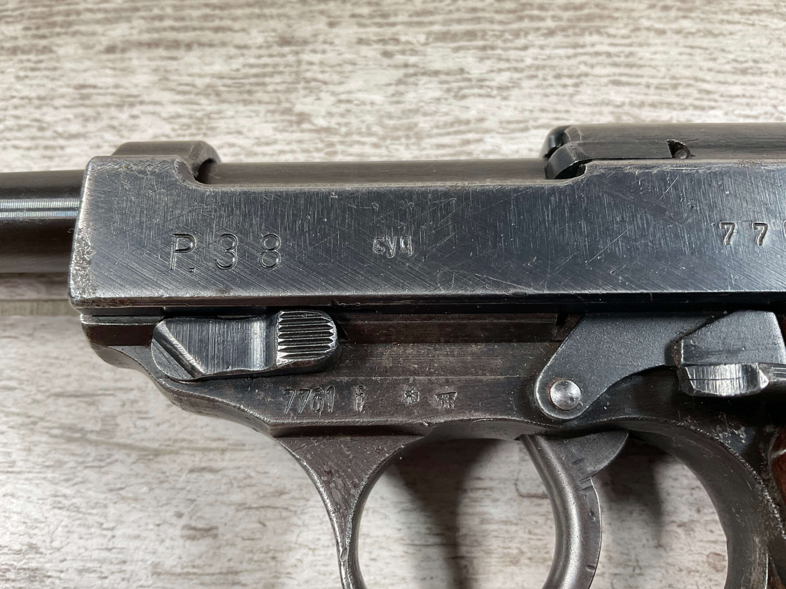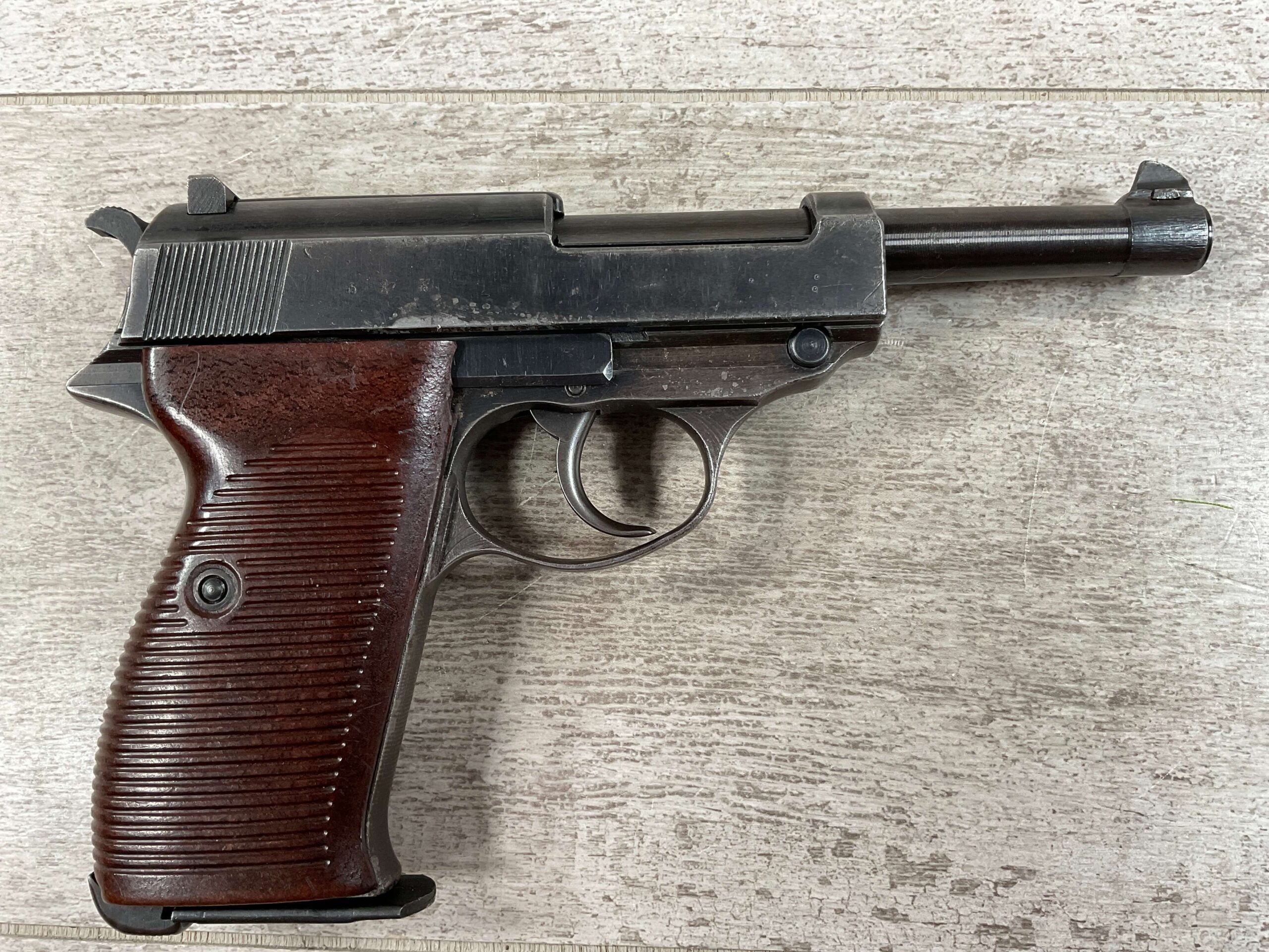 SPREEWERK cyq P38 9MM PISTOL #7761f, ARMORERS REPLACEMENT WaA135 5″ BARREL, REWORK MAGAZINE, MATCHING LOCKING BLOCK, ORIGINAL FINISH W/LIGHT HIGH EDGE WEAR, BRIGHT BORE W/LIGHTLY WORN RIFLING & LIGHT FROSTING IN THE GROOVES, EXC BROWN SPREEWERK GRIPS, 95+% OVERALL