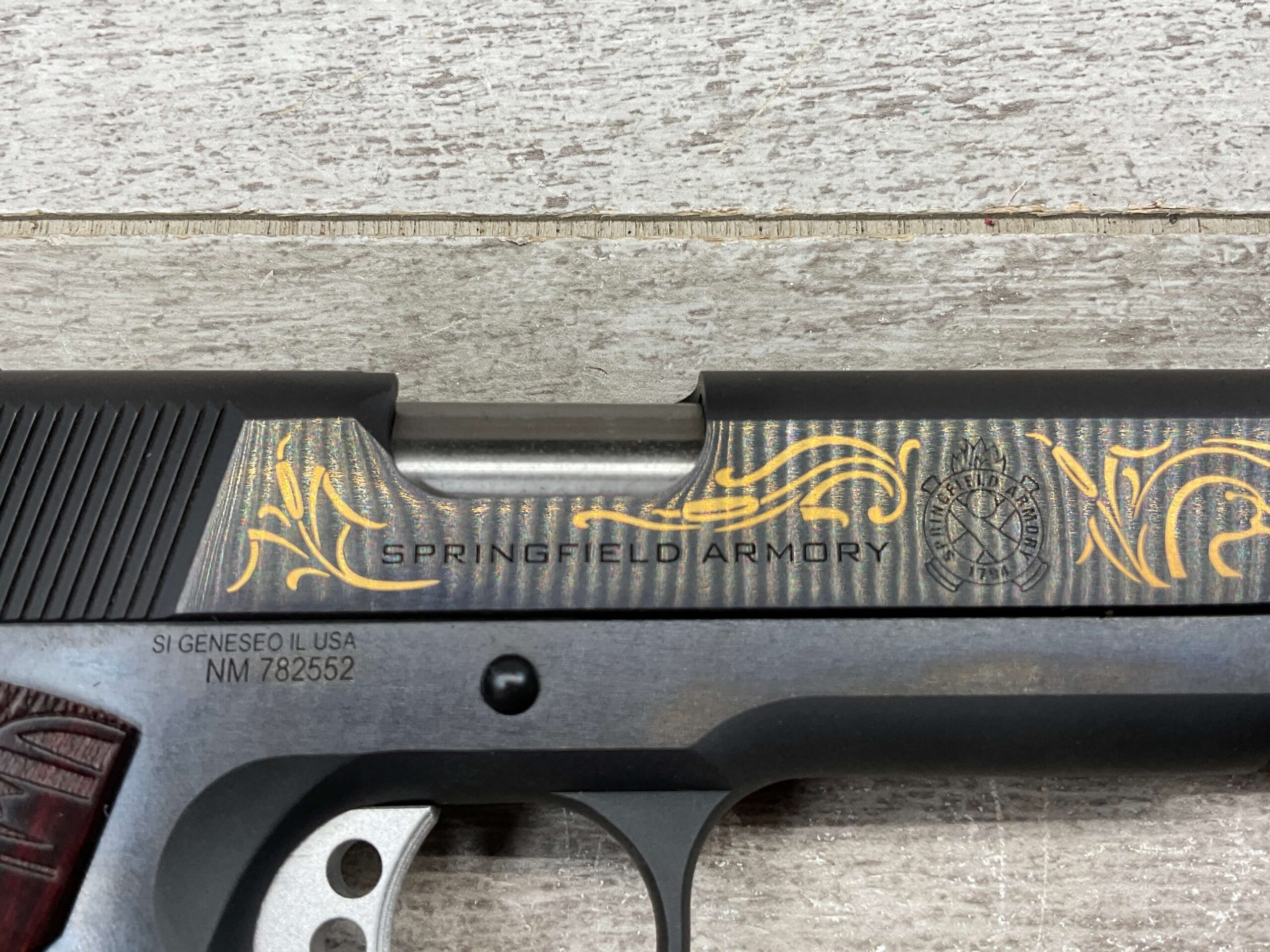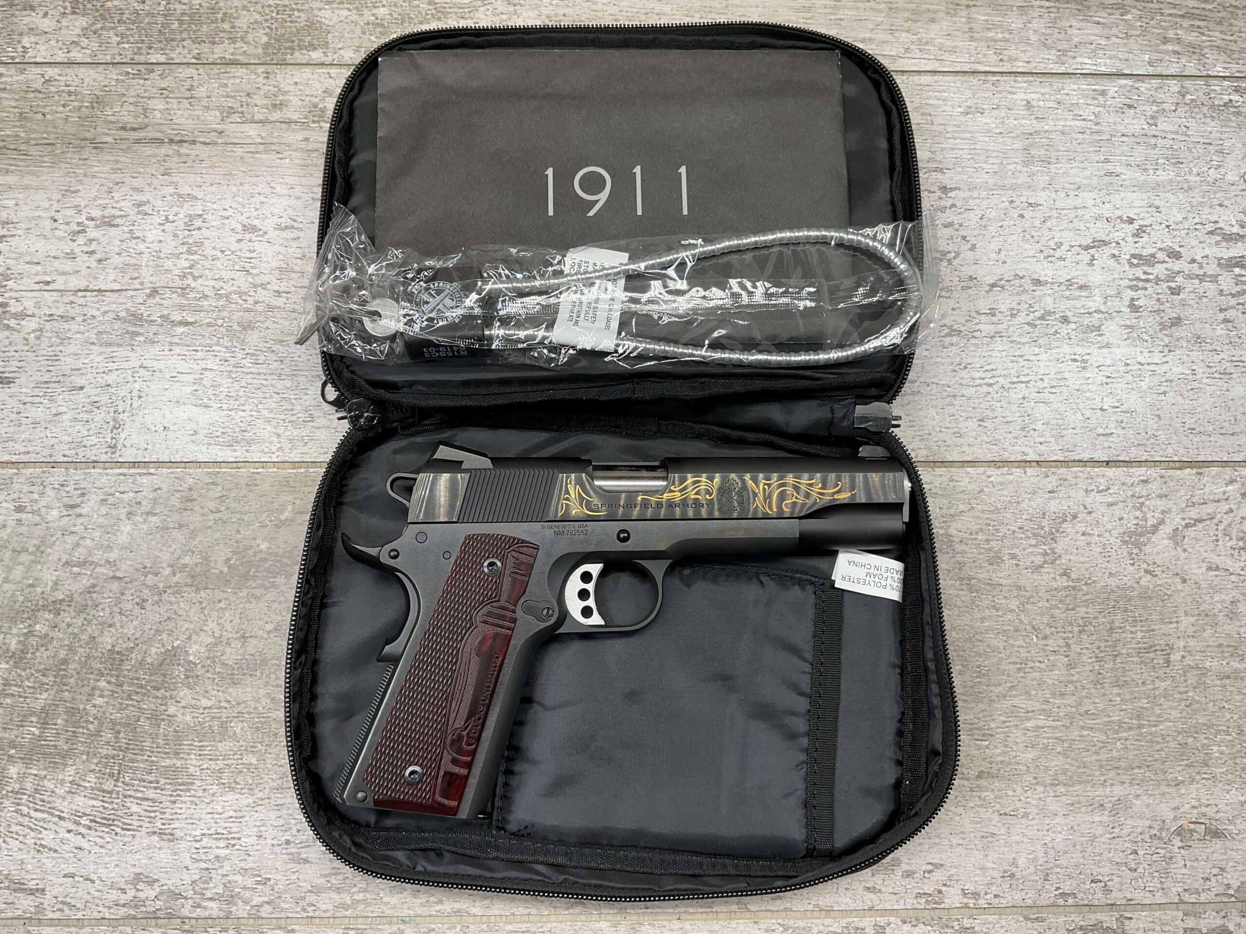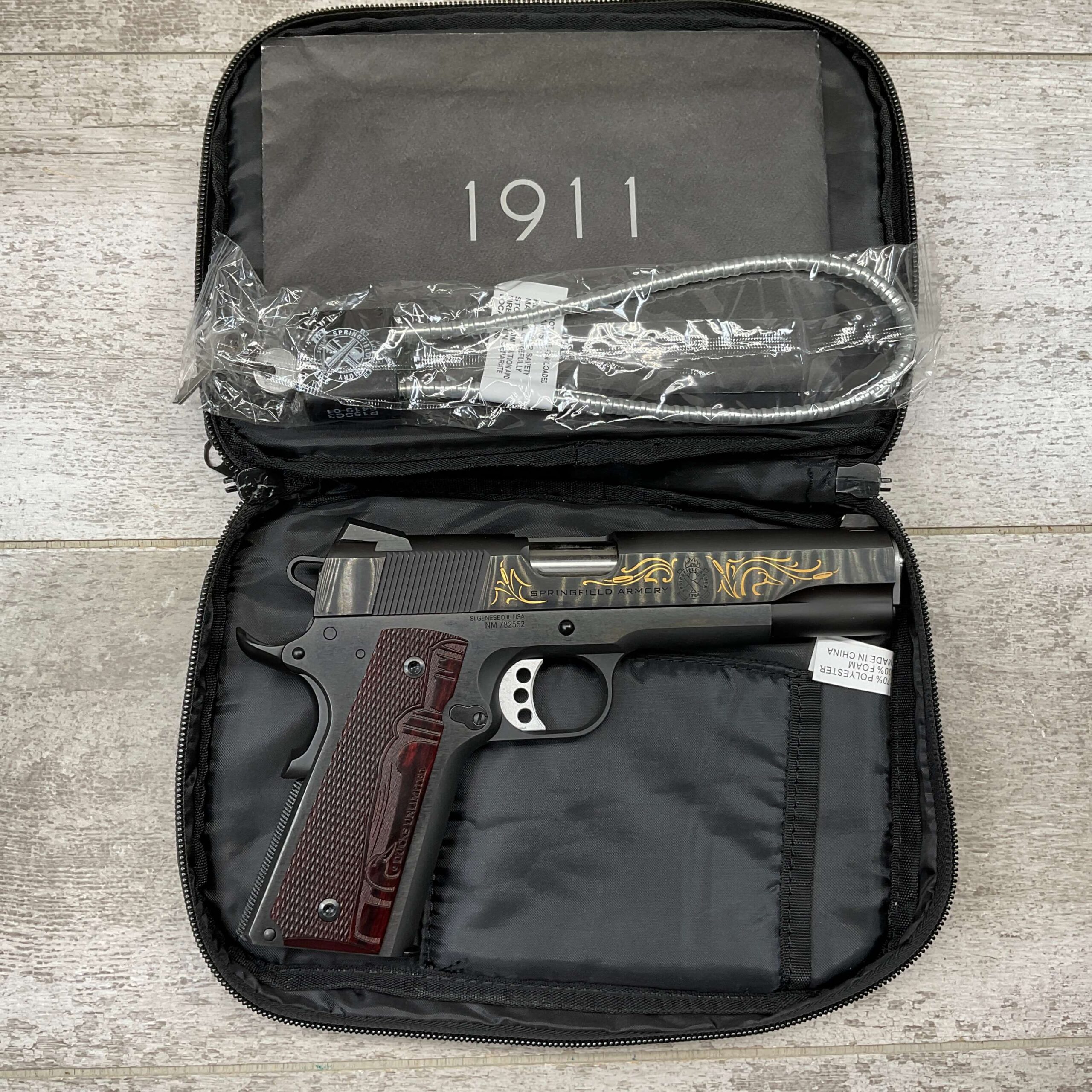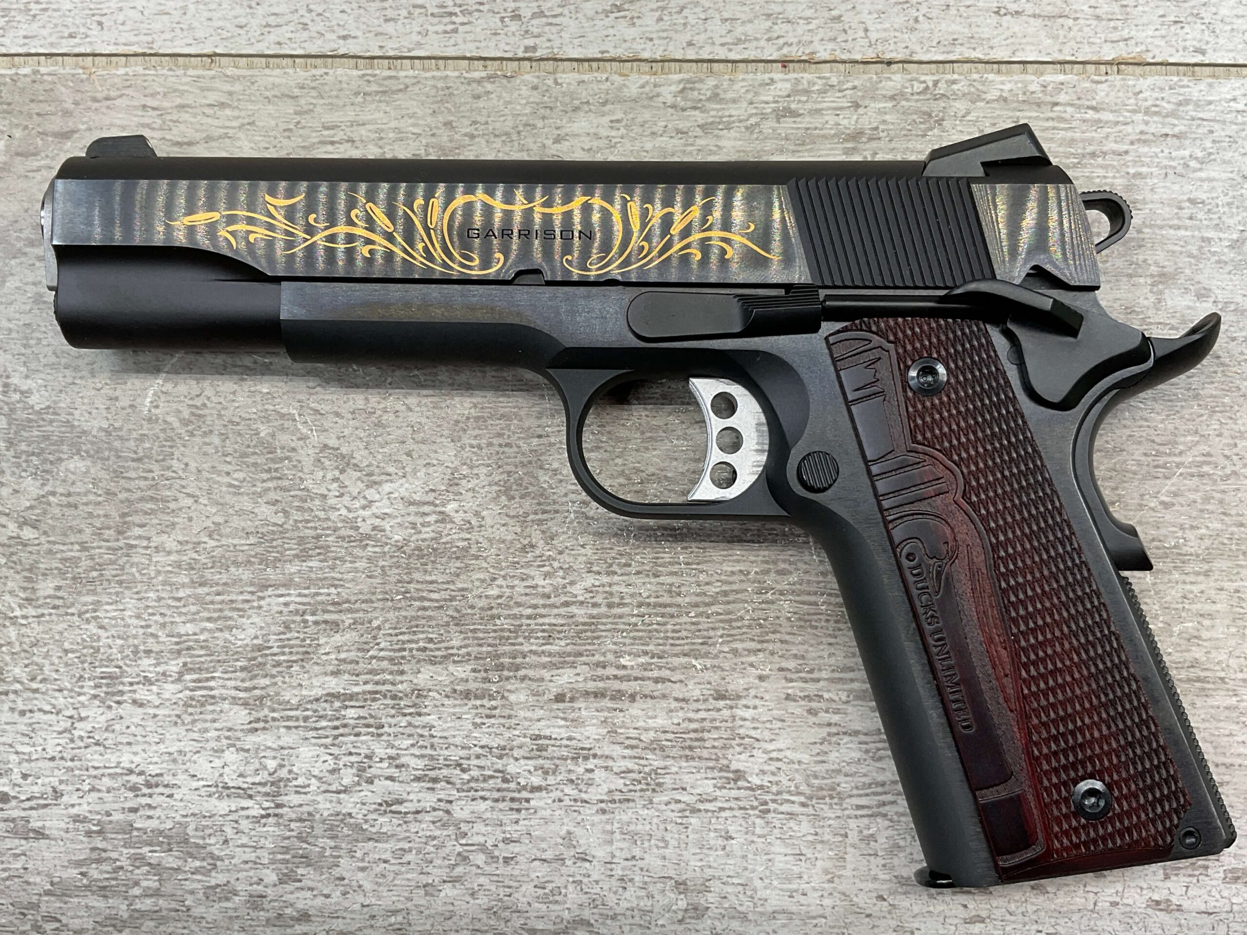 SPRINGFIELD ARMORY 1911 GARRISON DUCKS UNLIMITED .45 AUTO PISTOL, NEVER FIRED, #782552, COMES WITH LOCK, SOFT CASE, ONE MAG, AND MANUALS. HAS BEAUTIFUL MARKINGS ON GUN INCLUDING DUCK, DUCKS UNLIMITED WOODEN & ENGRAVED GRIPS, LEFT SLIDE MARKED “GARRISON”, RIGHT SLIDE MARKED “SPRINGFIELD ARMORY” W/ LOGO, UNDER RIGHT SLIDE MARKED “SI GENESEO IL. USA / NM 782552”, ONE MAG MARKED “.45 ACP”, TRULY A VERY NEAT AND COLLECTIBLE FIND!
