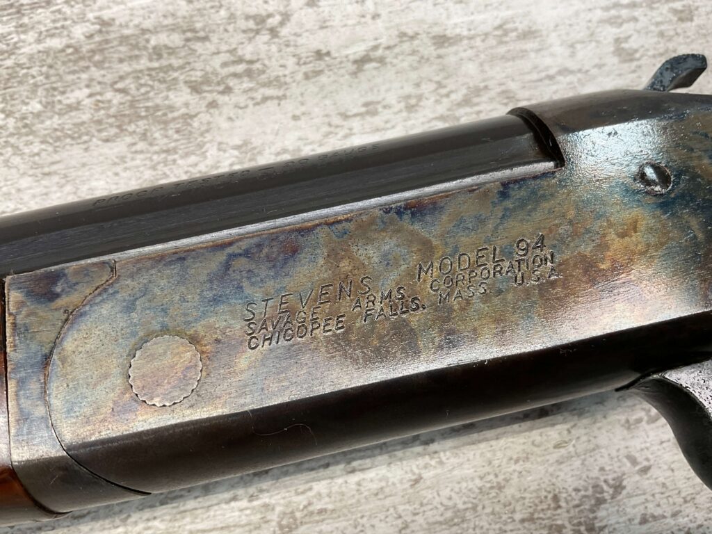 STEVENS ARMS 94 SINGLE SHOT SHOTGUN 20GA 2 3/4″ CHAMBER BREAK ACTION, #NSN, MANUFACTURED BETWEEN 1920 AND 1960, 28″ RND BARREL, VG BRIGHT BORE, VG BLUE FINISH W/LIGHT HIGH EDGE WEAR, RECEIVER & ACTION COLOR CASE HARDENED, FRONT BEAD SIGHT, STOCK & FOREARM ARE IN GOOD CONDITION, MANUFACTURED OUT OF TENITE, A COMPOSITE PLASTIC, MINOR SCRATCHES & SCUFFS IN THE TENITE FROM NORMAL WEAR AND USE, LEFT SIDE OF THE RECEIVER IS STAMPED “STEVENS MODEL 94” OVER “SAVAGE ARMS CORPORATION” OVER “CHICOPEE FALLS, MASS USA”