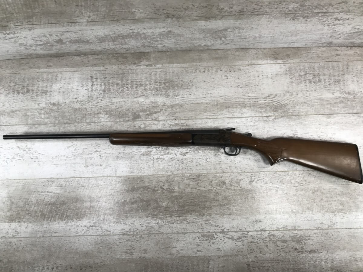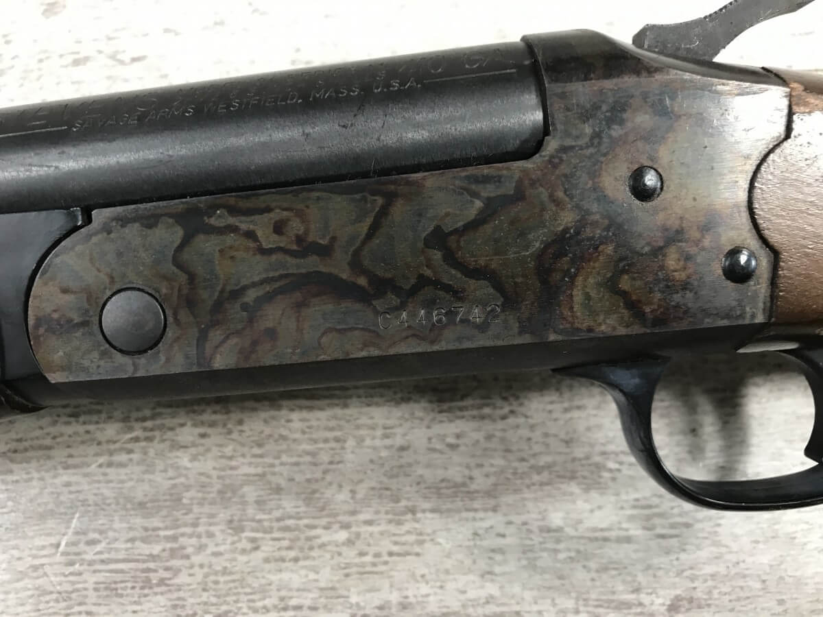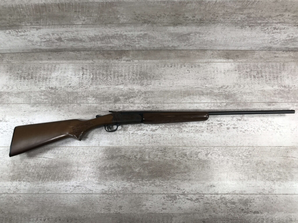 STEVENS MODEL 94C 410GA SINGLE SHOT BREAKOPEN SHOTGUN #C446742, 1977 MFR, EXPOSED HAMMER, GOOD ORIGINAL WOOD W/SOME NICKS AND SCRATCHES, EXC BLUE, CASE COLOR HARDENED RECEIVER, GOOD BORE, 26″ BBL, 3″ CHAMBER, 90% OVERALL
