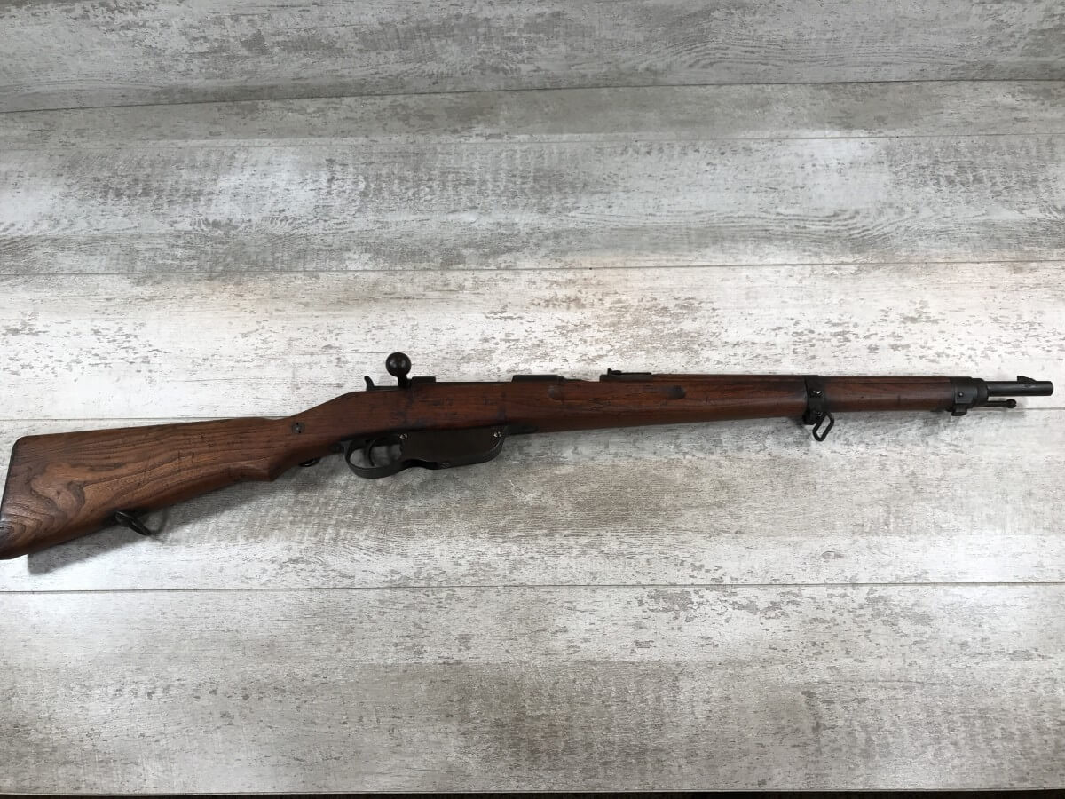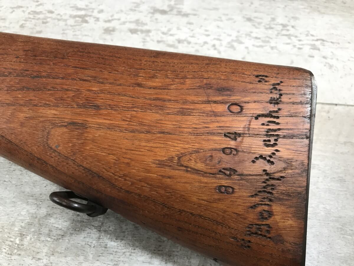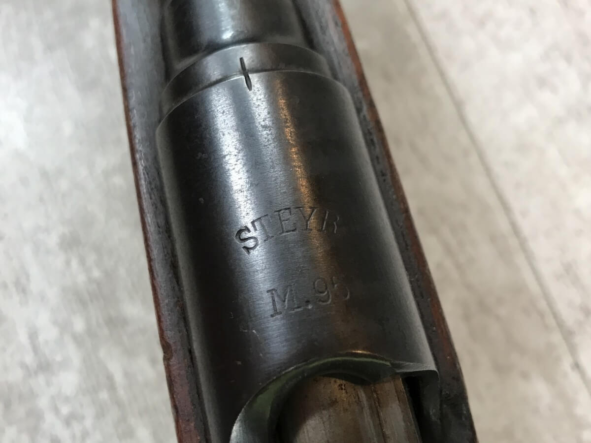 SKU#431 STEYR-MANNLICHER M95 BOLT ACTION STRAIGHT PULL CARBINE #84940, 8X56R, 20″ BBL, EXC BRIGHT BORE W/GOOD RIFLING, ALL MATCHING, “WN IMPERIAL EAGLE 18” ON BARREL, GREAT MATCHING STOCK W/TRENCH ART NEAR BUTT, METAL BUTTPLATE, SOME RUST ON METAL PARTS, NEEDS A GOOD CLEANING, 90+% OVERALL