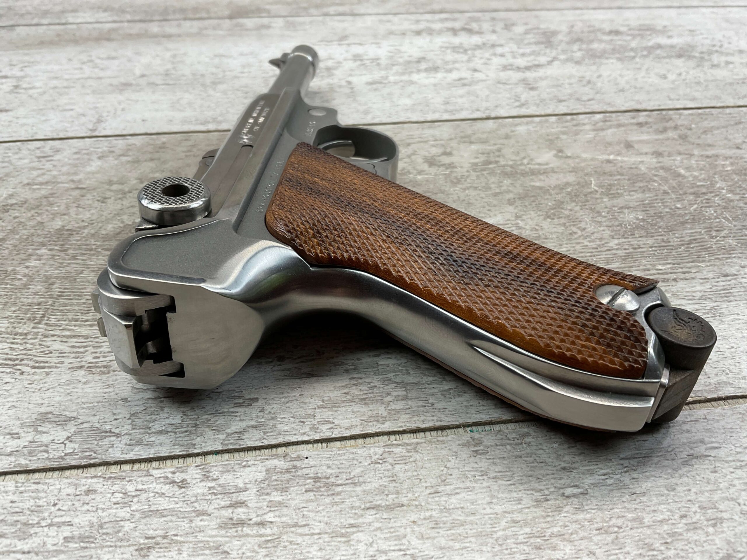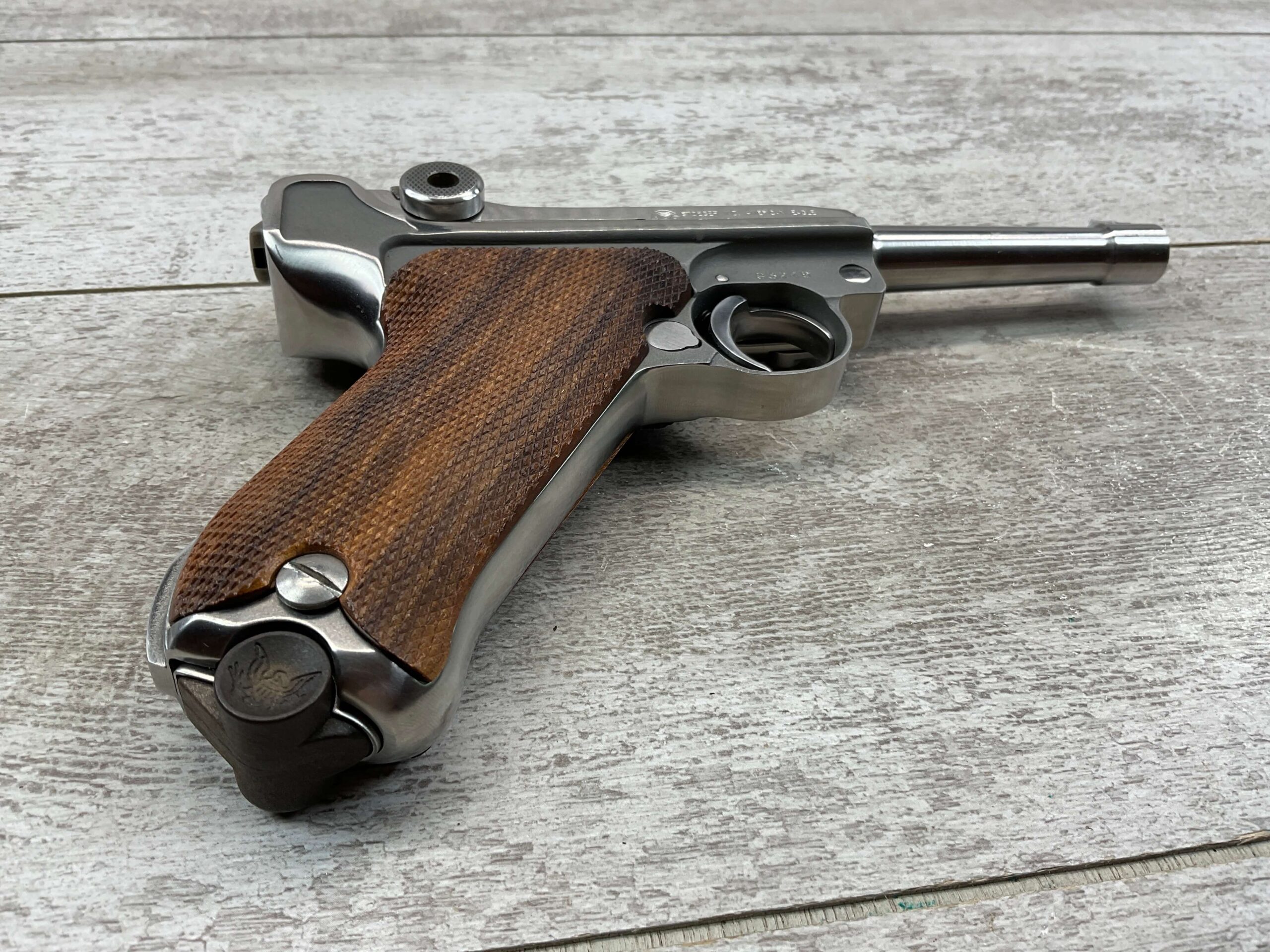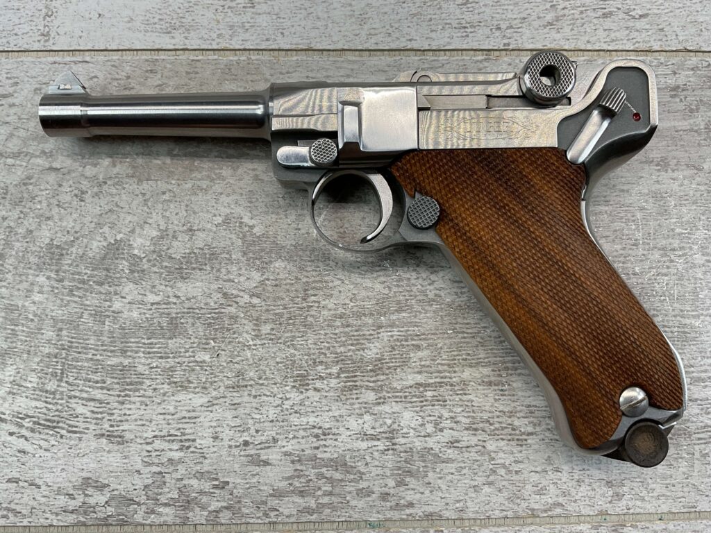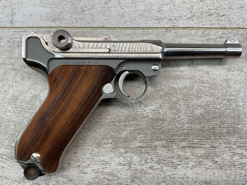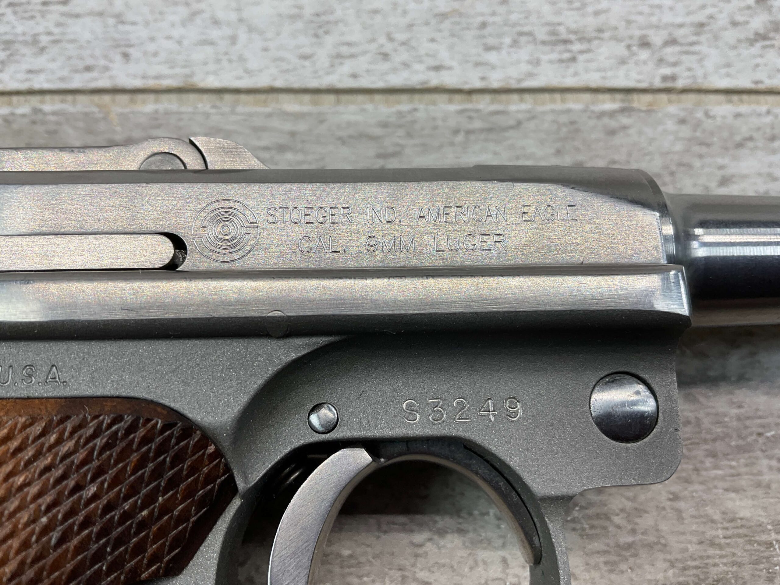 STOEGER AMERICAN EAGLE STAINLESS LUGER P08 9MM PISTOL #S3249, 4″ BBL, 11 ROUND MAG, AMERICAN EAGLE ON MAG AND OVER CHAMBER, 1994 APPROX MFR, WALNUT CHECKERED GRIPS, APPEARS UNFIRED, NEAR PERFECT CONDITION, 99+% OVERALL