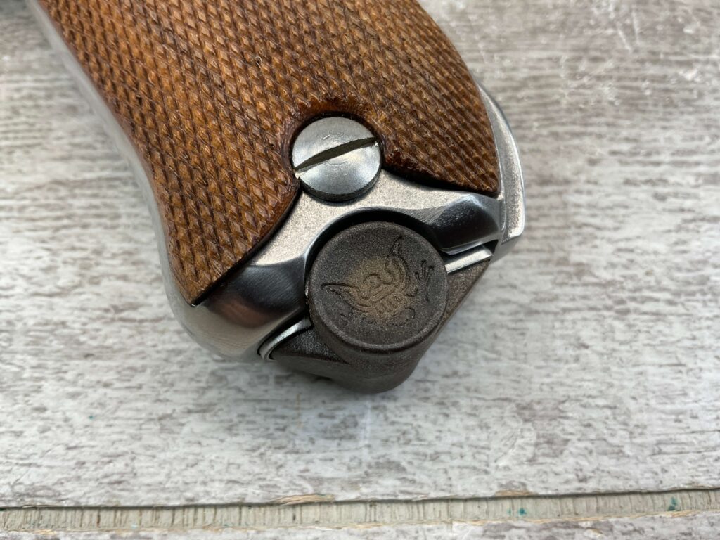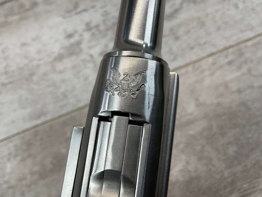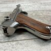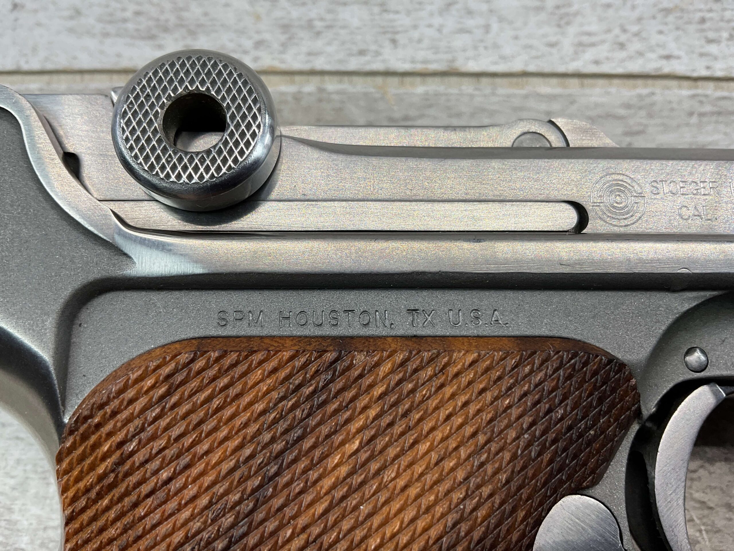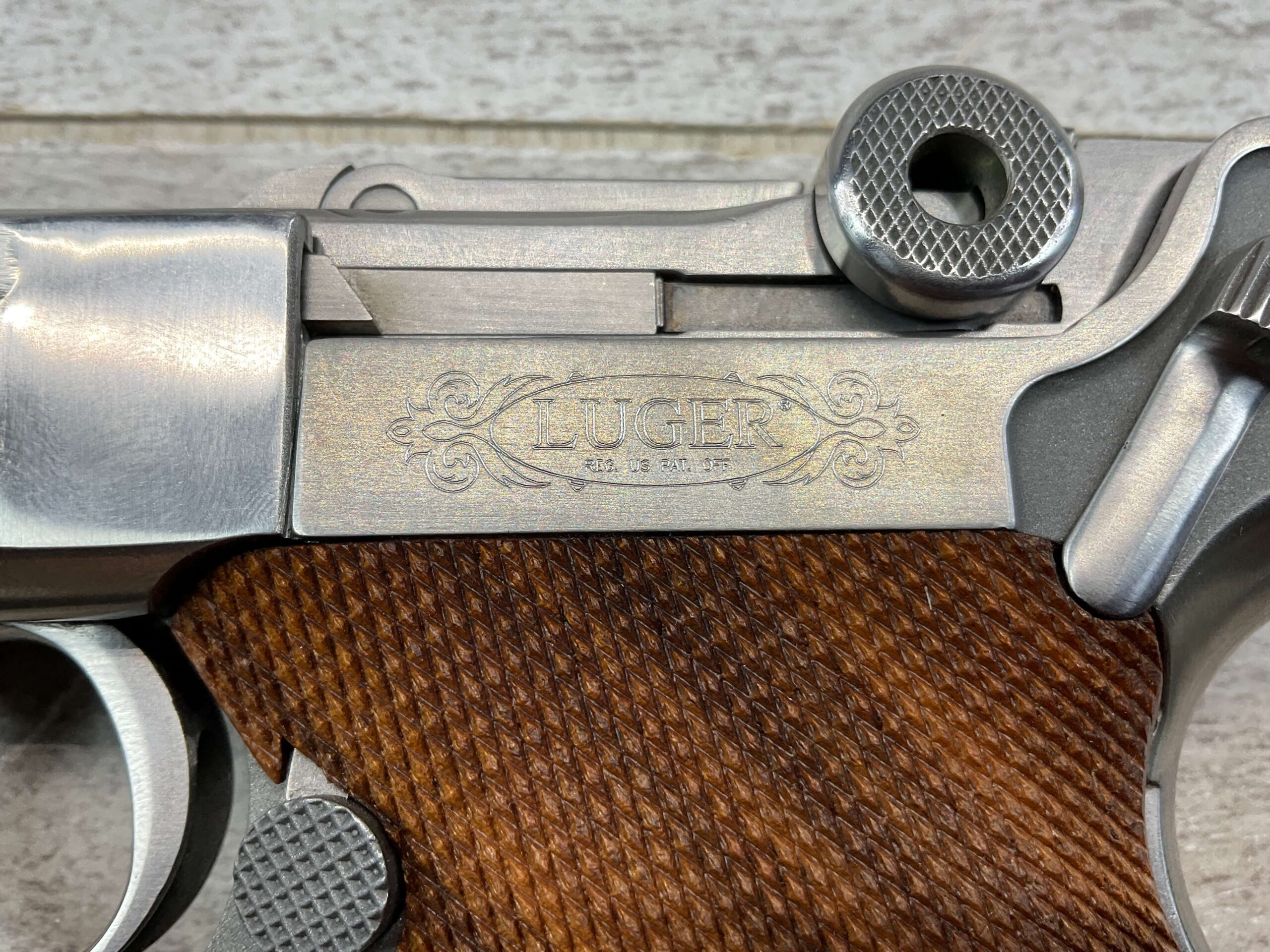 STOEGER AMERICAN EAGLE STAINLESS LUGER P08 9MM PISTOL #S3249, 4″ BBL, 11 ROUND MAG, AMERICAN EAGLE ON MAG AND OVER CHAMBER, 1994 APPROX MFR, WALNUT CHECKERED GRIPS, APPEARS UNFIRED, NEAR PERFECT CONDITION, 99+% OVERALL