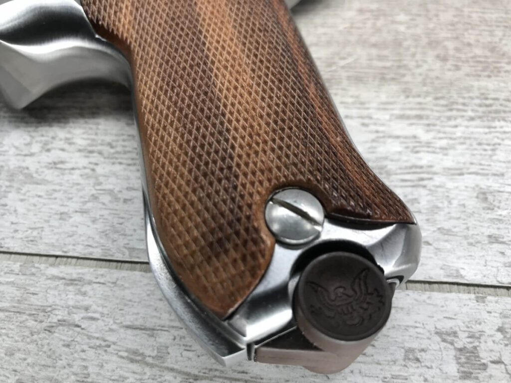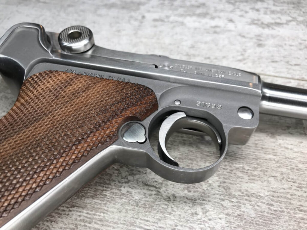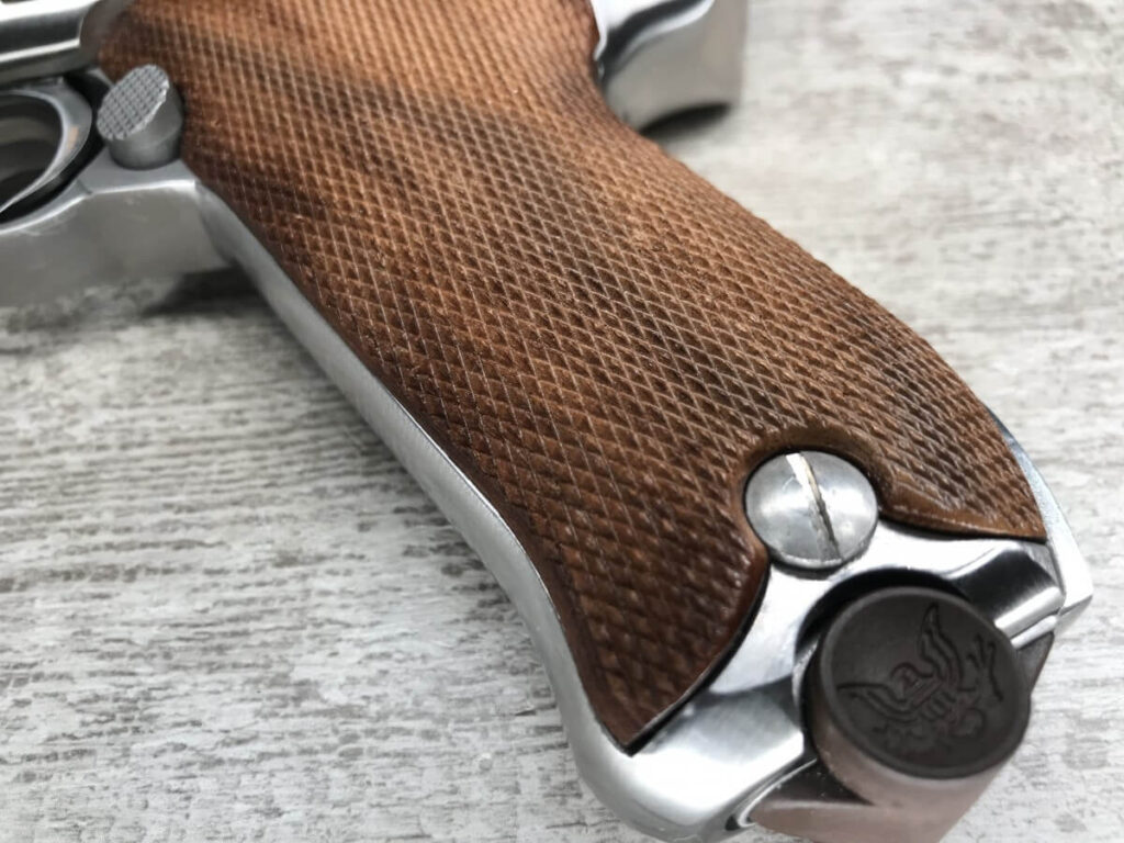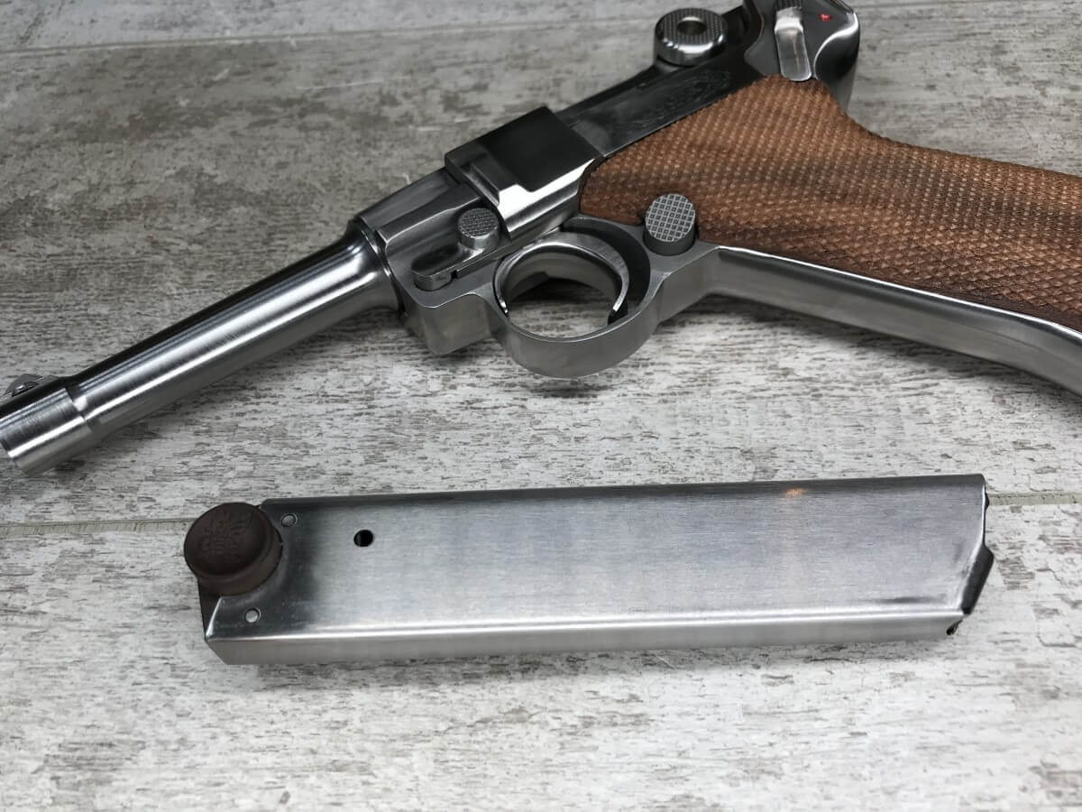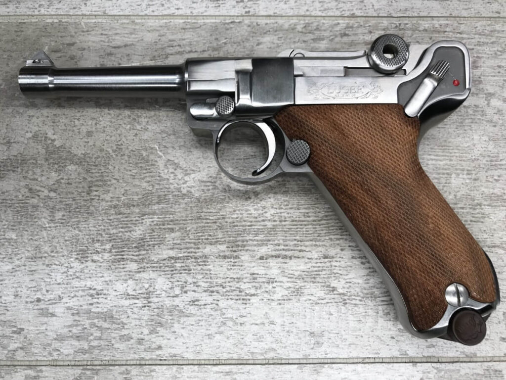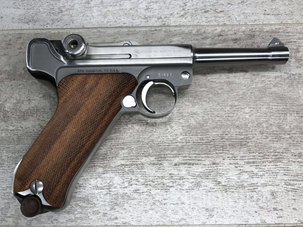 STOEGER AMERICAN EAGLE STAINLESS LUGER P08 9MM PISTOL #S1698, 4″ BBL, 11 ROUND MAG, AMERICAN EAGLE ON MAG AND OVER CHAMBER, 1994 APPROX MFR, WALNUT CHECKERED GRIPS, APPEARS UNFIRED, NEAR PERFECT CONDITION, 99+% OVERALL