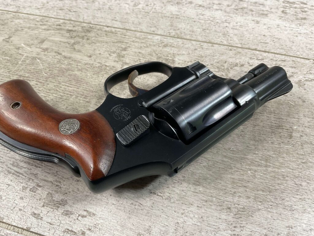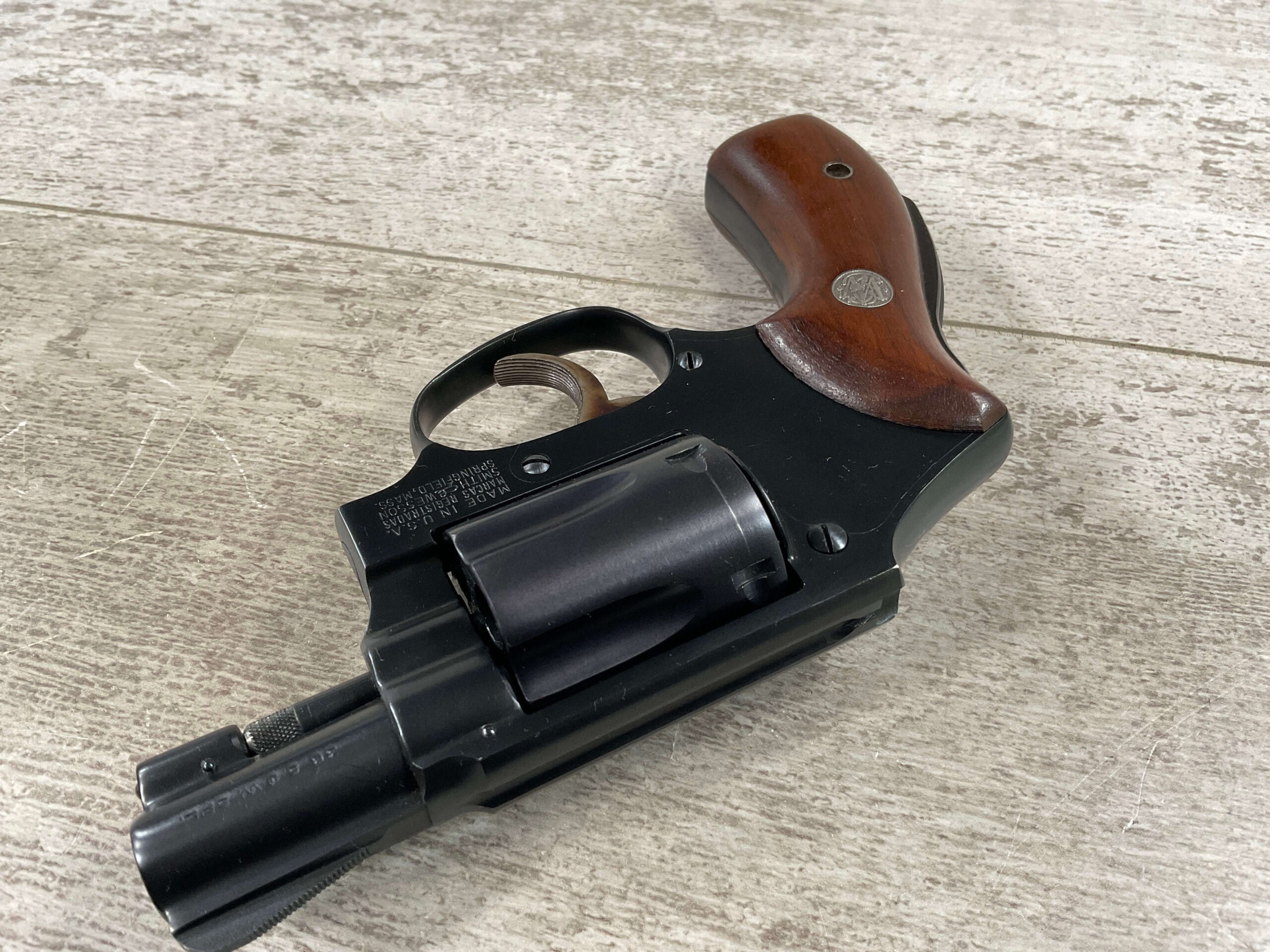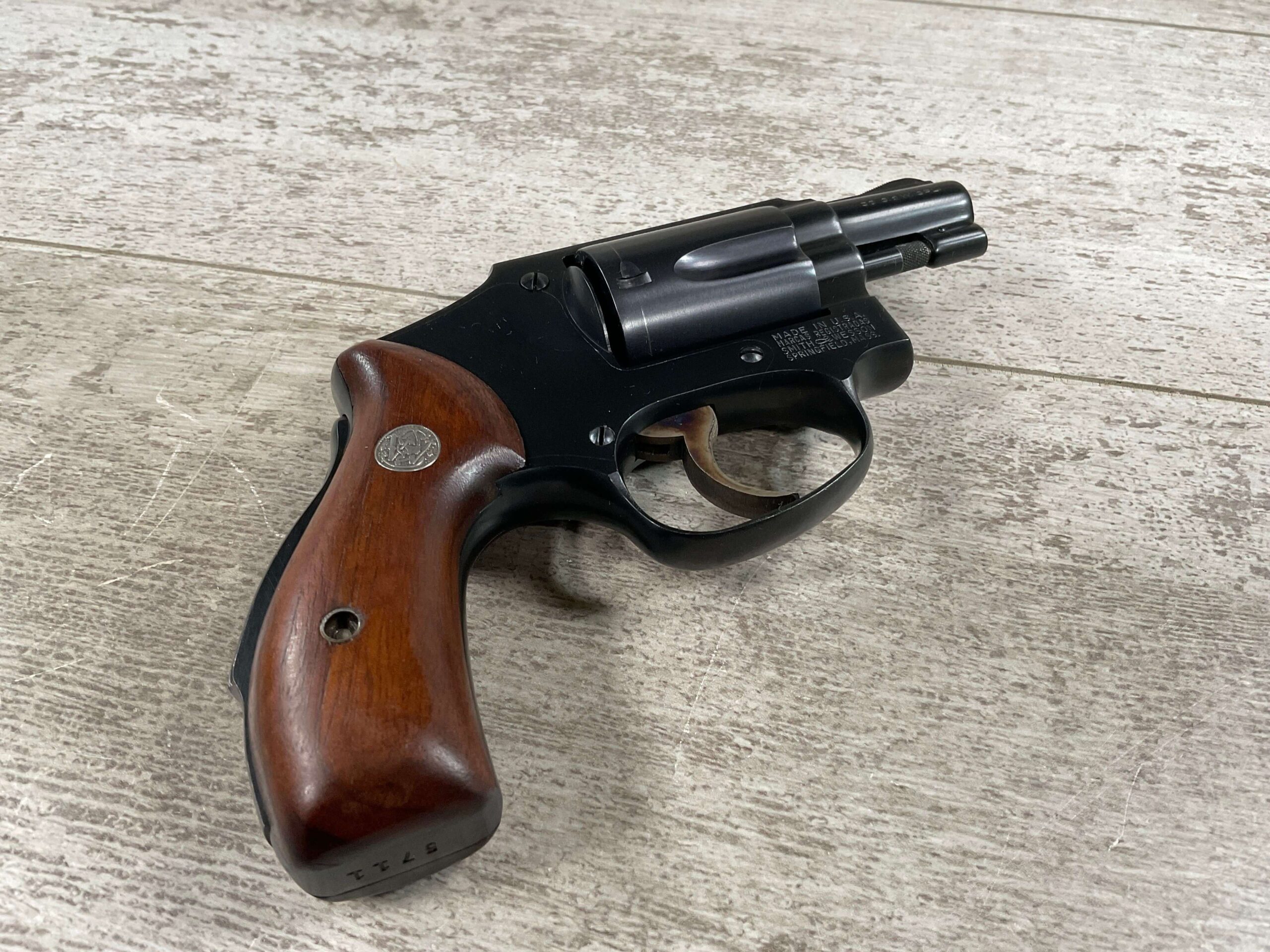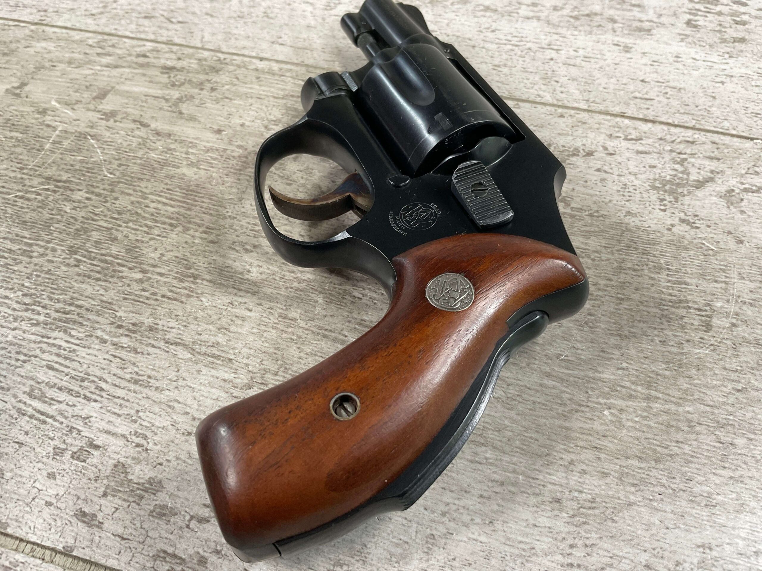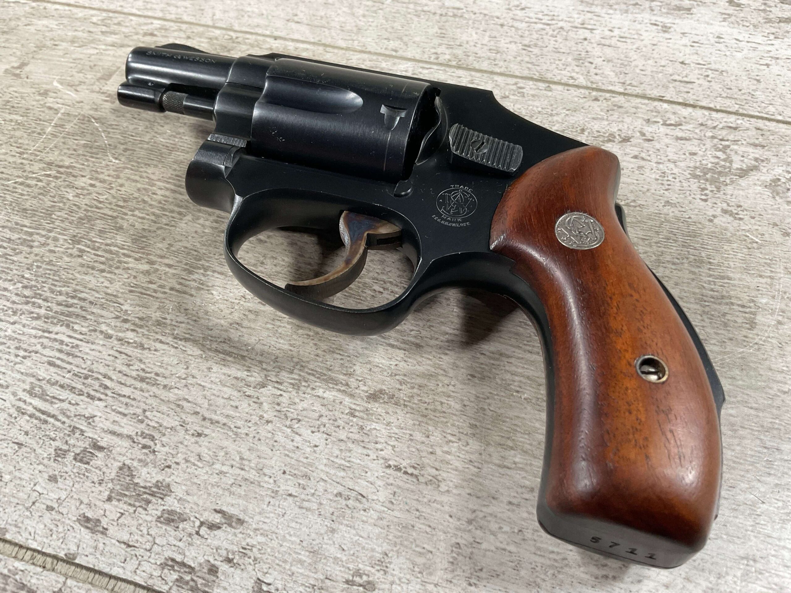 S&W PRE-MODEL 40 .38 SPL. CENTENNIAL HAMMERLESS REVOLVER #5711, 2″ BARREL, GRIP SAFETY, ORIGINAL BLUE FINISH, EXC MATCHING S&W SILVER MEDLLION MAGNA GRIPS, BARREL/CYLINDER/FRAME & GRIPS ALL MATCH!! LIGHT CYLINDER LINE, 98%