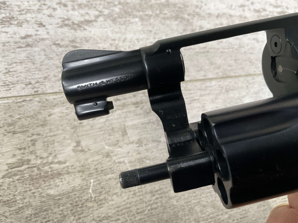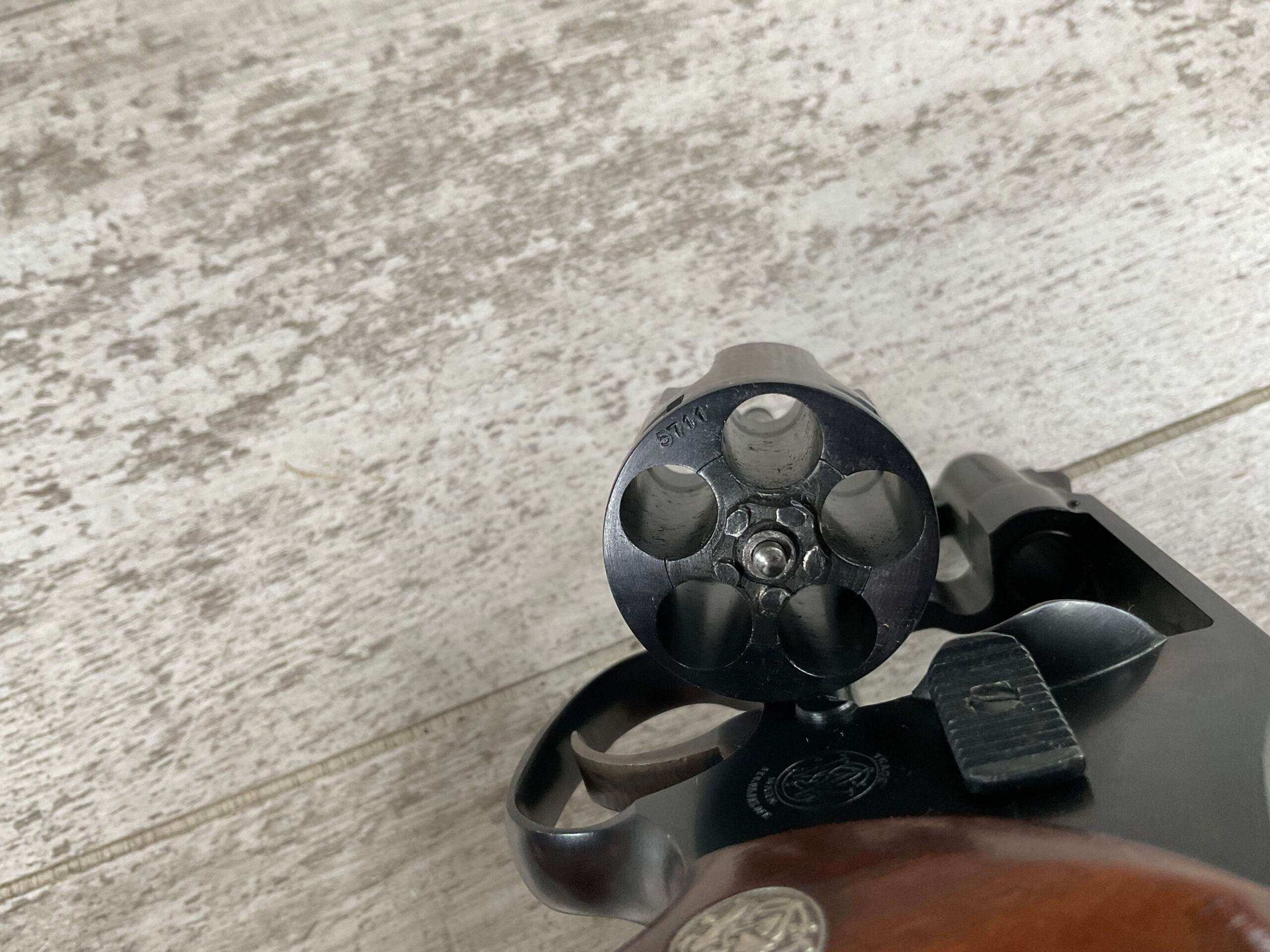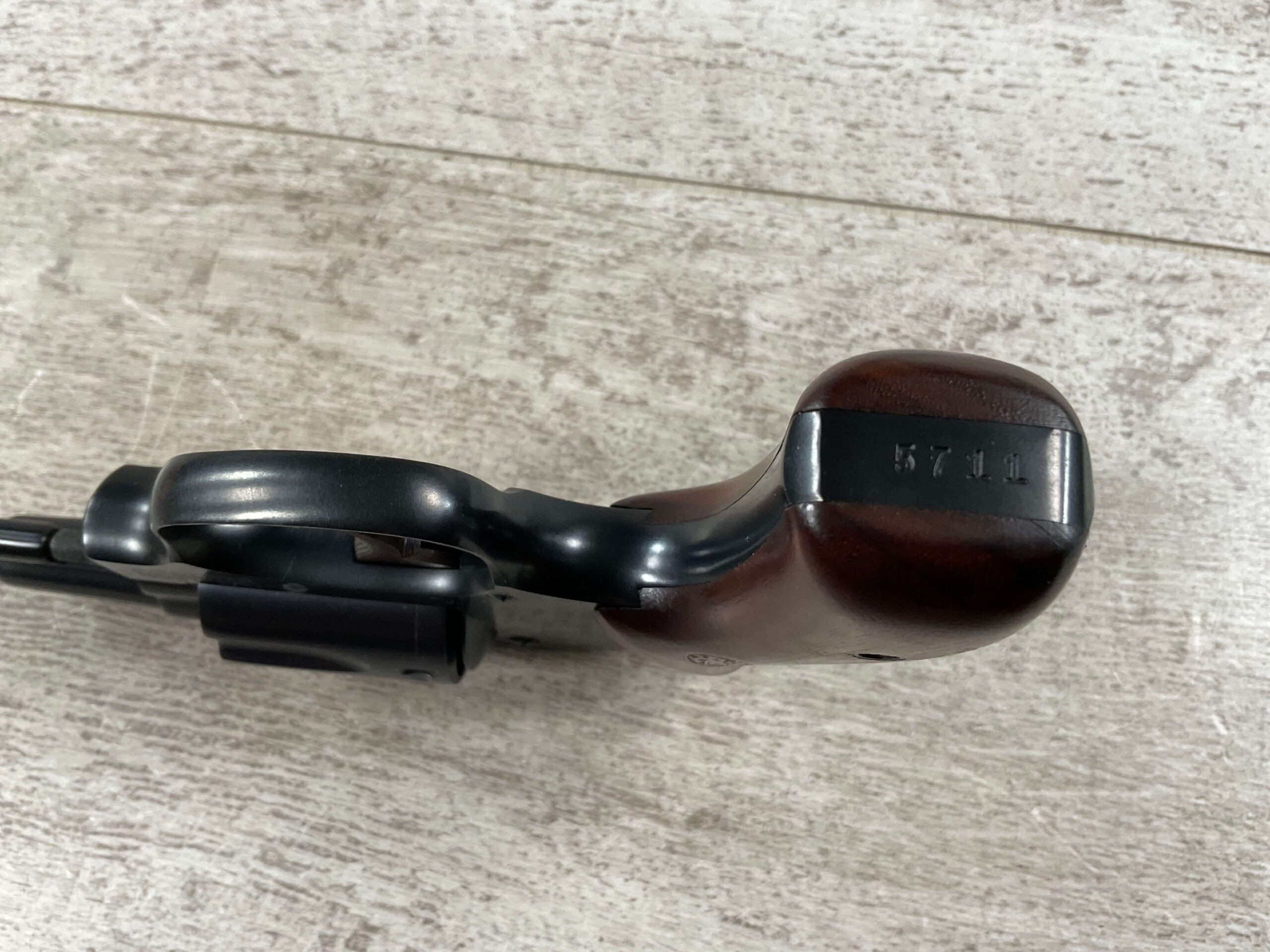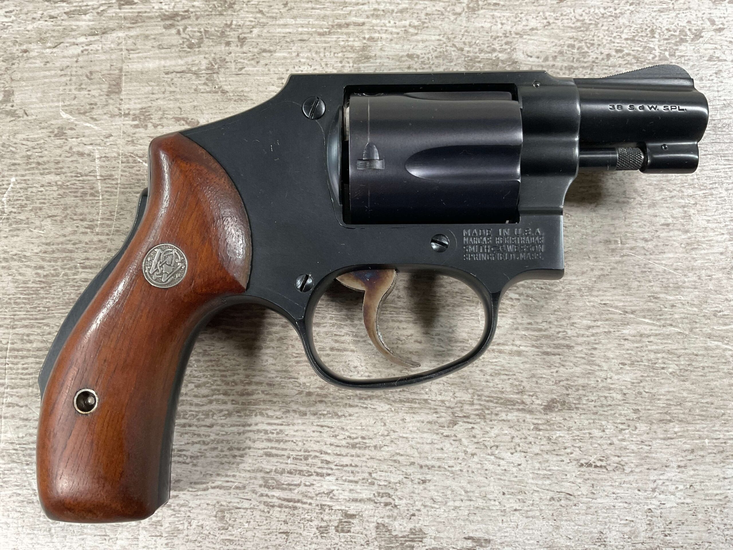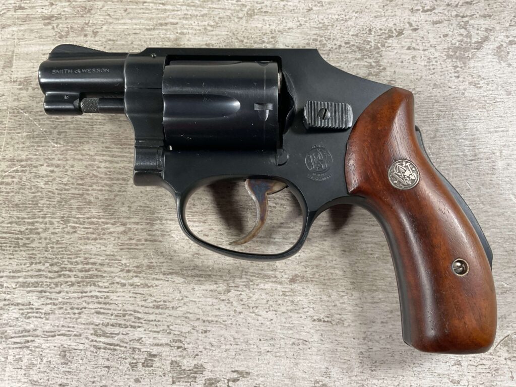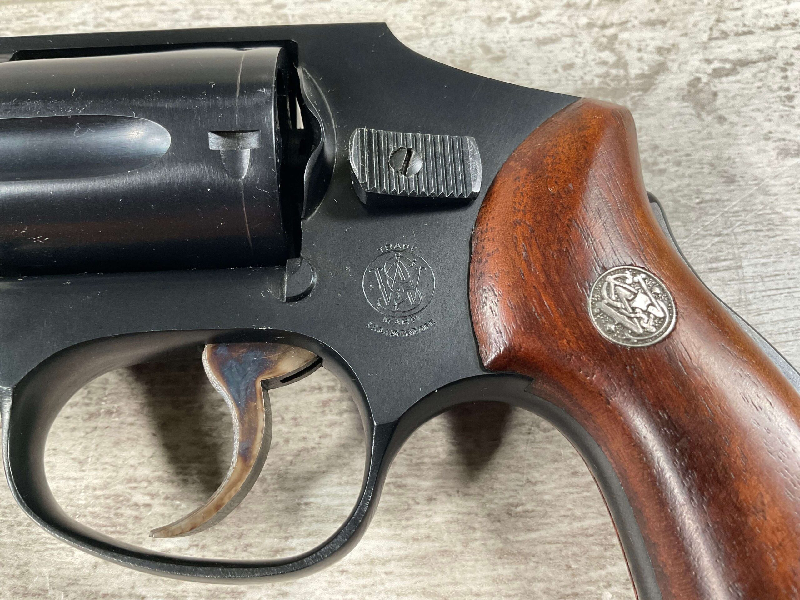 S&W PRE-MODEL 40 .38 SPL. CENTENNIAL HAMMERLESS REVOLVER #5711, 2″ BARREL, GRIP SAFETY, ORIGINAL BLUE FINISH, EXC MATCHING S&W SILVER MEDLLION MAGNA GRIPS, BARREL/CYLINDER/FRAME & GRIPS ALL MATCH!! LIGHT CYLINDER LINE, 98%