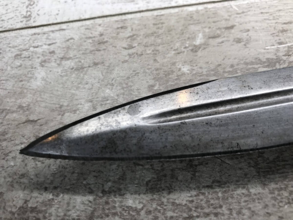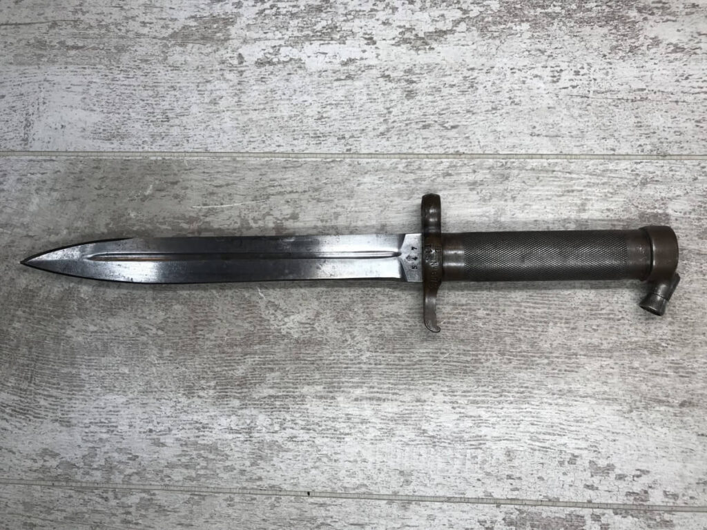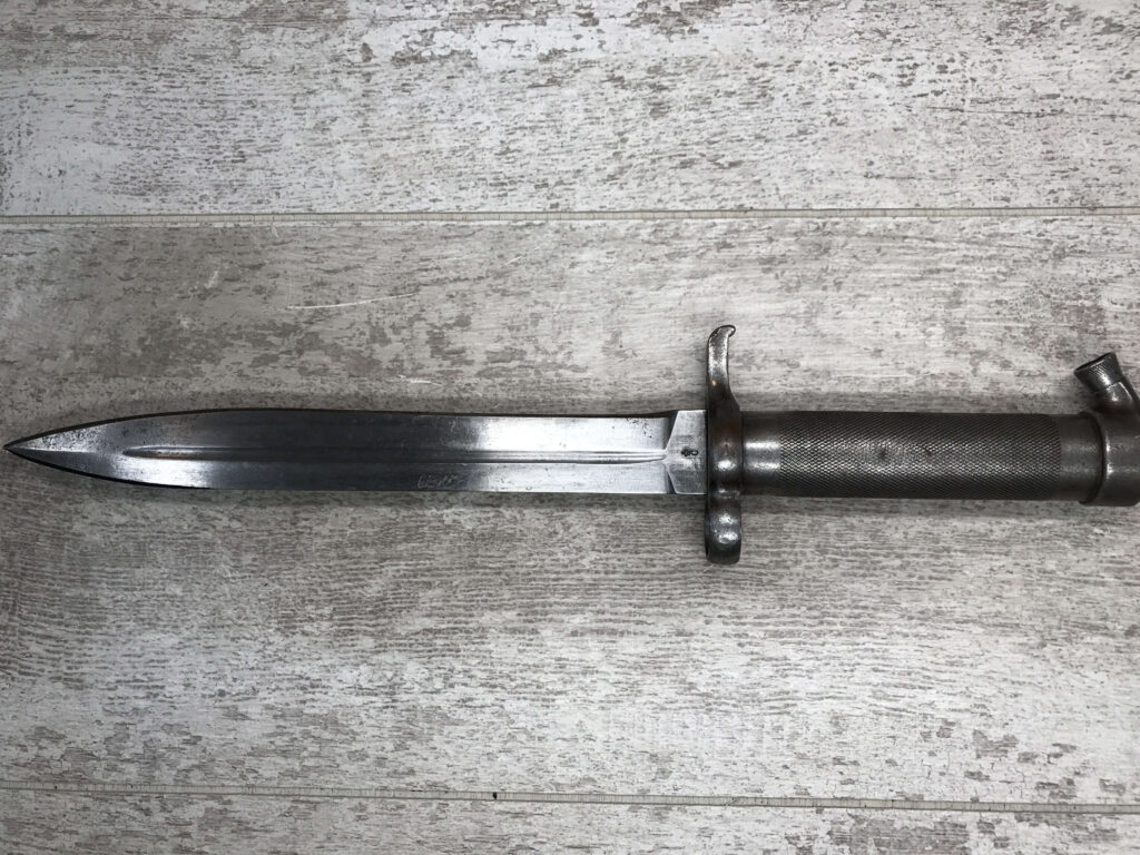SWEDISH MAUSER M1896 BAYONET #547, MARKED “ID/I15 No. 672” (INFANTRY DIVISION/INFANTRY REGIMAN 15), “CROWN/C (CARL GUSTAF FACTORY)” ON OTHER SIDE, EXC OVERALL CONDITION, DOUBLE EDGED, 8 1/4″ BLADE, 13″ OVERALL, NO SCABBARD INCLUDED