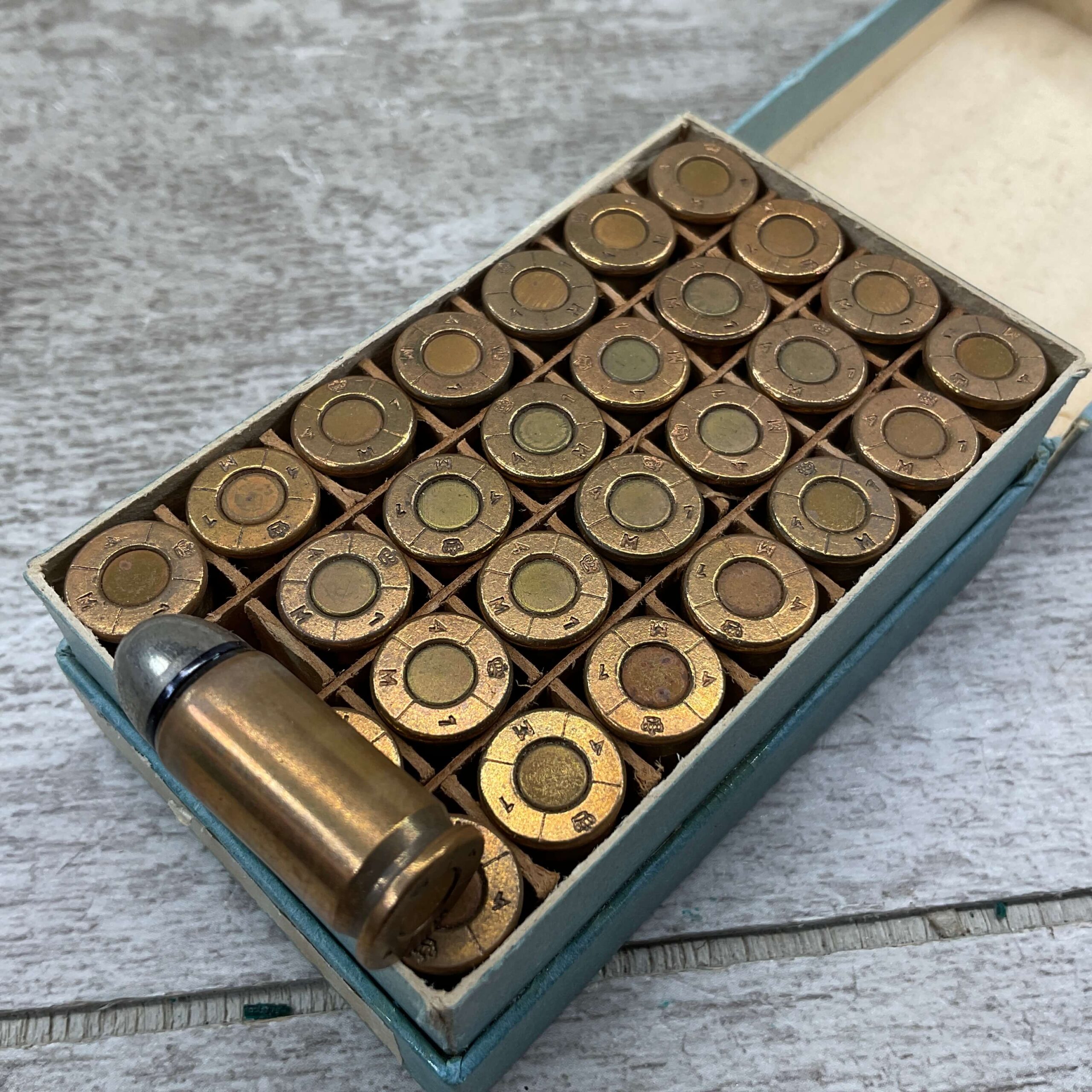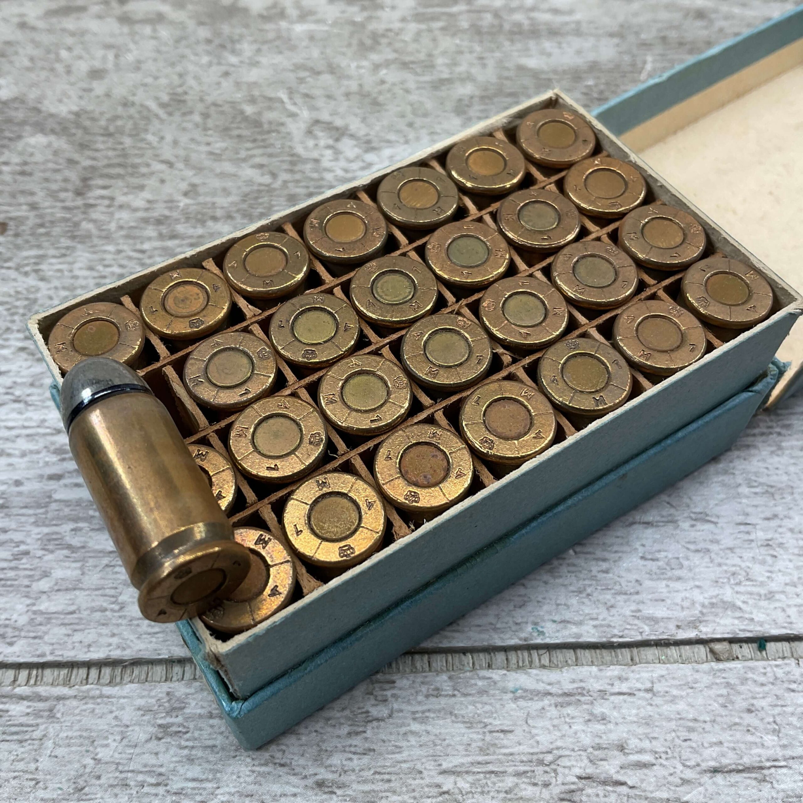 SWEDISH MILITARY 9MM BROWNING LONG AMMUNITION 9X20MM, WW2, MADE FOR BROWNING MODEL 1907 PISTOL ADOPTED BY SWEDEN, ORIGINAL CARTRIDGE FOR SWEDISH M/07, SURPLUS M/07 PISTOLS WHERE MODIFIED TO .380 ACP. IF YOU HAVE AN ORIGINAL M/07 YOU NEED THIS AMMO. EXC. CONDITION, 28 PER BOX, FULL BOX, MANY AVAILABLE.