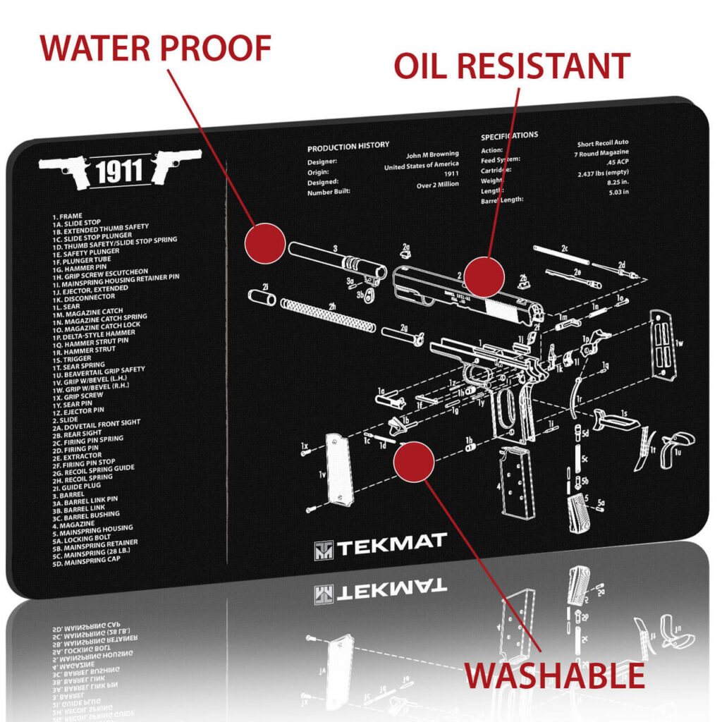 - QUALITY GUN CLEANING MAT – This 1911 gun cleaning mat by TekMat is made to exacting standards. This begins with the water-resistant, scratch proof, fade and oil resistant dye-sublimation printing. This heat transferred printing impregnates the ink into the fibers for a lifetime of durability. TekMat does not silkscreen their designs like a lot of other inferior gun cleaning mat manufacturers.