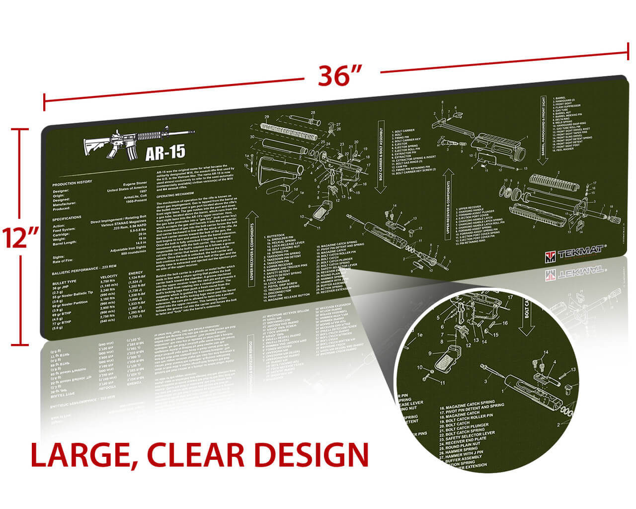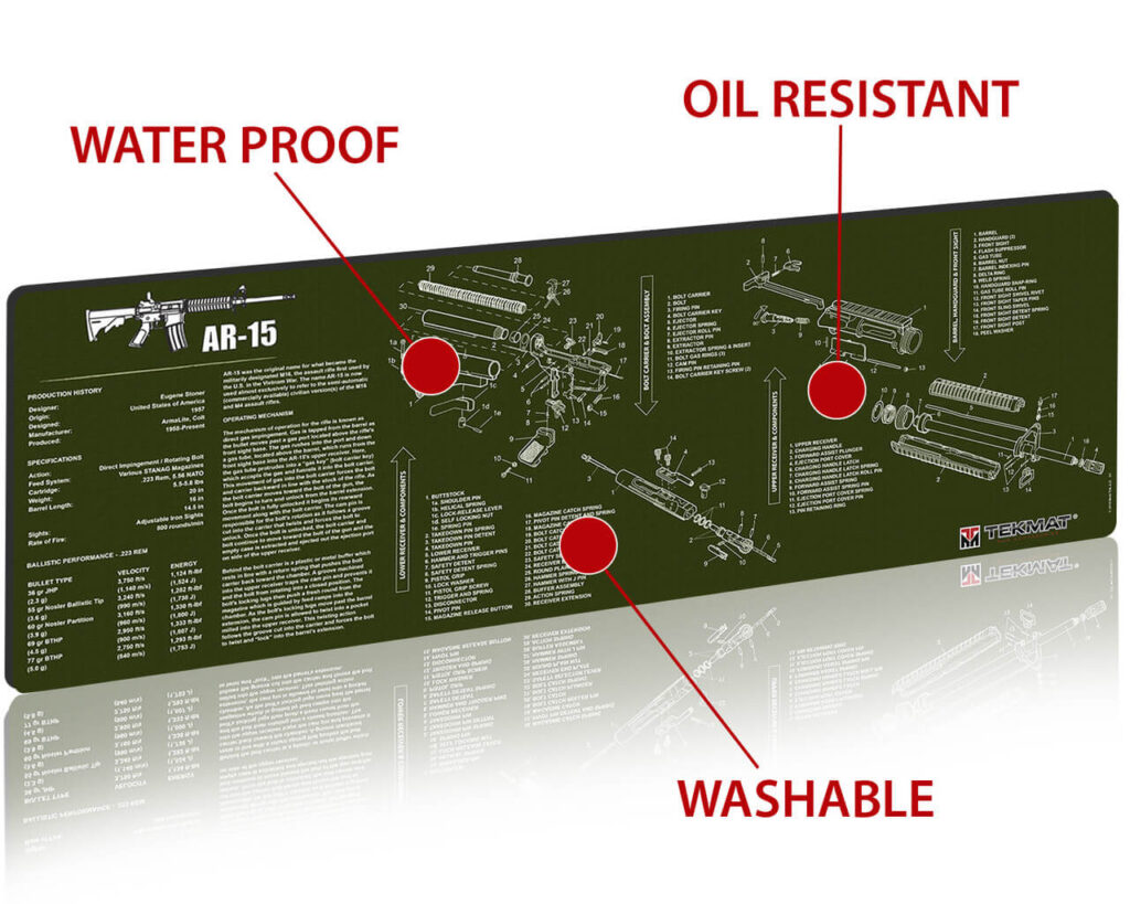 - QUALITY GUN CLEANING MAT – This AR-15 gun cleaning mat by TekMat is made to exacting standards. This begins with the water-resistant, scratch proof, fade and oil resistant dye-sublimation printing. This heat transferred printing impregnates the ink into the fibers for a lifetime of durability. TekMat does not silkscreen their designs like a lot of other inferior gun cleaning mat manufacturers.