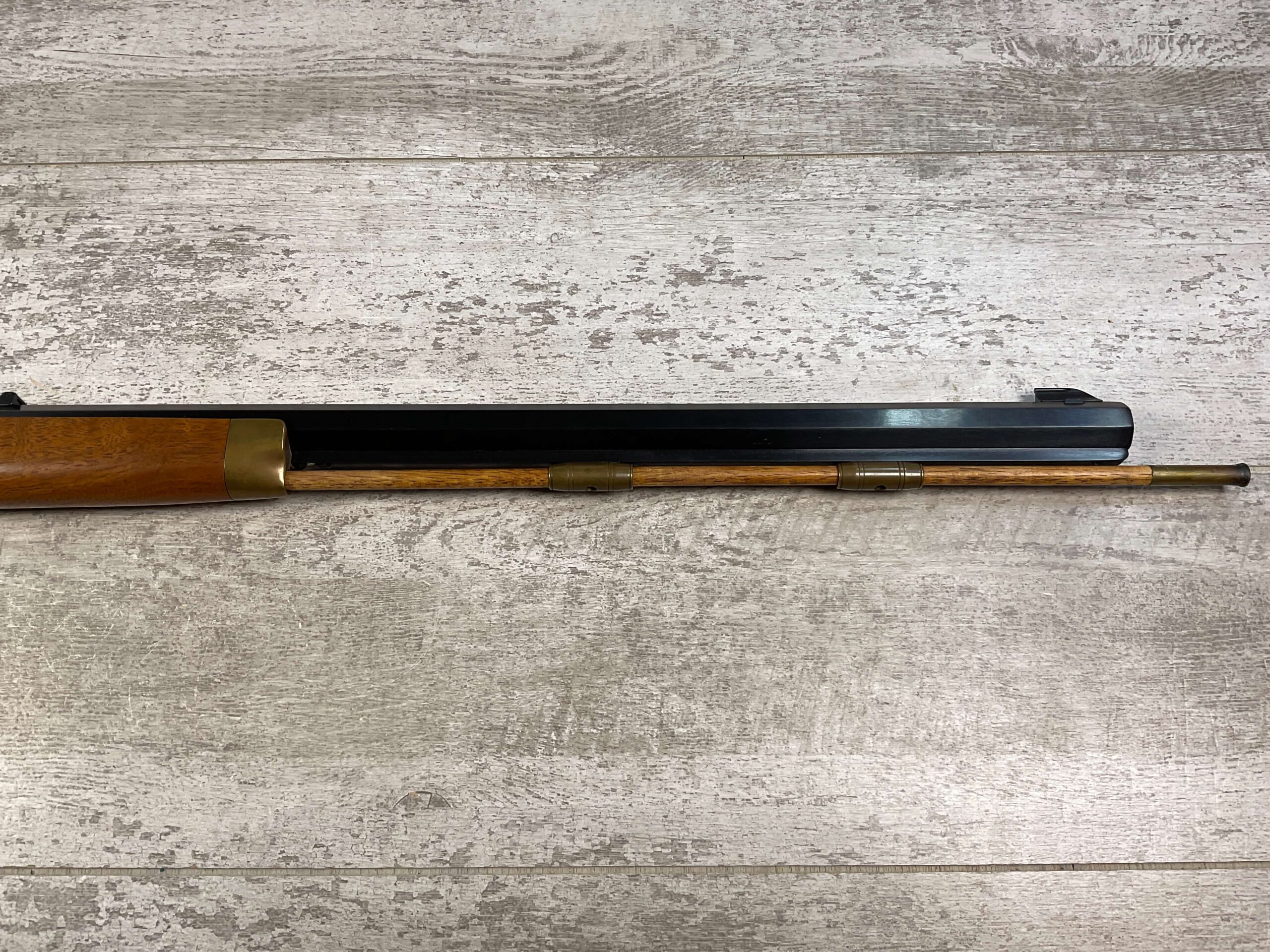 THOMPSON CENTER ARMS .45 CAL HAWKEN PERCUSSION RIFLE #23325, 28″ OCTAGON BARREL, EXC STOCK, EXC BORE & RIFLING, VG-EXC BLUE W/ AREA AROUND HAMMER FROSTING, RAMROD, SET TRIGGER, ADJ REAR SIGHT W/FIXED FRONT BLADE SIGHT, EXC BRASS, CASE COLOR HARDENED RECEIVER PLATE & HAMMER, EXC OVERALL, ANOTHER GREAT TC PERCUSSION RIFLE!!