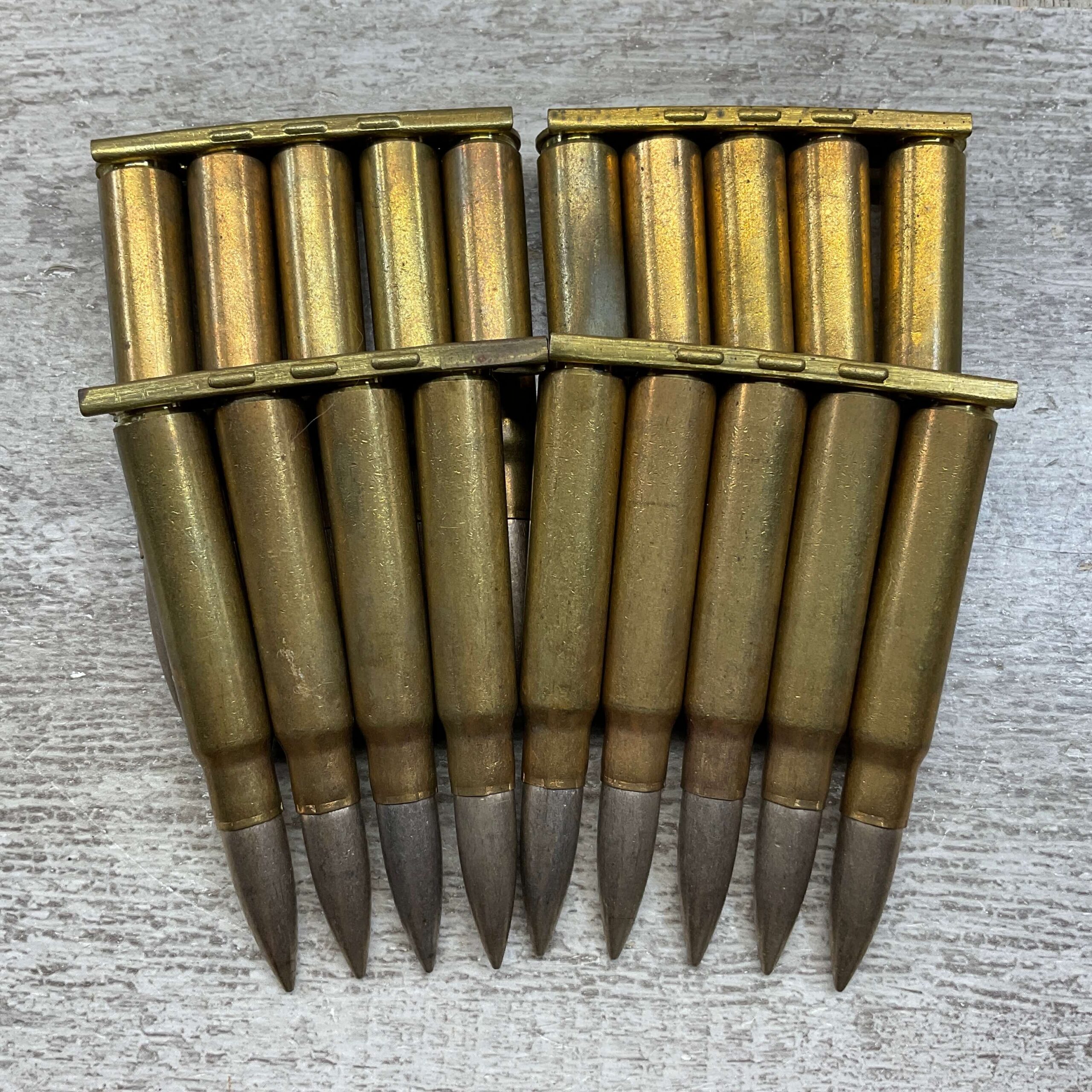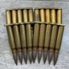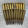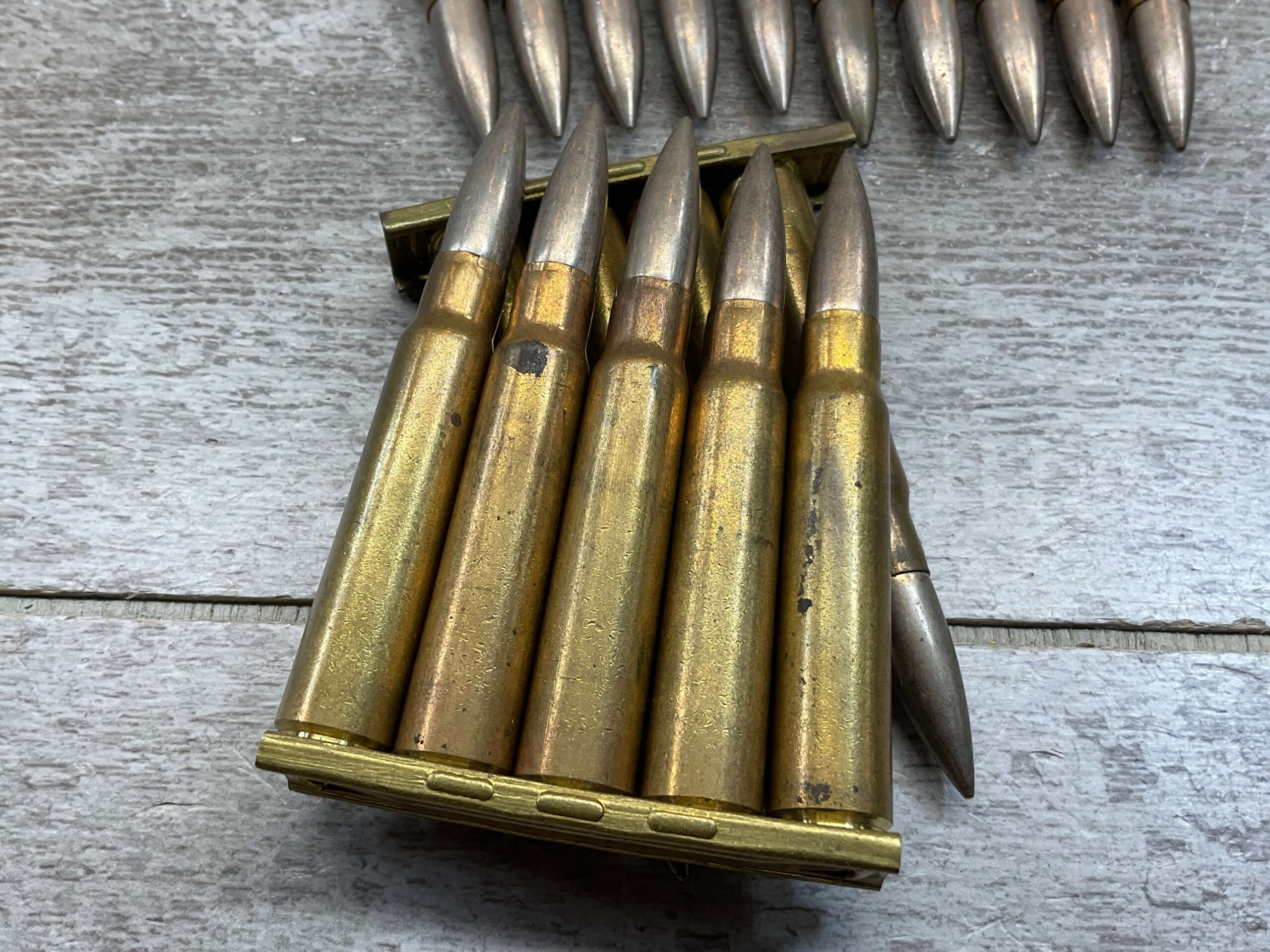 TURKISH 1945 8MM MAUSER (7.92X57) AMMO, QTY 19, VINTAGE, ON STRIPPER CLIP, HEADSTAMP “T (ISLAMIC CRESCENT MOON W/ STAR SYMBOL) C | 1945 | FS | 7.9”.