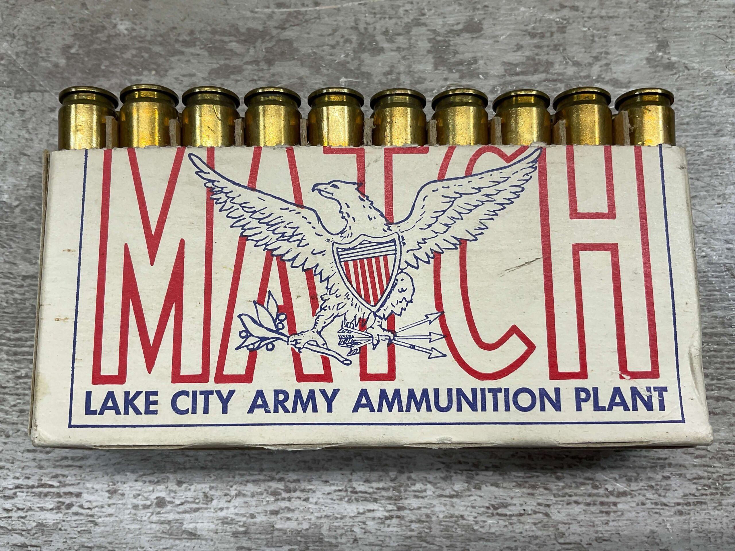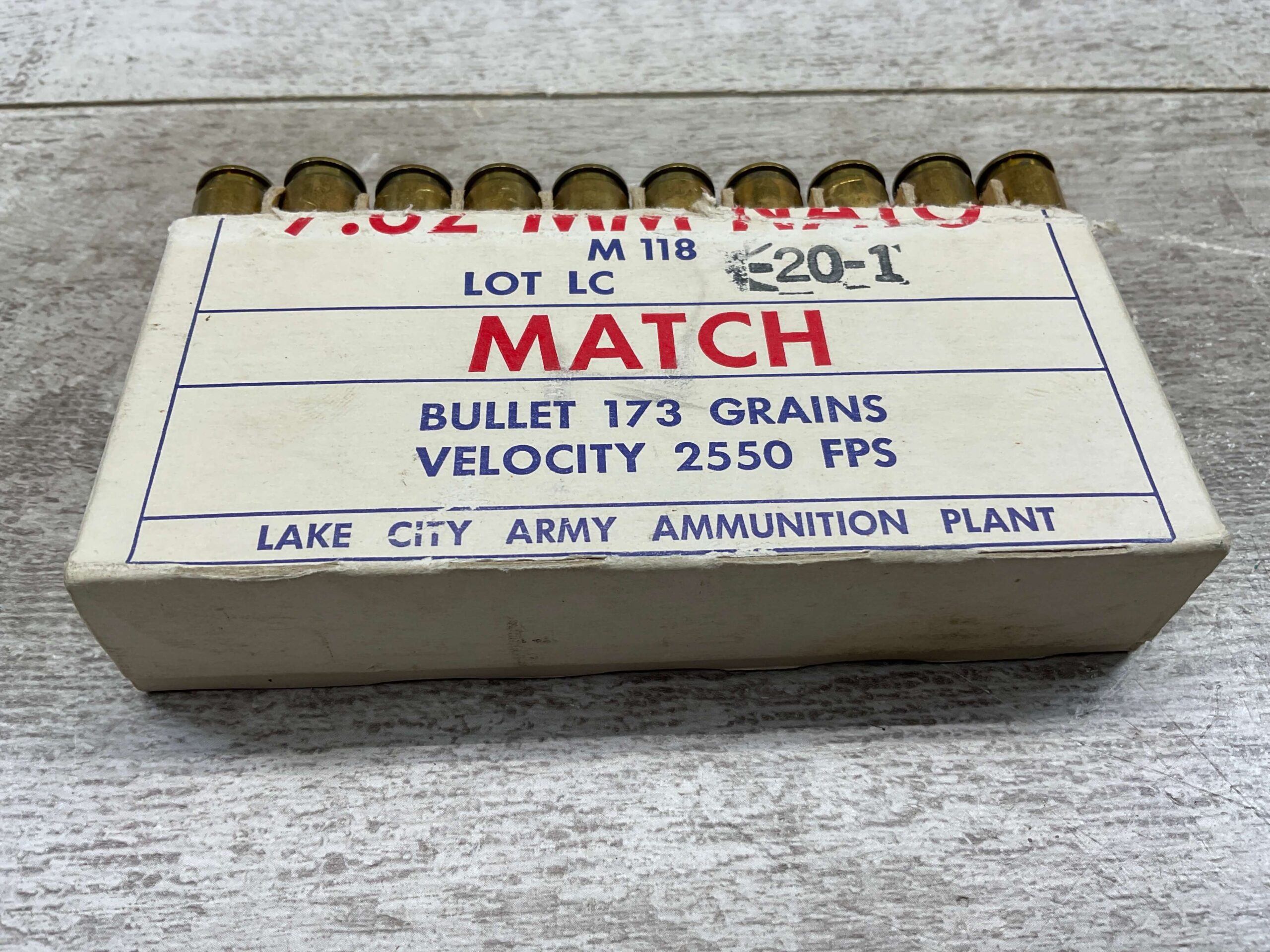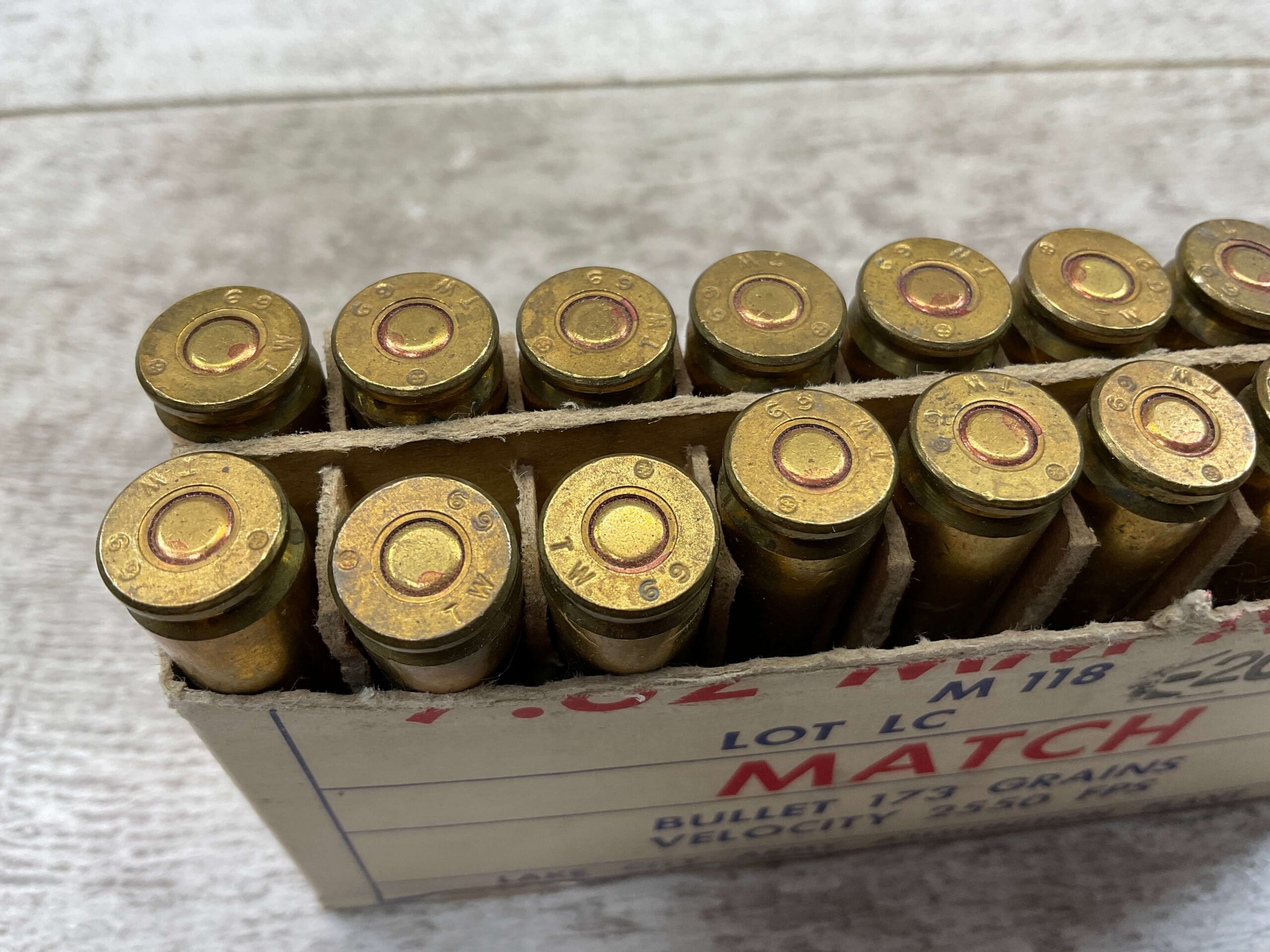 TWIN CITIES 1969 7.62 MATCH NATO AMMO, FULL BOX, VINTAGE, BOX IS MISMATCHED WITH AMMO AND IS LABELED “LAKE CITY ARMY AMMUNITION PLANT”, AMMO IS HEADSTAMPED “TW / 69 / NATO STAMP”, TOP OF BOX IS COMPLETELY MISSING.