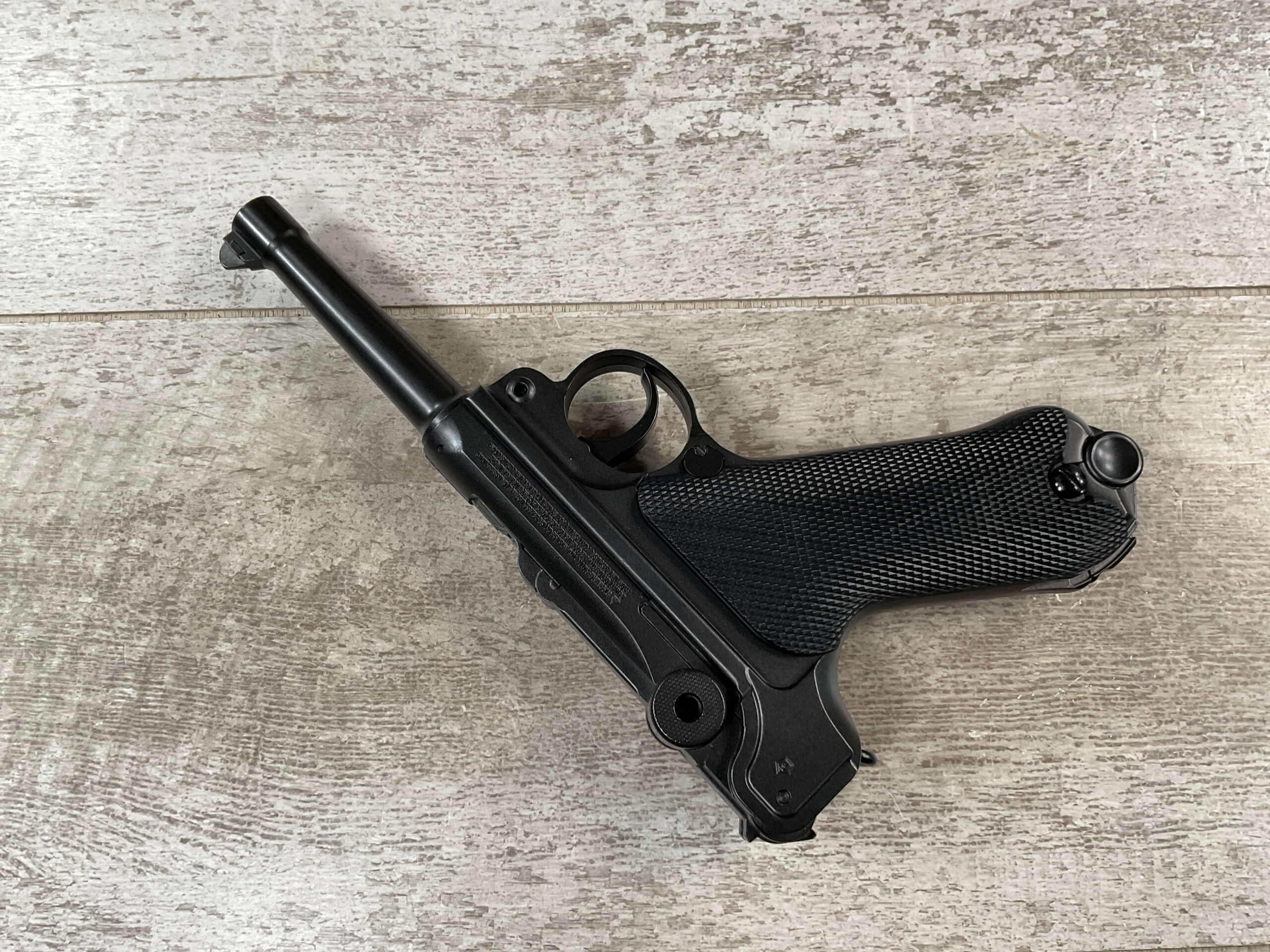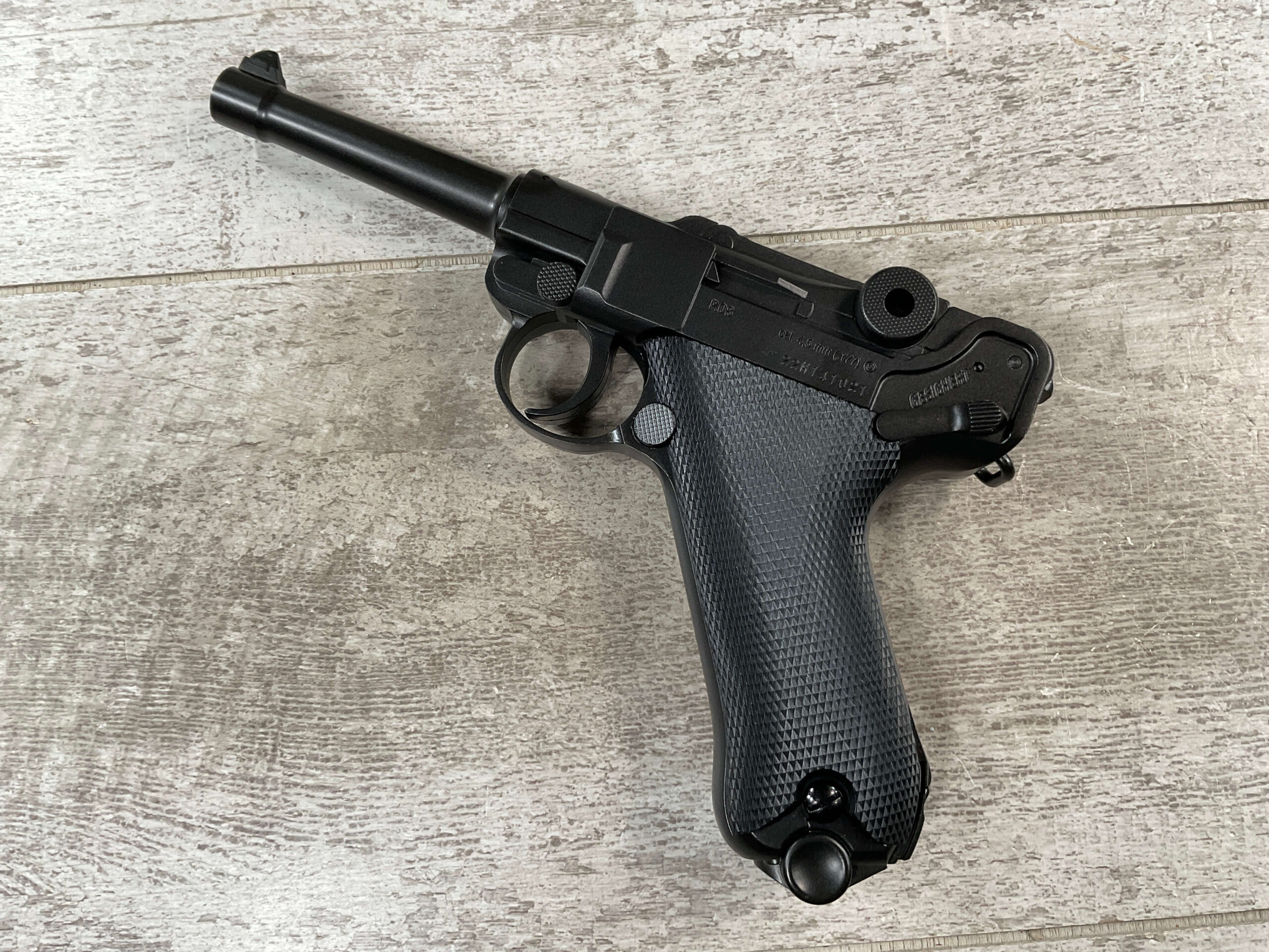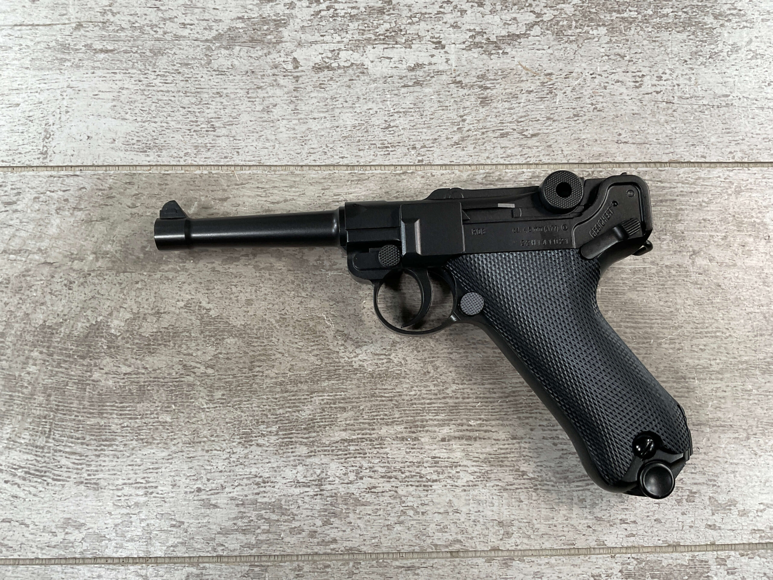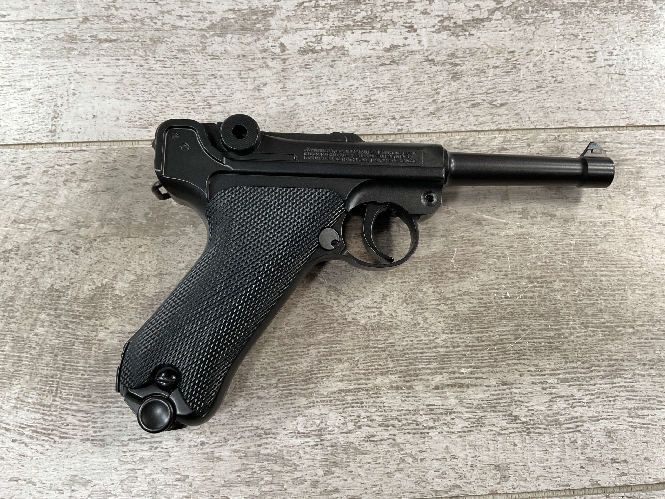 At the end of World War II, many American GIs came home with Lugers tucked neatly away in their trunks. The P-08 was the most sought after trophy of the European theater. The Luger is more than that, though. The pistol is an exquisite design that is as functional as it is beautiful. Now Umarex has built a functional replica for those who want one of their own. This CO2 powered air pistol has a 21 round magazine, and the weight and feel of an original P-08. The Luger is a masterpiece, and now it is as much fun to shoot as it is to look at. This replica is a standard action model.