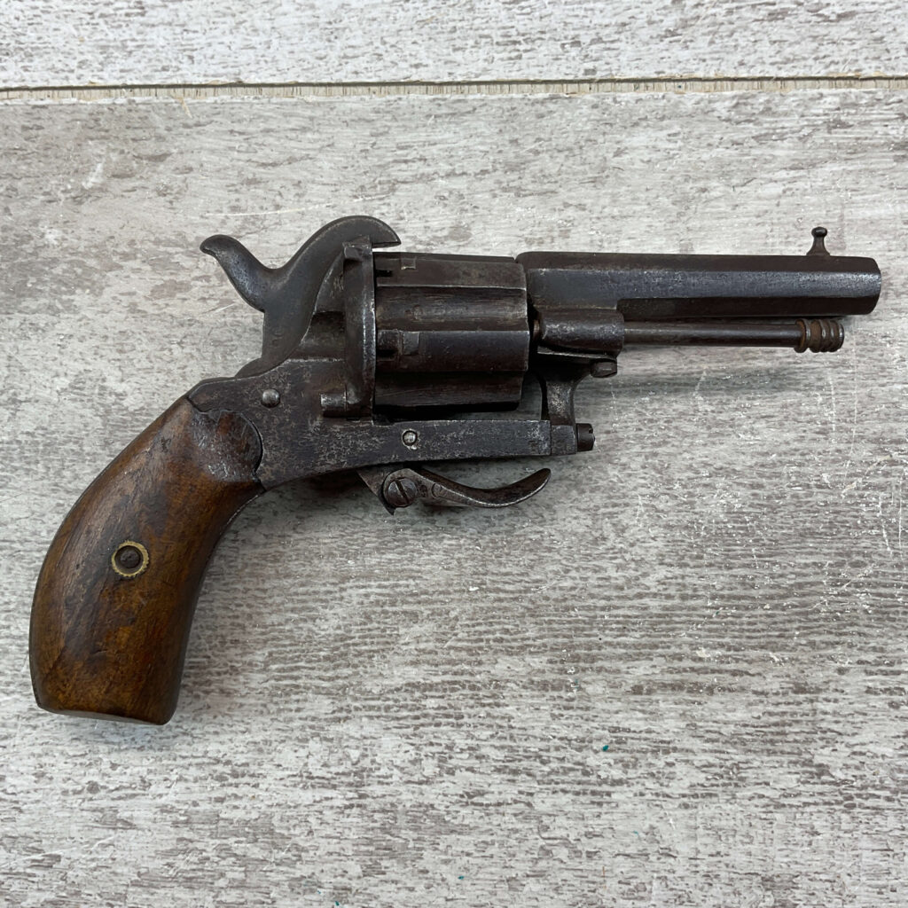 SKU#194 UNMARKED PIN FIRE REVOLVER #NSN, FOLDING TRIGGER, 6 1/8″ OVERALL, 2 3/4″ BARREL, WOODEN GRIPS, ROUGH CONDITION-NON WORKING