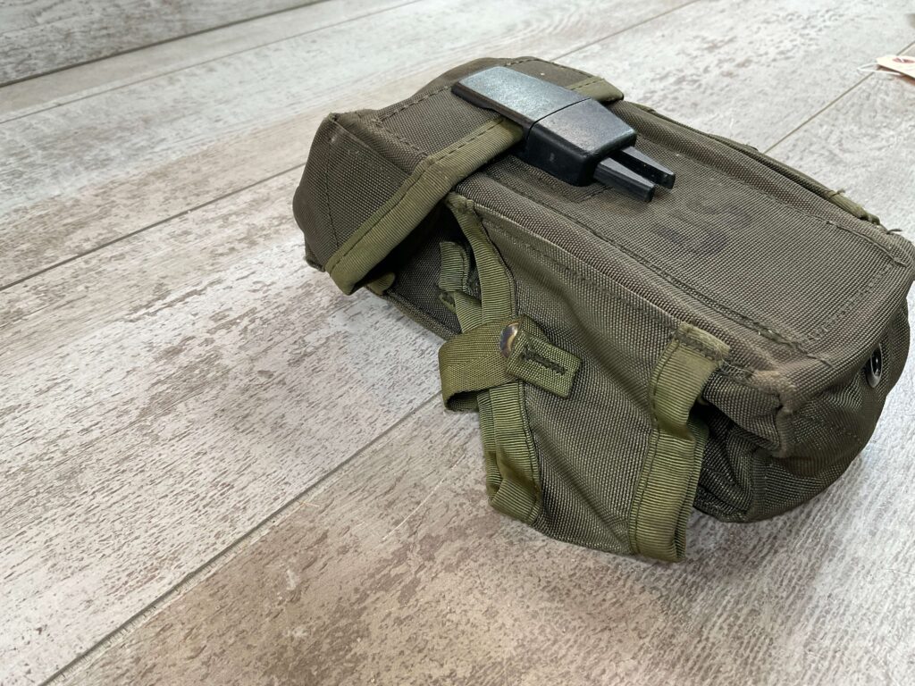 US-ISSUE M16 AMMO POUCH HOLDS THREE 30-ROUND CLIPS, A SIDE POUCH FOR HAND GRENADES, ALICE SLIDE-LOCK KEEPERS ON THE BACK, US STAMP ON THE FRONT NYLON IN VERY GOOD CONDITION