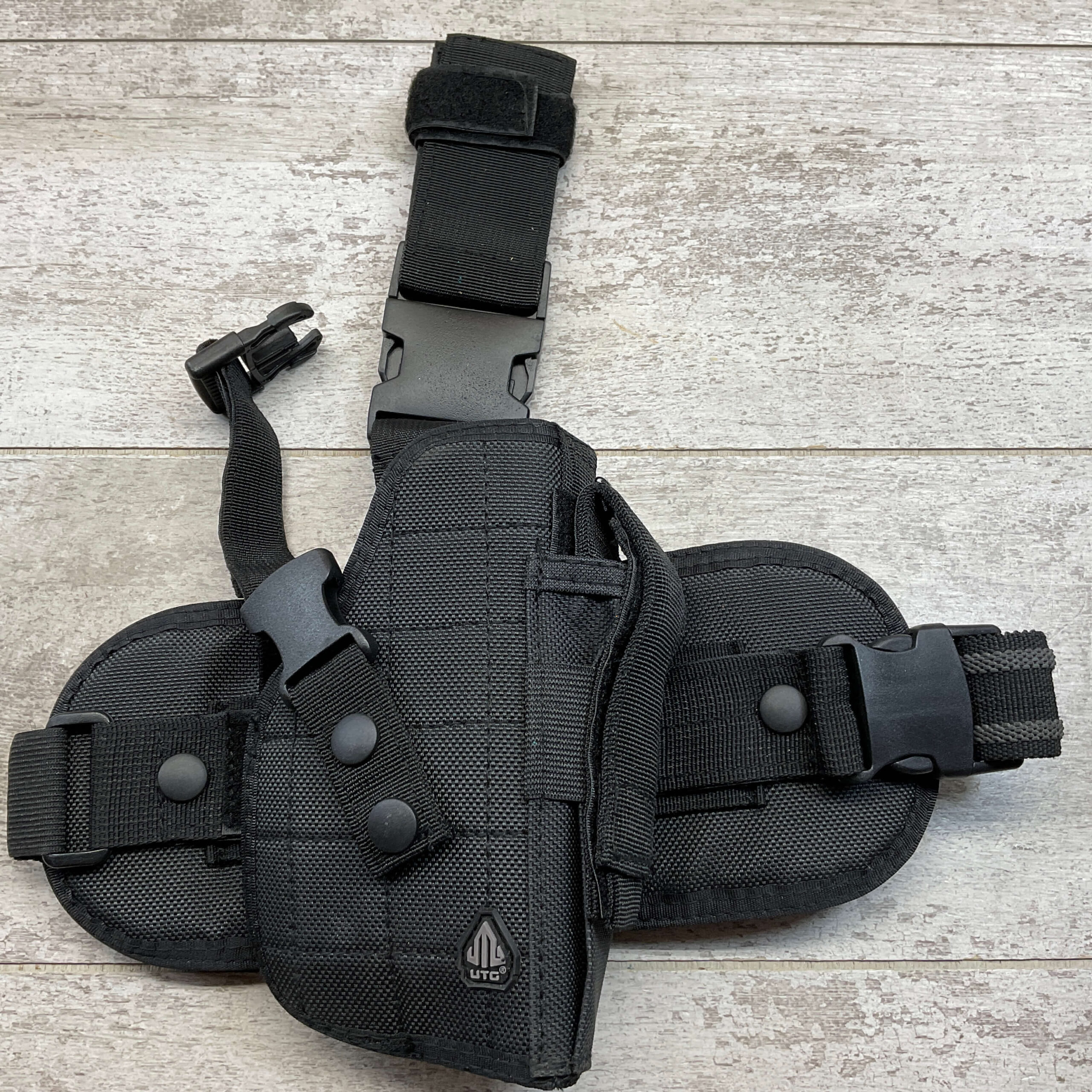 SKU#565 UTG LARGE FRAME AUTO HEAVY PADDED NYLON THIGH-RIDE BLACK HOLSTER W/WIDE BELT LOOP GIVING LOW-RIDE CARRY, NEW IN PACKAGE