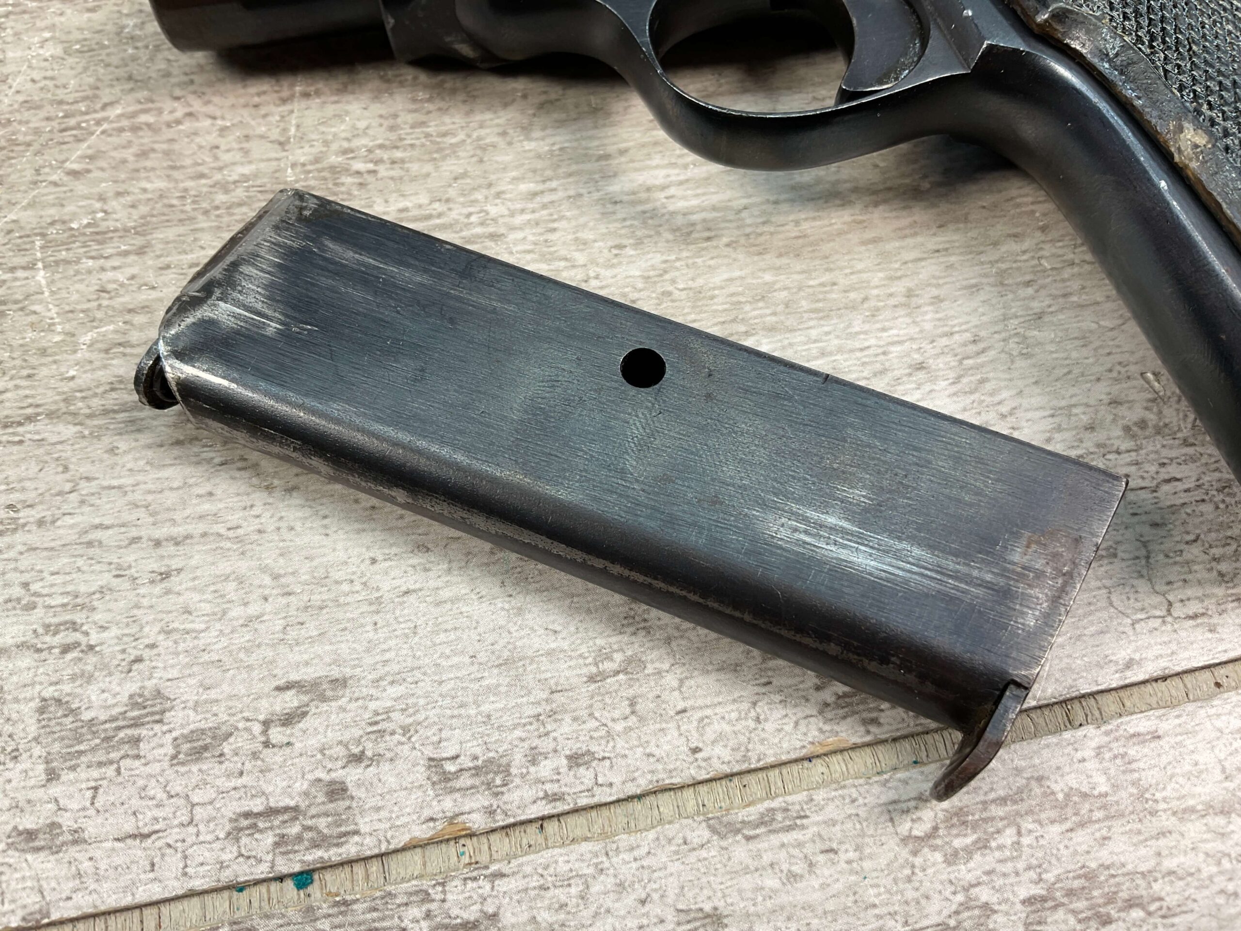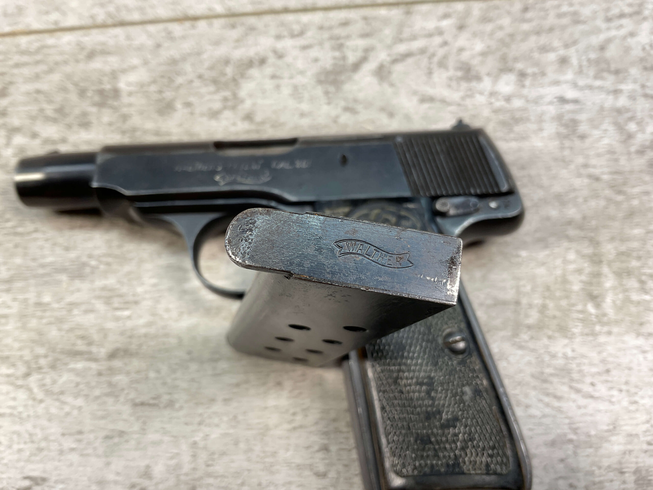 WALTHER MODEL 4 7.65 SEMI AUTO PISTOL, TYPE 3 #239046, 3.46″ BARREL, VERY GOOD BORE & RIFLING, SLIDE MARKED “WALTHER’SPATENT CAL. 7.65 / WALTHER BANNER” ON LEFT SIDE & “WAFFENFABRIK WALTHER ZELLA-MEHLIS” ON RIGHT, VG ORIGINAL “CW” MARKED CHECKERED BLACK GRIPS, 80%+ ORIGINAL BLUE FINISH W/LIGHT SPECKLING, SMOOTH ACTION, 1 ORIGINAL 8 ROUND WALTHER BANNER MAGAZINE, NO IMPORT MARKING, SAFETY WORKS BUT NEEDS TO BE REPLACED, VG OVERALL CONDITION AS SEEN IN PHOTOS!!