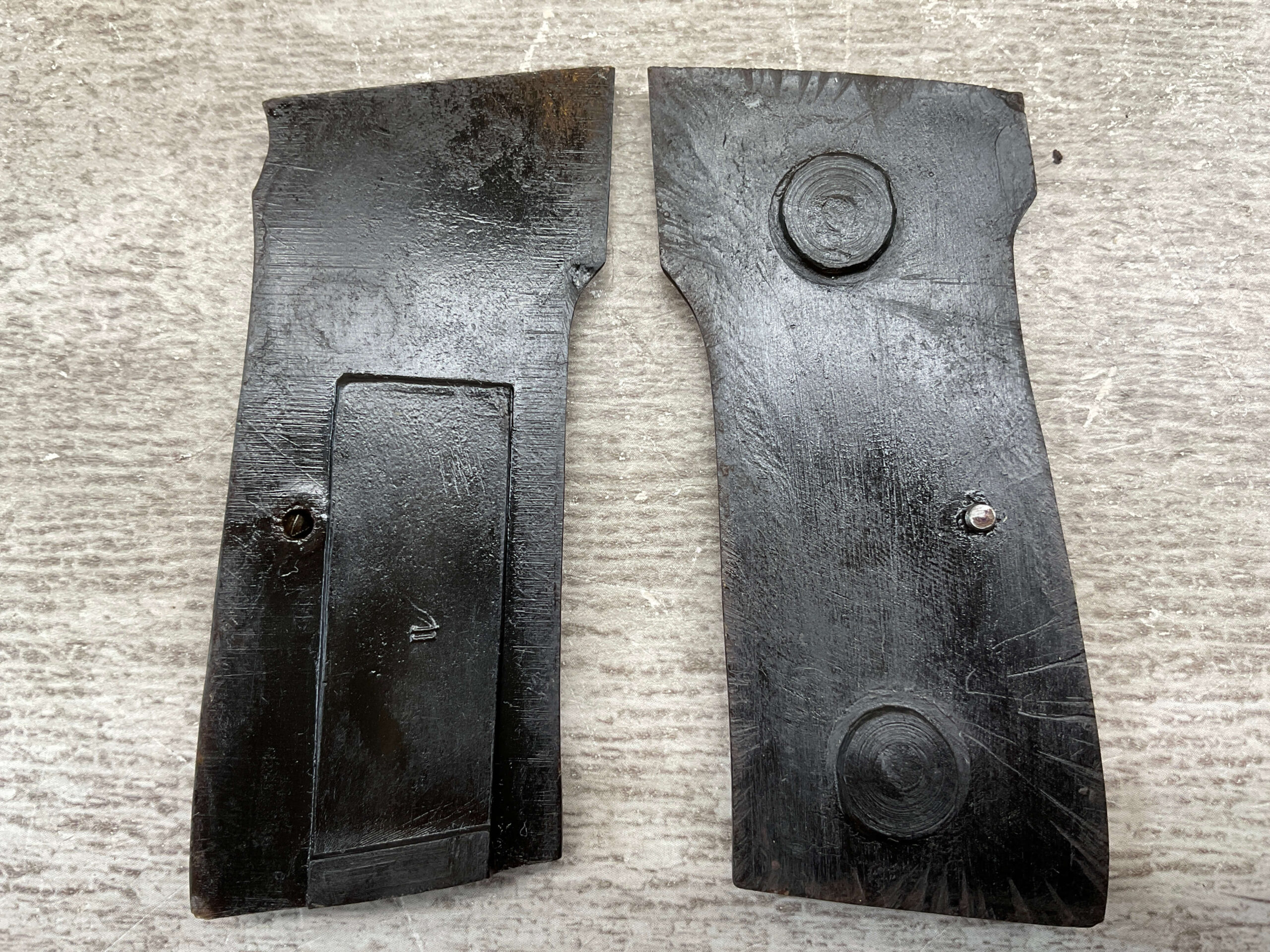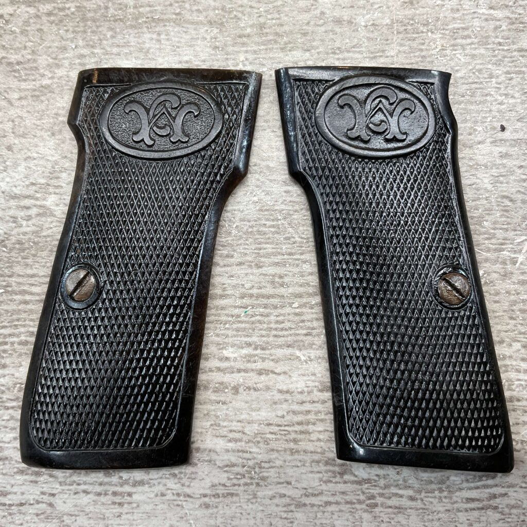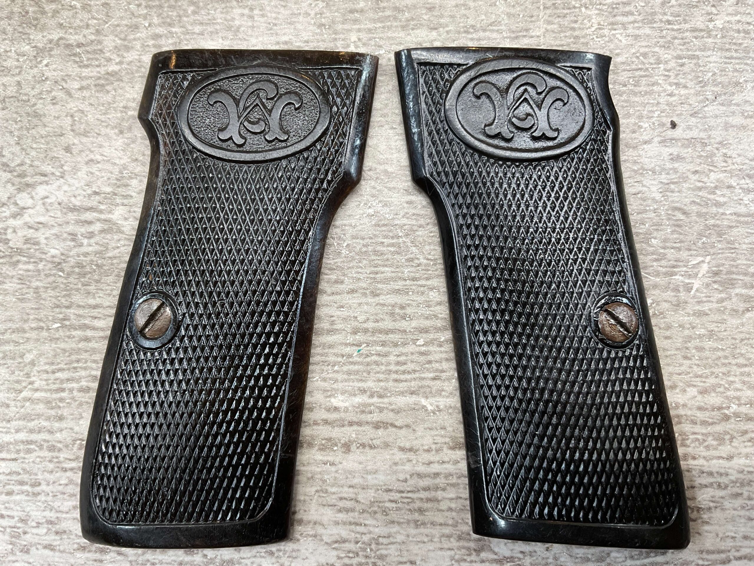 WALTHER MODEL 4 BLACK BAKELITE PISTOL GRIPS, SCREWS INCLUDED, “W” ON SIDE, WWII ERA, EXC OVERALL