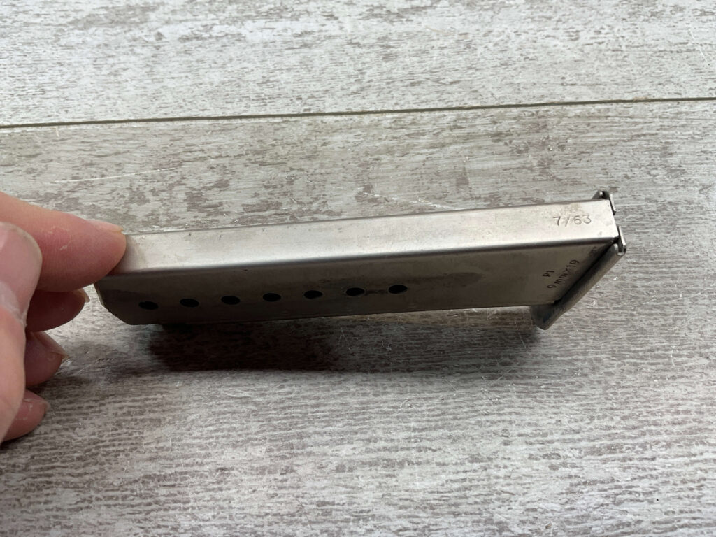 WALTHER P1 9MM MAGAZINE, RIGHT SIDE MARKING NONE, SPINE STAMPED “7/63”, LEFT SIDE STAMPED “P1/9MM X 19”, NICKLE FINISH WITH CHROME BASE, LIGHT DISCOLORATION, LIGHT USE WEAR, VG CONDITION
