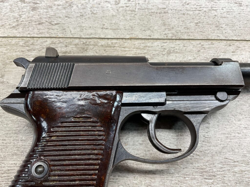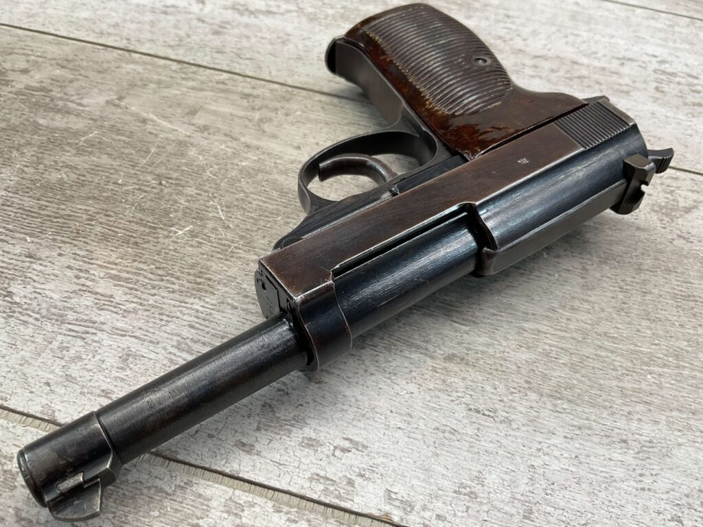 WALTHER P38 AC45 9MM SEMI AUTO PISTOL, NON MATCHING #6335c, #6712c SLIDE, 90%+ BLUE, 4 7/8″ BARREL, ORIGINAL RED BAKELITE GRIPS, “P.38v / U” STAMPED MAGAZINE, DULL MILITARY FINISH, GOOD BORE & RIFLING W/ LIGHT FROSTING IN AREAS, “359” INSPECTION STAMP ON LEFT SIDE OF FRAME ABOVE TRIGGER, EXCELLENT LATE WAR!