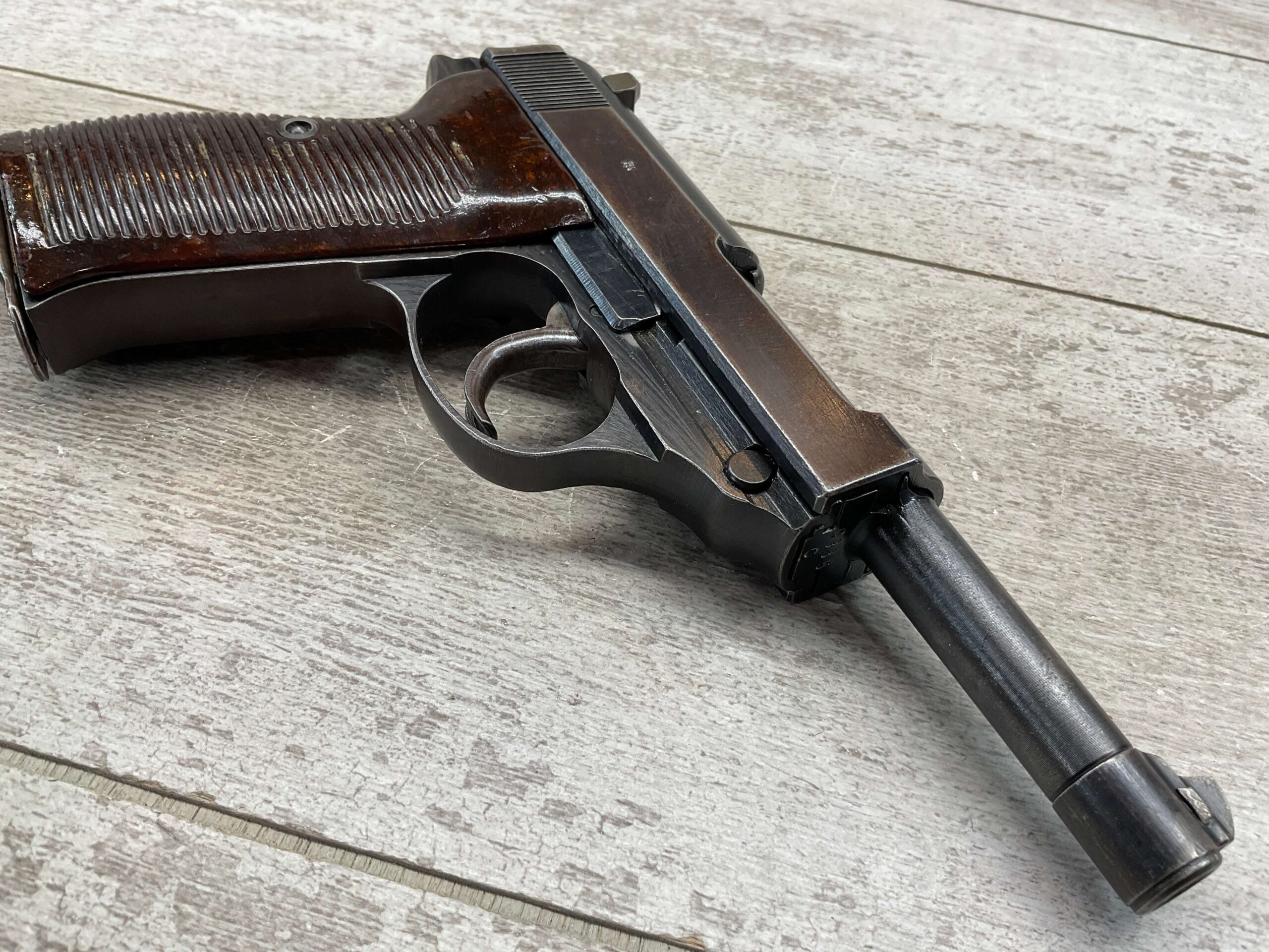 WALTHER P38 AC45 9MM SEMI AUTO PISTOL, NON MATCHING #6335c, #6712c SLIDE, 90%+ BLUE, 4 7/8″ BARREL, ORIGINAL RED BAKELITE GRIPS, “P.38v / U” STAMPED MAGAZINE, DULL MILITARY FINISH, GOOD BORE & RIFLING W/ LIGHT FROSTING IN AREAS, “359” INSPECTION STAMP ON LEFT SIDE OF FRAME ABOVE TRIGGER, EXCELLENT LATE WAR!