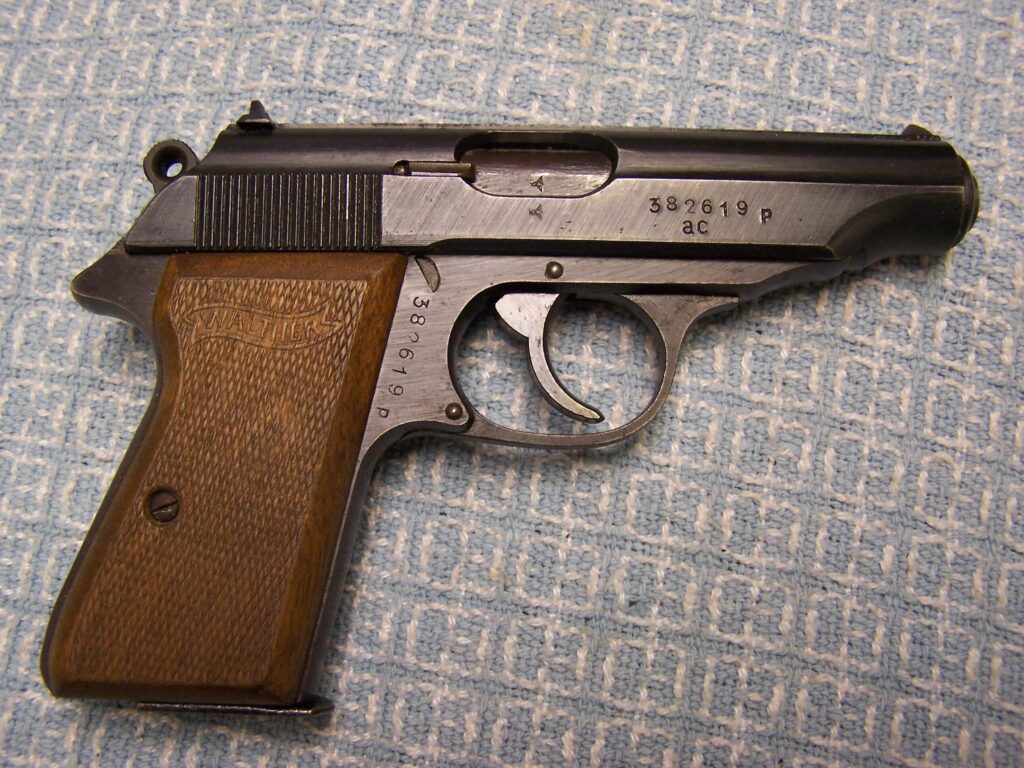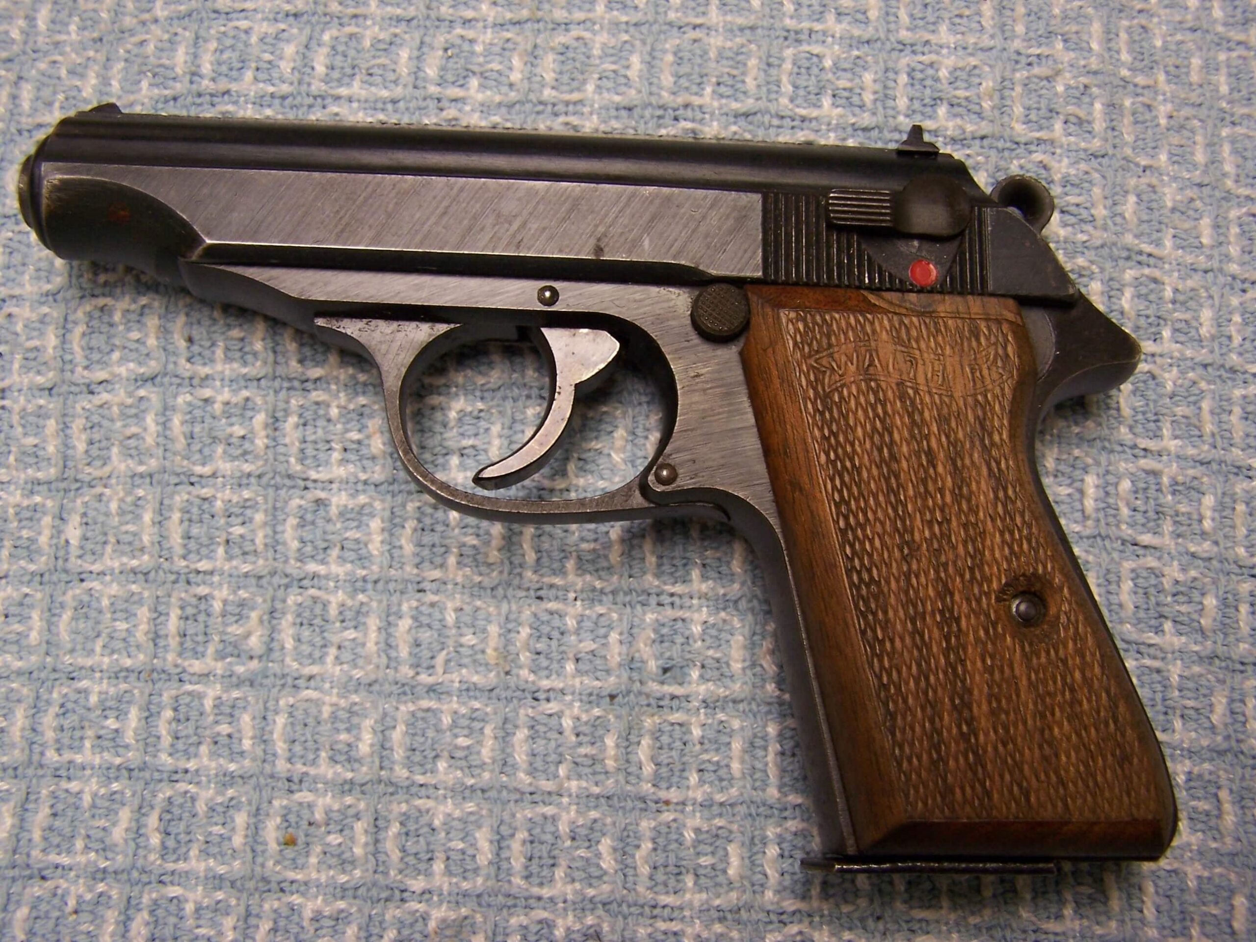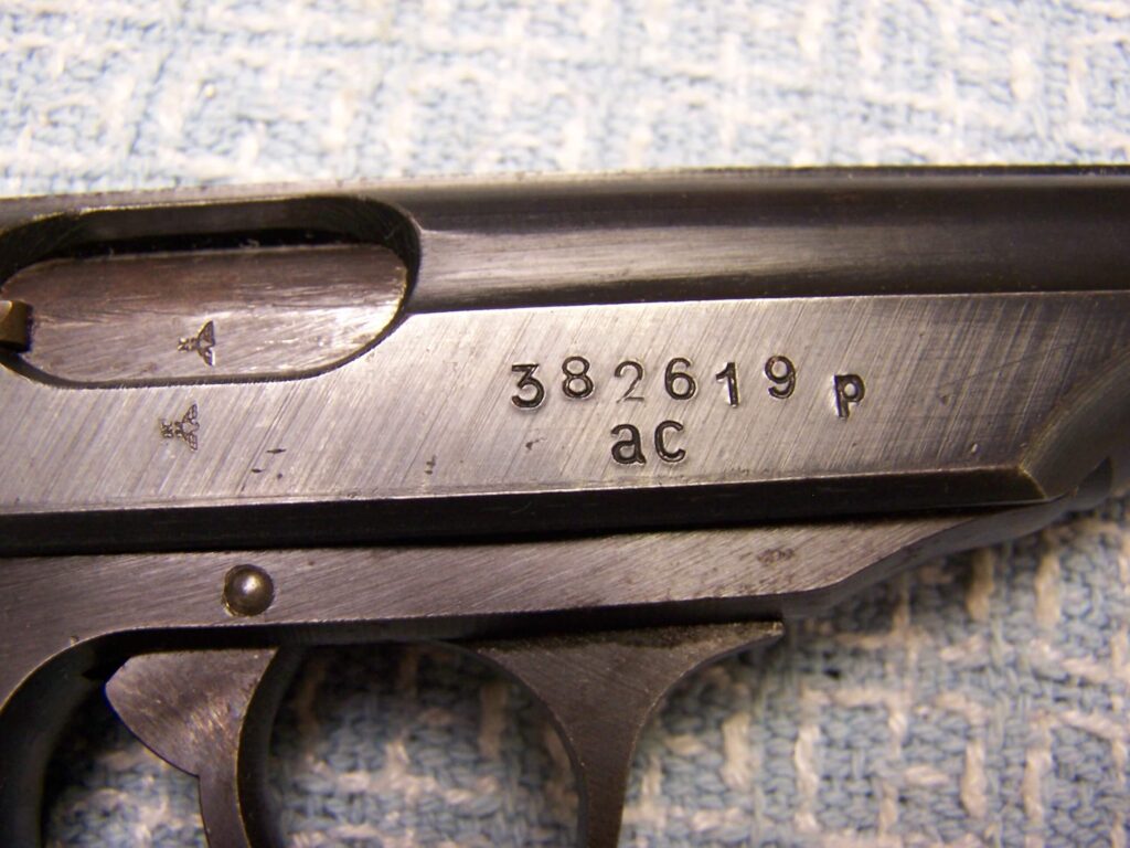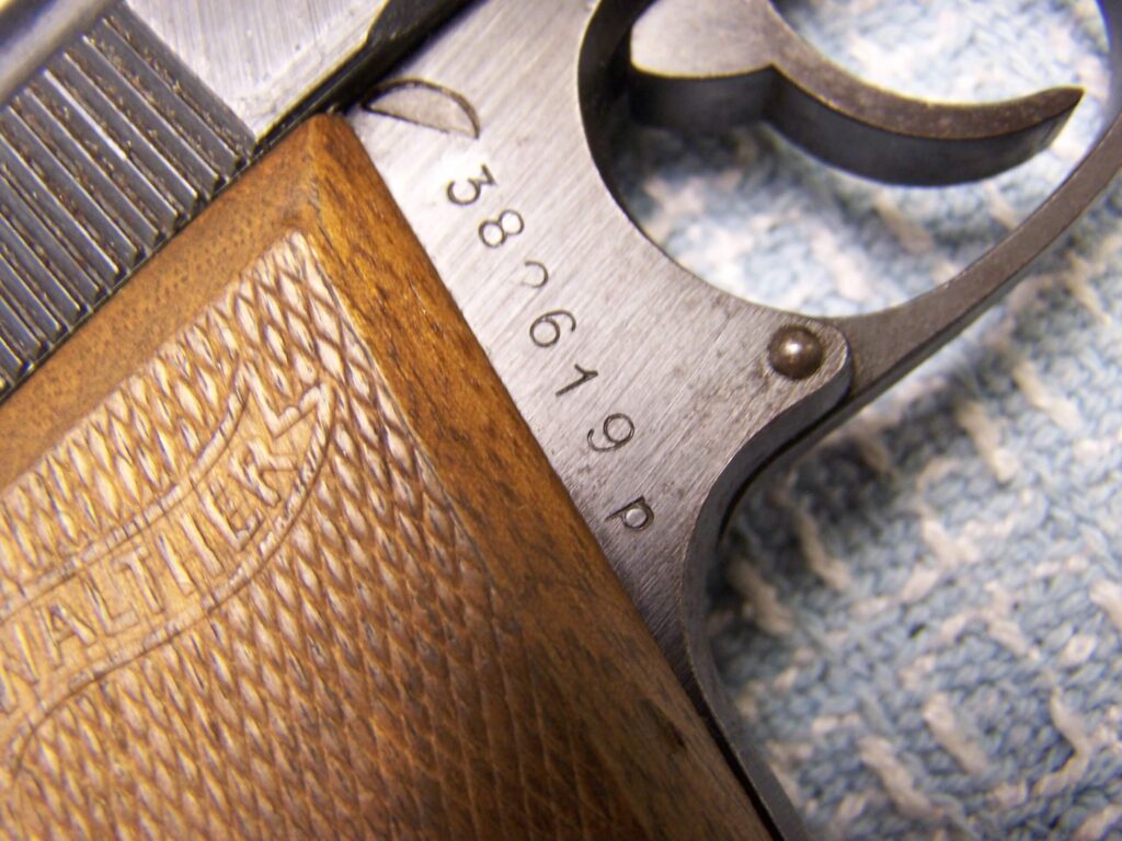 SKU#028 WALTHER PP .32ACP LATEWAR #382619p W/EXC. BROWN PEBBLEGRAIN ERSATZ HOLSTER, MATCHING, E/N PROOFED, ac ON RIGHT SLIDE RIGHT, LEFT SIDE OF SLIDE BLACK, EXC. WALTHER BANNER PRESS-CHECKERED WOOD GRIPS, EXC. BORE, 96%