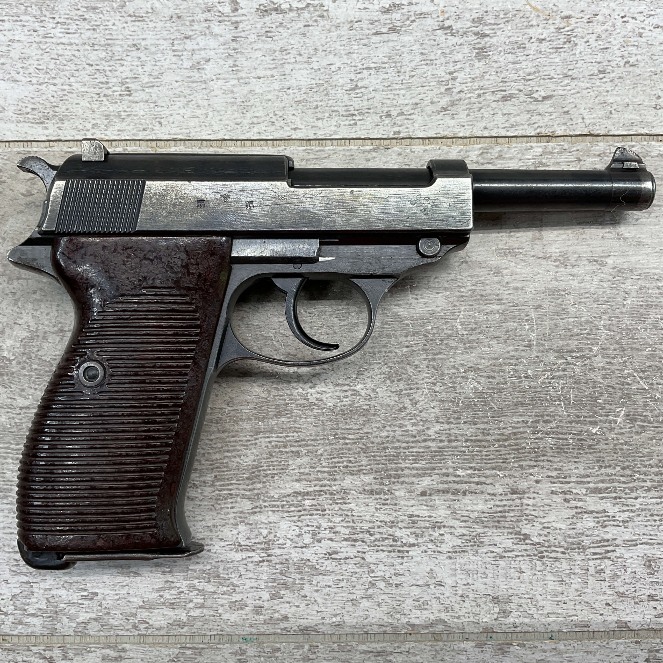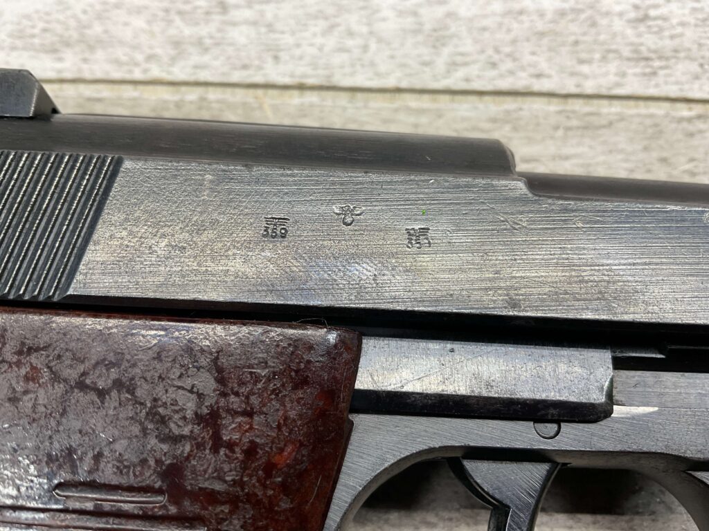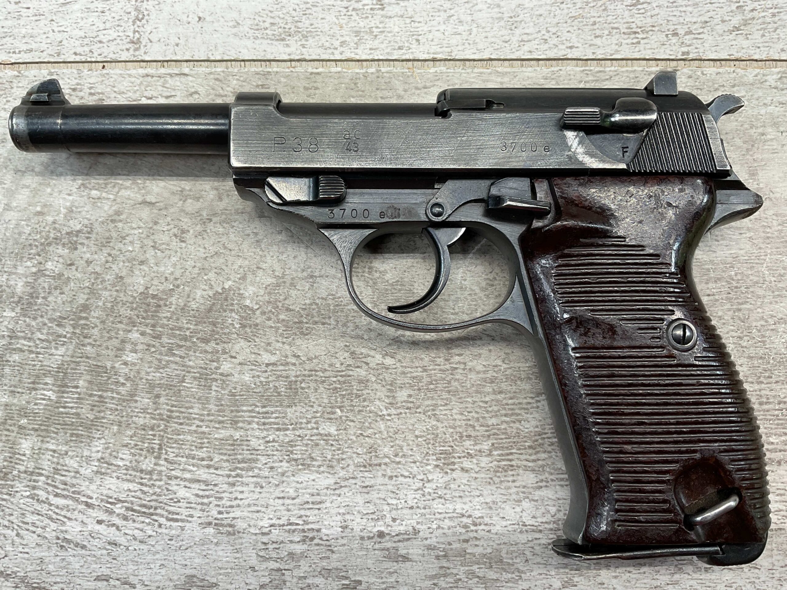 WALTHER WWII P38 AC43 PISTOL ALL MATCHING #3700e, DECOCKER WORKS, LIGHT HIGH EDGE WEAR OTHERWISE VG ORIGINAL FINISH, VG BORE & RIFLING, LEFT SLIDE MARKED “P.38”, “AC / 43”, AND “3700e”, DEFACED FRAME MARKED “3700e” W/ WaA359, RIGHT SLIDE MARKED WITH TWO WaA359 PROOFS & NAZI PROOF, TOP OF SLIDE CLOSE TO BARREL MARKED “3700” OVER “e”, MAG INCLUDED MARKED WITH WaA359 ON SPINE