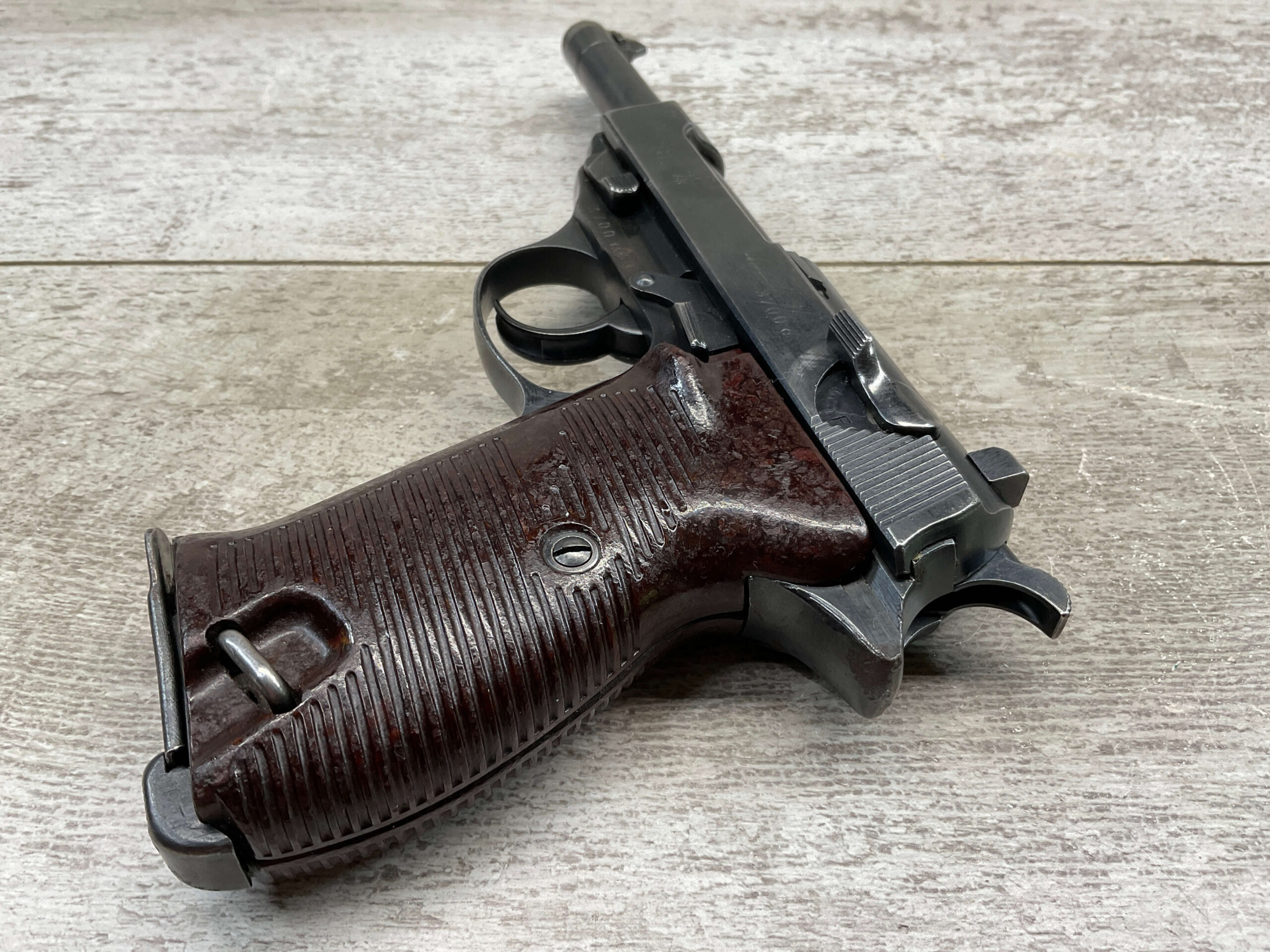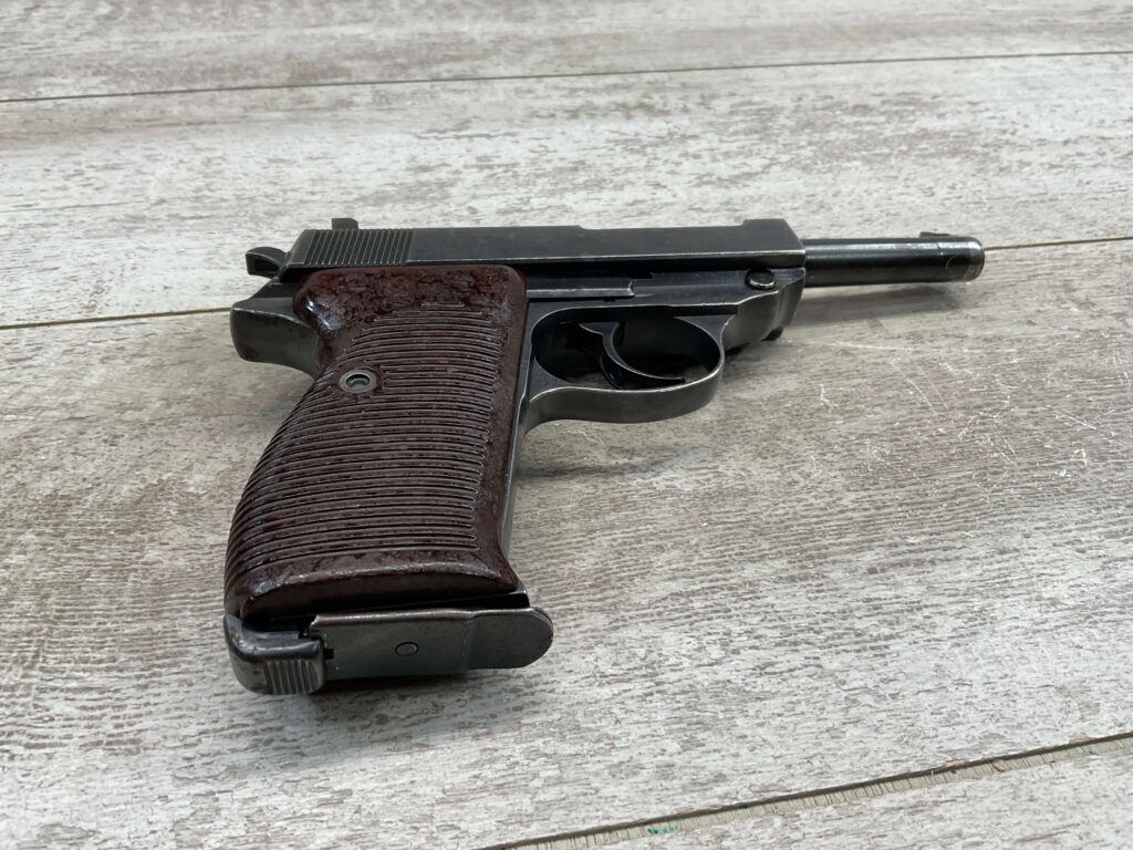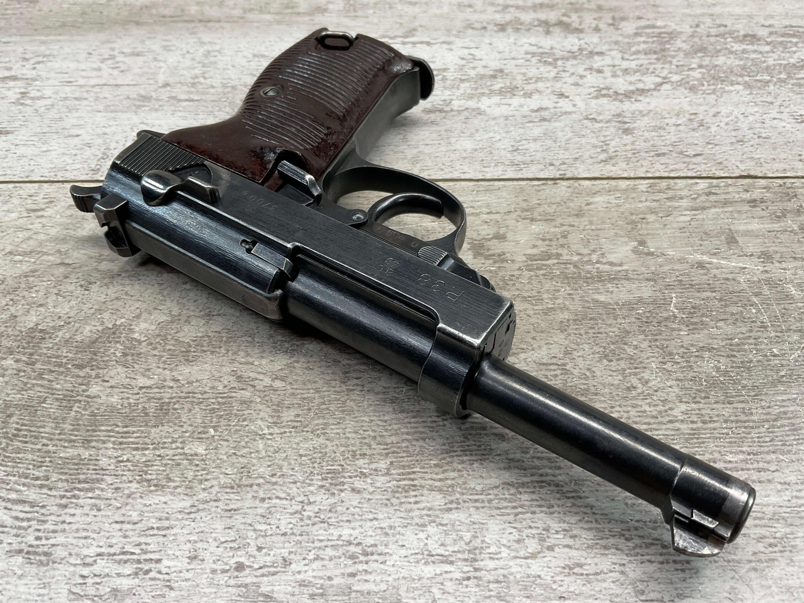WALTHER WWII P38 AC43 PISTOL ALL MATCHING #3700e, DECOCKER WORKS, LIGHT HIGH EDGE WEAR OTHERWISE VG ORIGINAL FINISH, VG BORE & RIFLING, LEFT SLIDE MARKED “P.38”, “AC / 43”, AND “3700e”, DEFACED FRAME MARKED “3700e” W/ WaA359, RIGHT SLIDE MARKED WITH TWO WaA359 PROOFS & NAZI PROOF, TOP OF SLIDE CLOSE TO BARREL MARKED “3700” OVER “e”, MAG INCLUDED MARKED WITH WaA359 ON SPINE