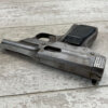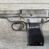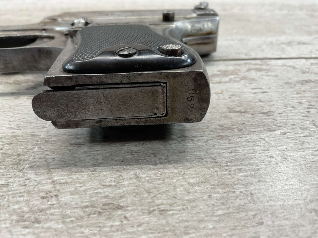 WARNER ARMS “THE INFALLIBLE” .32 CAL SEMI-AUTOMATIC PISTOL #952, ALL MATCHING, FRAME IS TYPE 1 CAST, ENTIRE FIREARM HAS LOST BLUE & IS IN THE “WHITE”, POOR DARK BORE W/LITTLE RIFLING REMAINING, LEFT FRAME IS STAMPED “THE INFALLABLE” OVER “WARNER ARMS CORPORATION, NORWICH, CT USA” OVER “PATENTED JULY 28TH, 1914-MARCH 9TH, 1915” THE DATE 1915 IS FADED, GRIPS ARE BLACK W/ WAC INSCRIBED ON THE TOP & THE RIGHT ONE IS BROKEN, THE FIRING PIN SPRING DOES NOT CATCH (WILL NOT FIRE), NO MISSING PARTS, FAIR CONDITION, RARE PIECE TO ADD TO THE COLLECTION!!