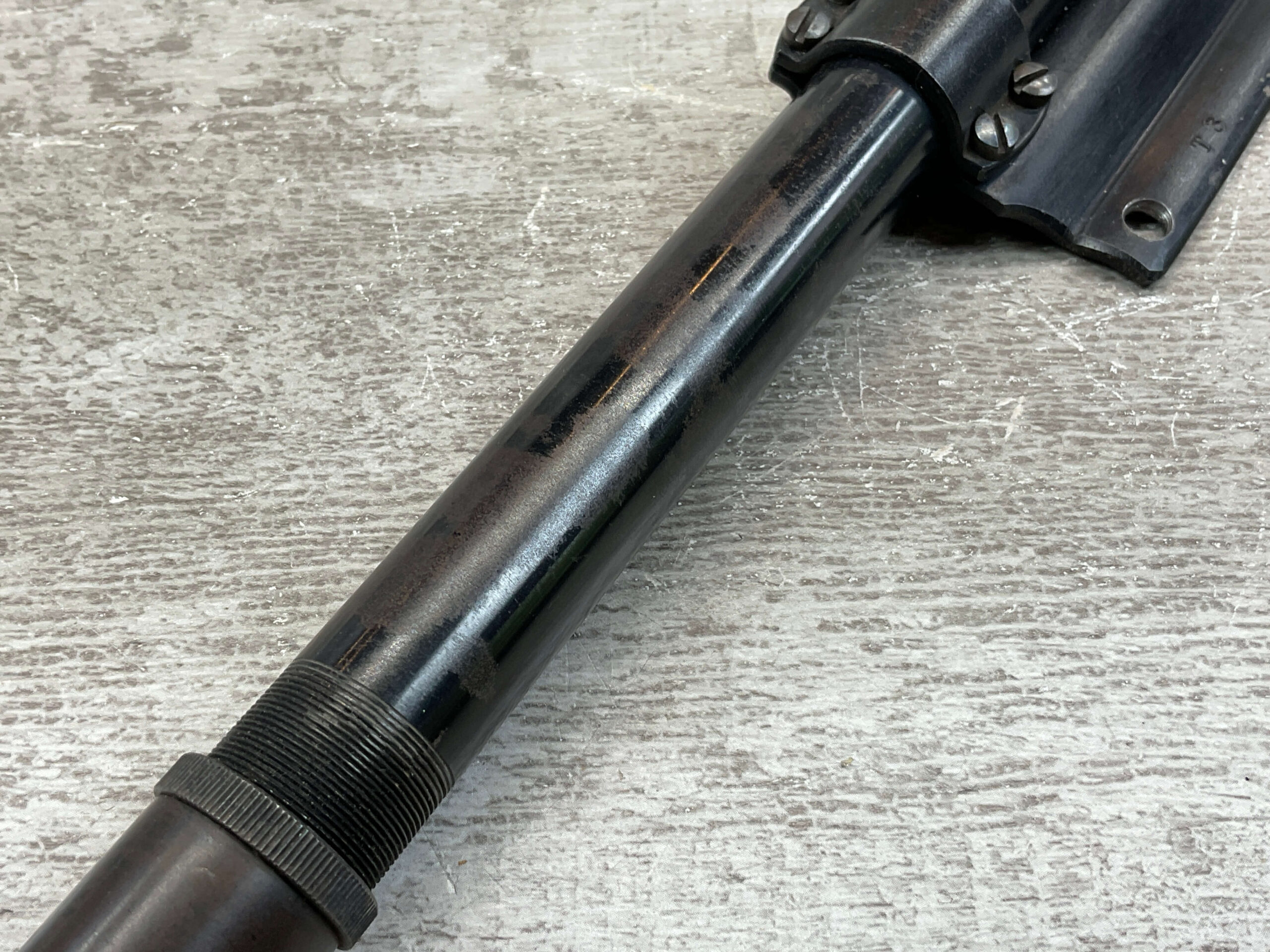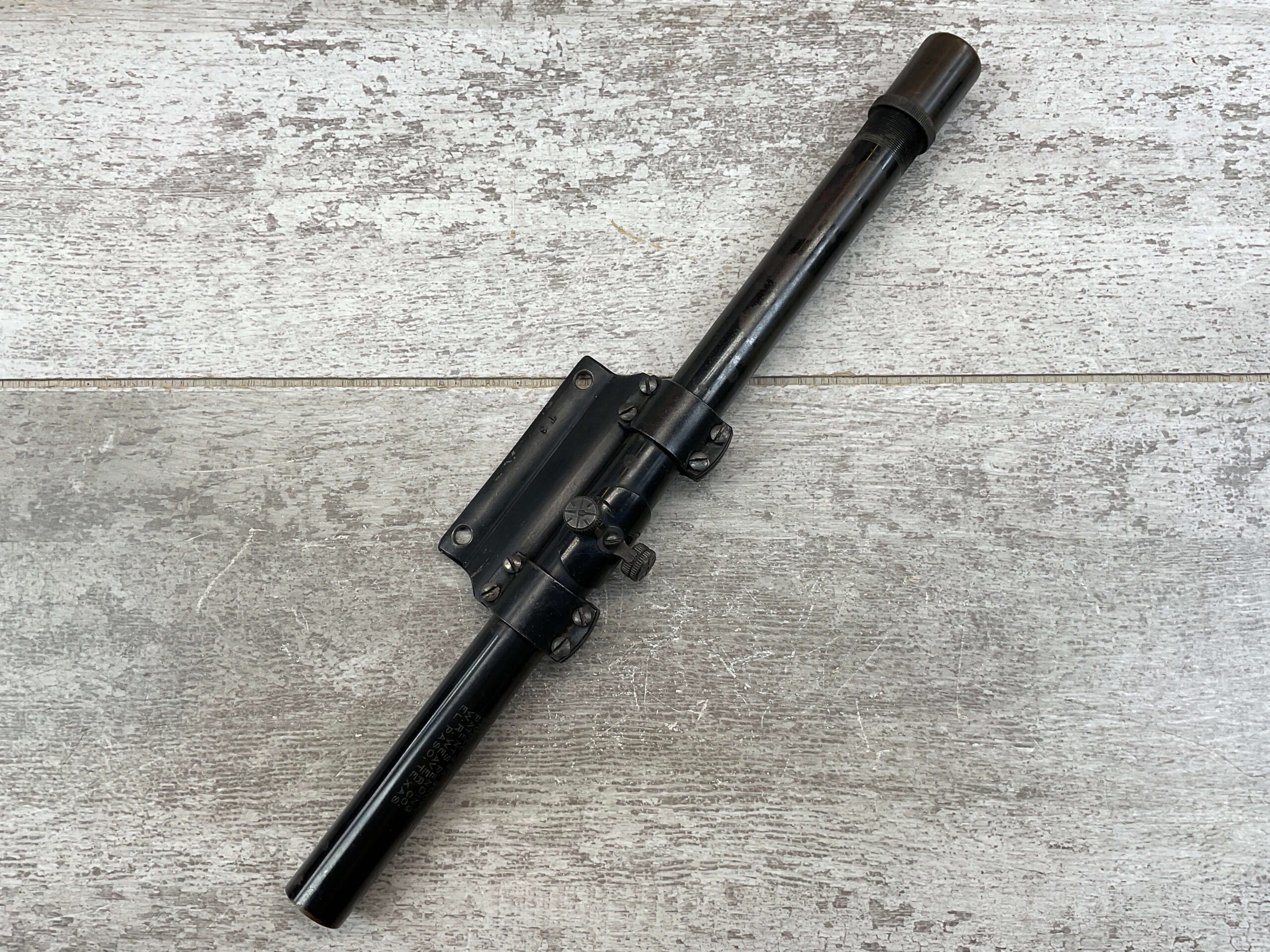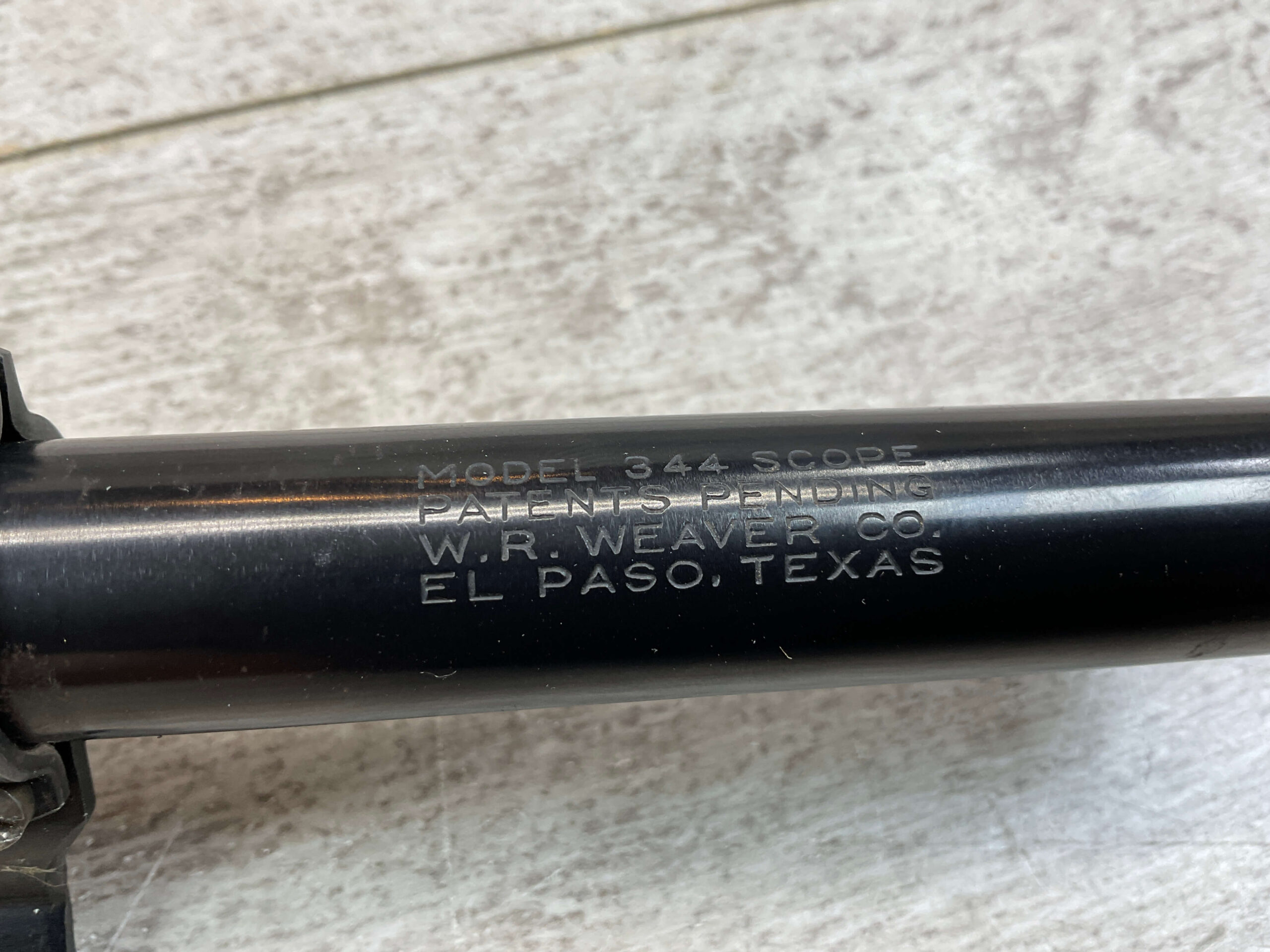 WEAVER MODEL 344 T-3 CROSSHAIR SCOPE, VINTAGE, LENGTH: 12 1/2″, MARKED “MODEL 344 SCOPE / PATENTS PENDING / W.R. WEAVER CO. / EL PASO, TEXAS”, IN GOOD CONDITION WITH SOME WEAR AND DISCOLORATION.