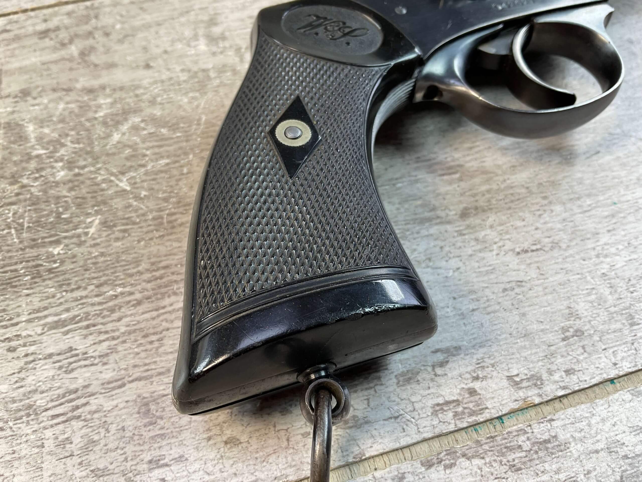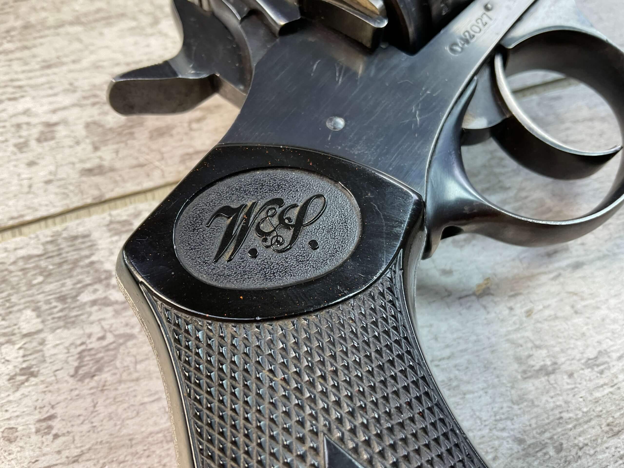 WEBLEY & SCOTT MARK IV .22LR TARGET REVOLVER, JAMES EARL JONES “FAVORITES” COLLECTION #42027, 6″ BARREL, EXC MINTY BORE & RIFLING, EXC ORIGINAL BLUE FINISH W/ HIGH EDGE WEAR, FIXED SIGHTS, EXC W&S BLACK CHECKERED PLASTIC GRIPS, CONDITION AS SHOWN IN PICTURES, FROM THE JAMES EARL JONES “FAVORITES” COLLECTION W/ CERTIFICATE OF AUTHENTICITY.