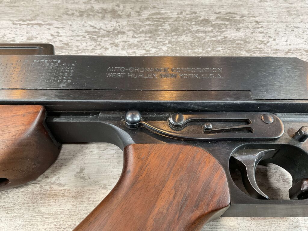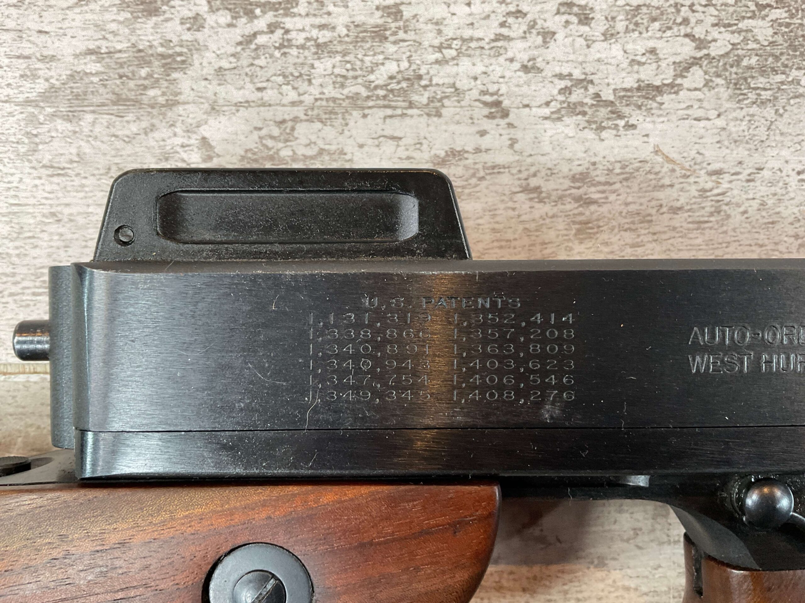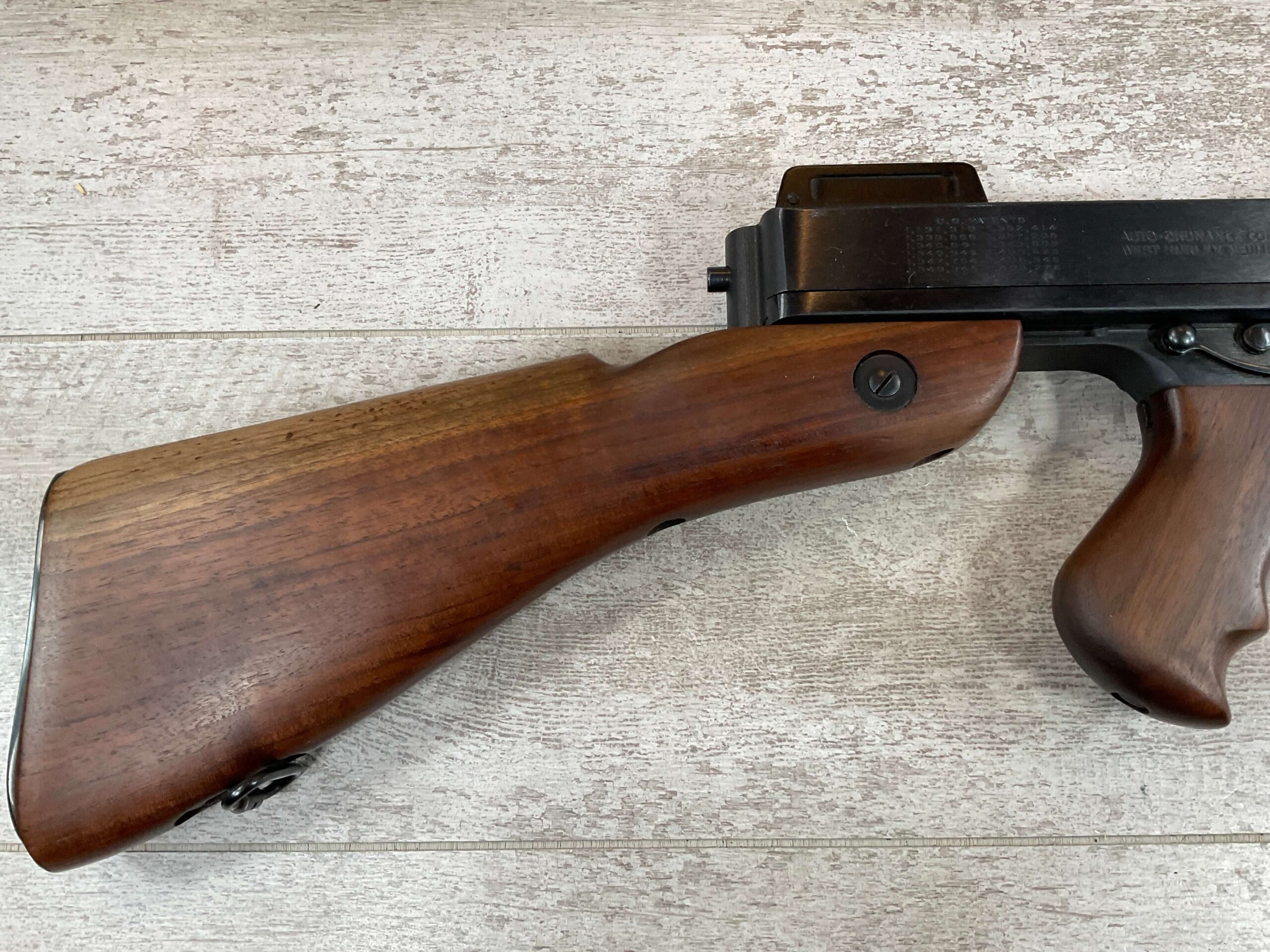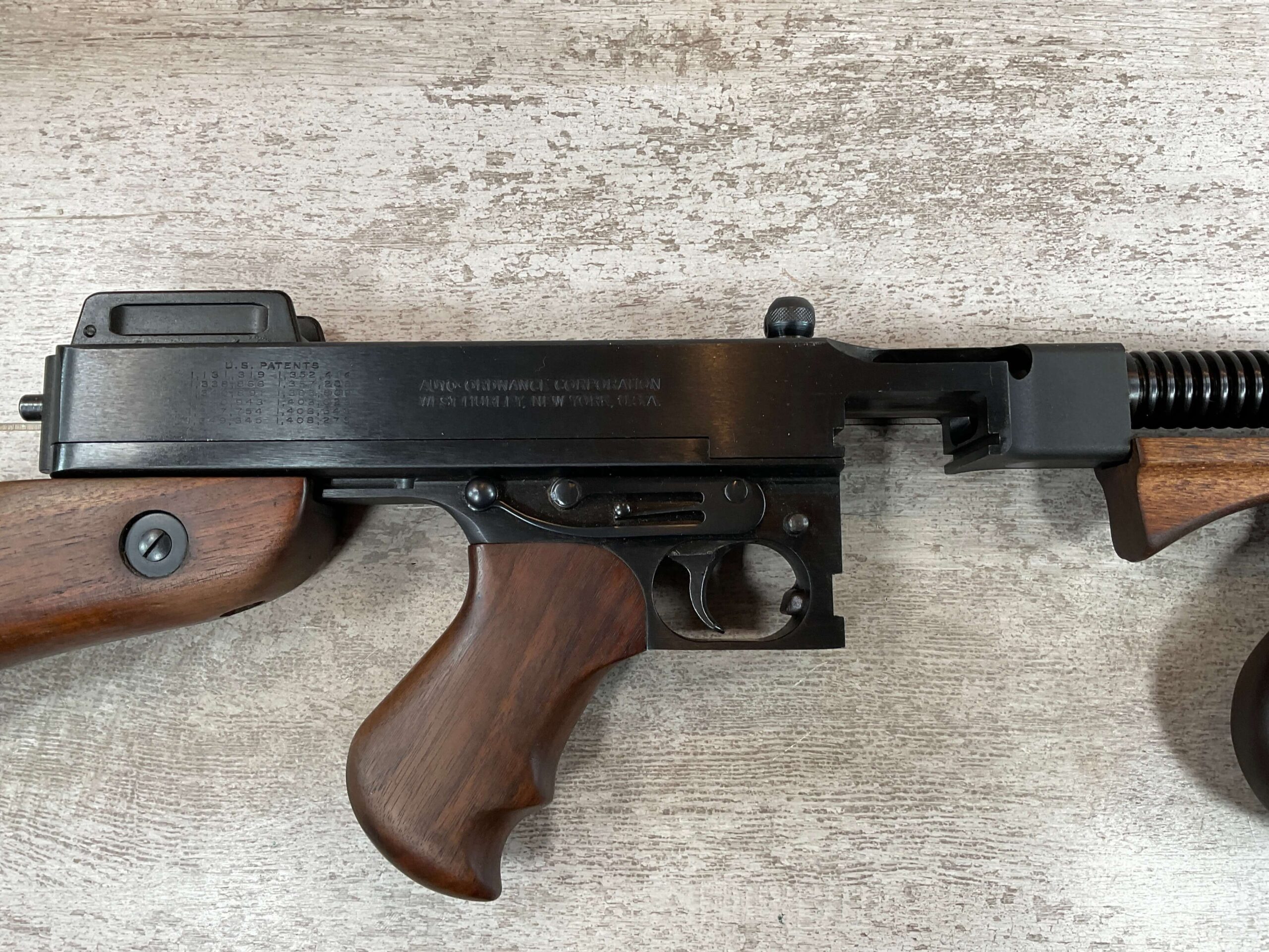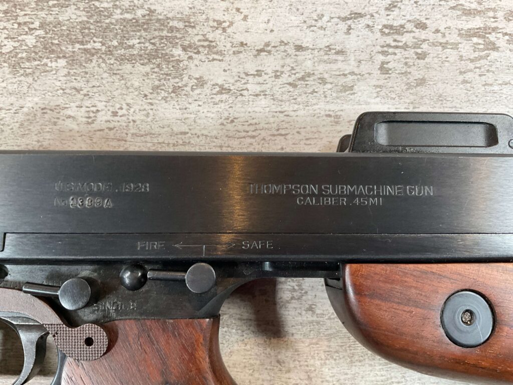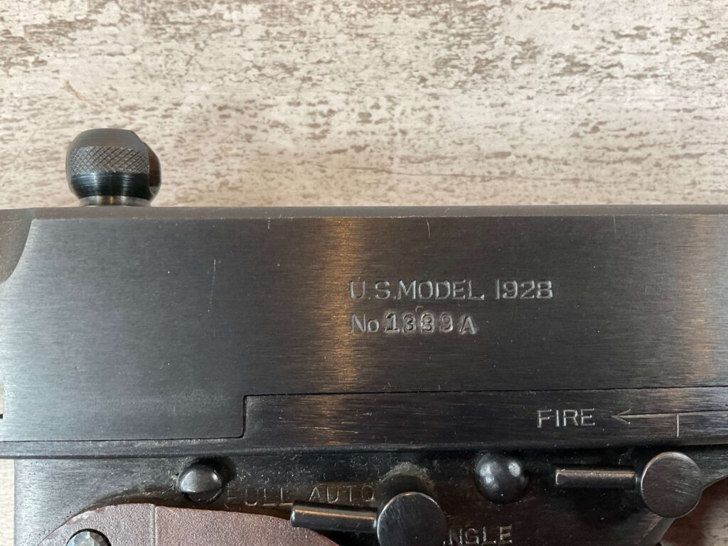 THIS IS AN EXCELLENT EXAMPLE OF A LATE PRODUCTION MODEL 1928 THOMPSON SUB-MACHINE GUN MANUFACTURED BY AUTO-ORDNANCE CORPORATION OF WEST HURLY, NEW YORK. THESE SMGS CAN BE EASILY IDENTIFIED BY THE “A†SERIAL NUMBER SUFFIX AS BEING PRODUCED CIRCA THE 1970S..