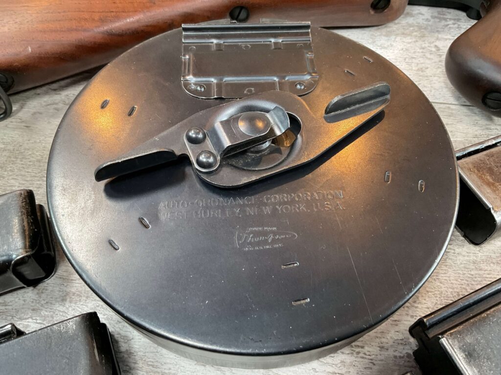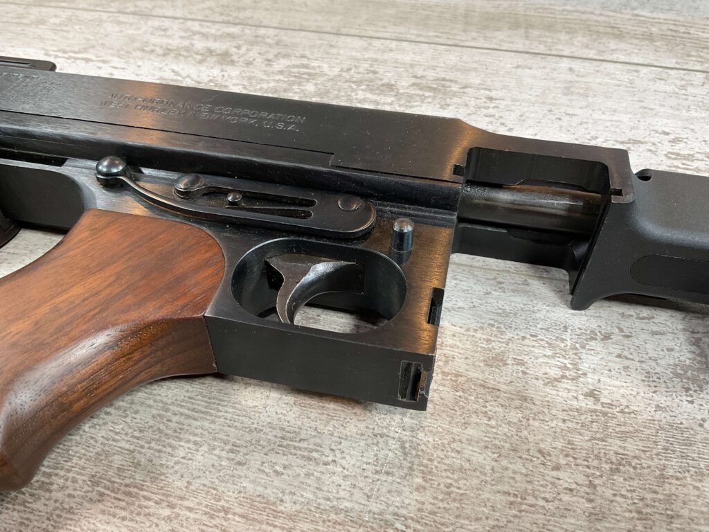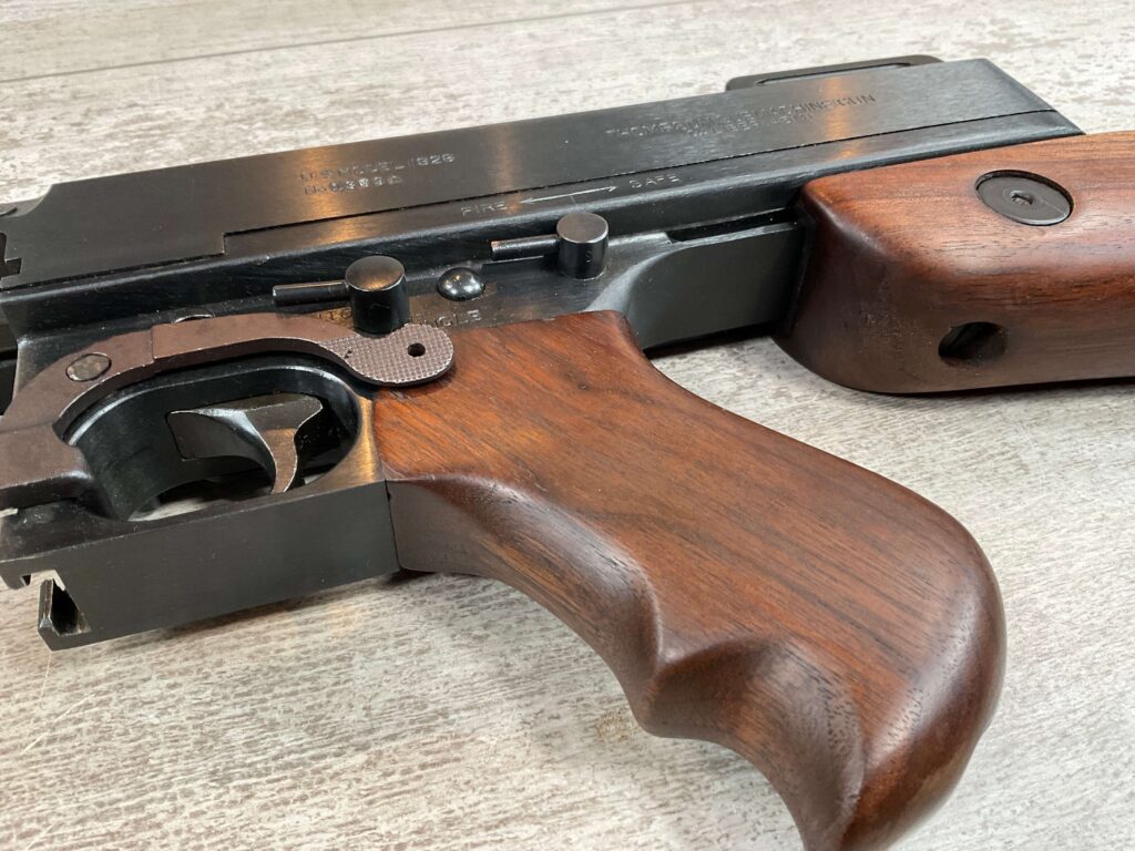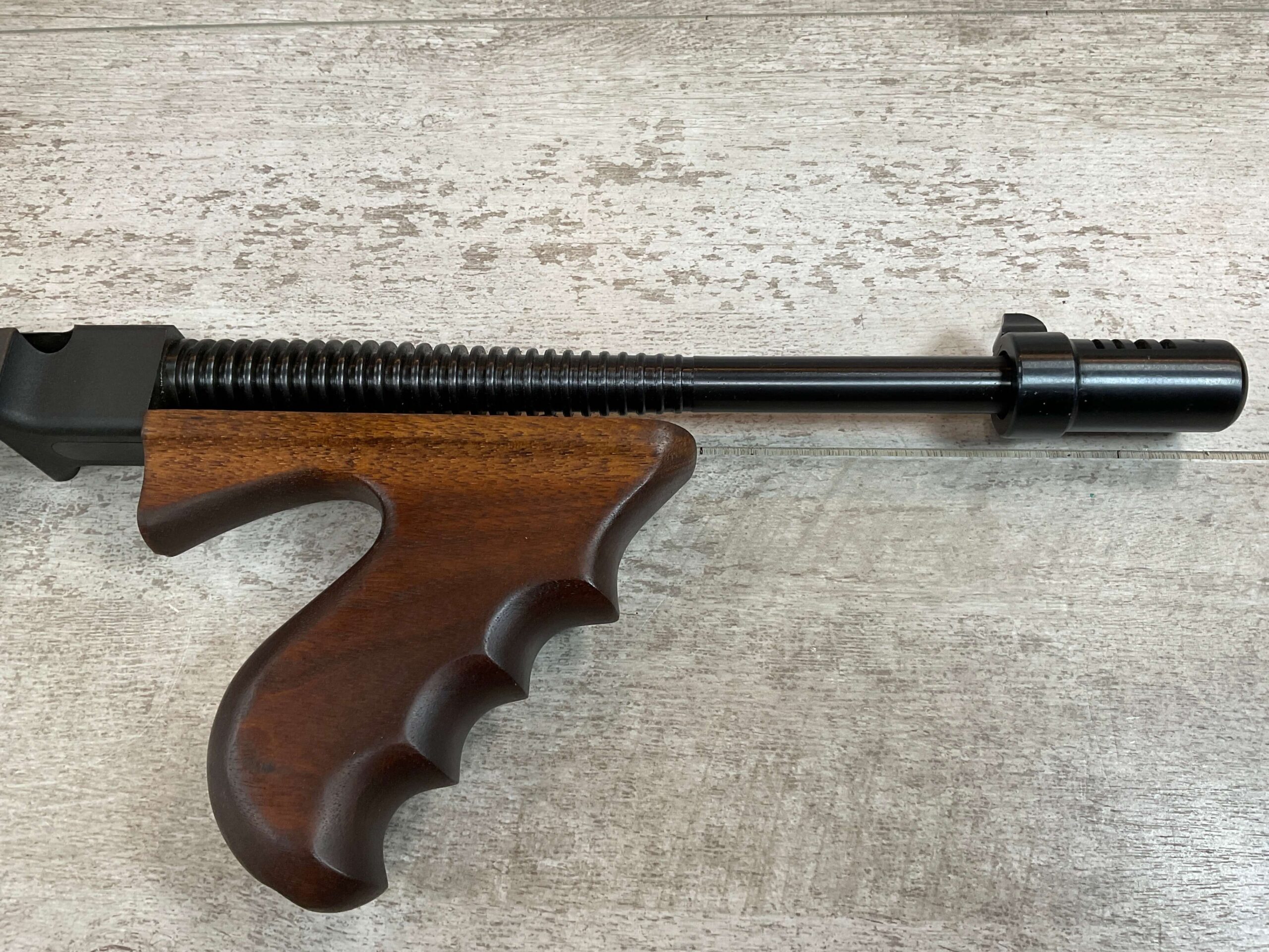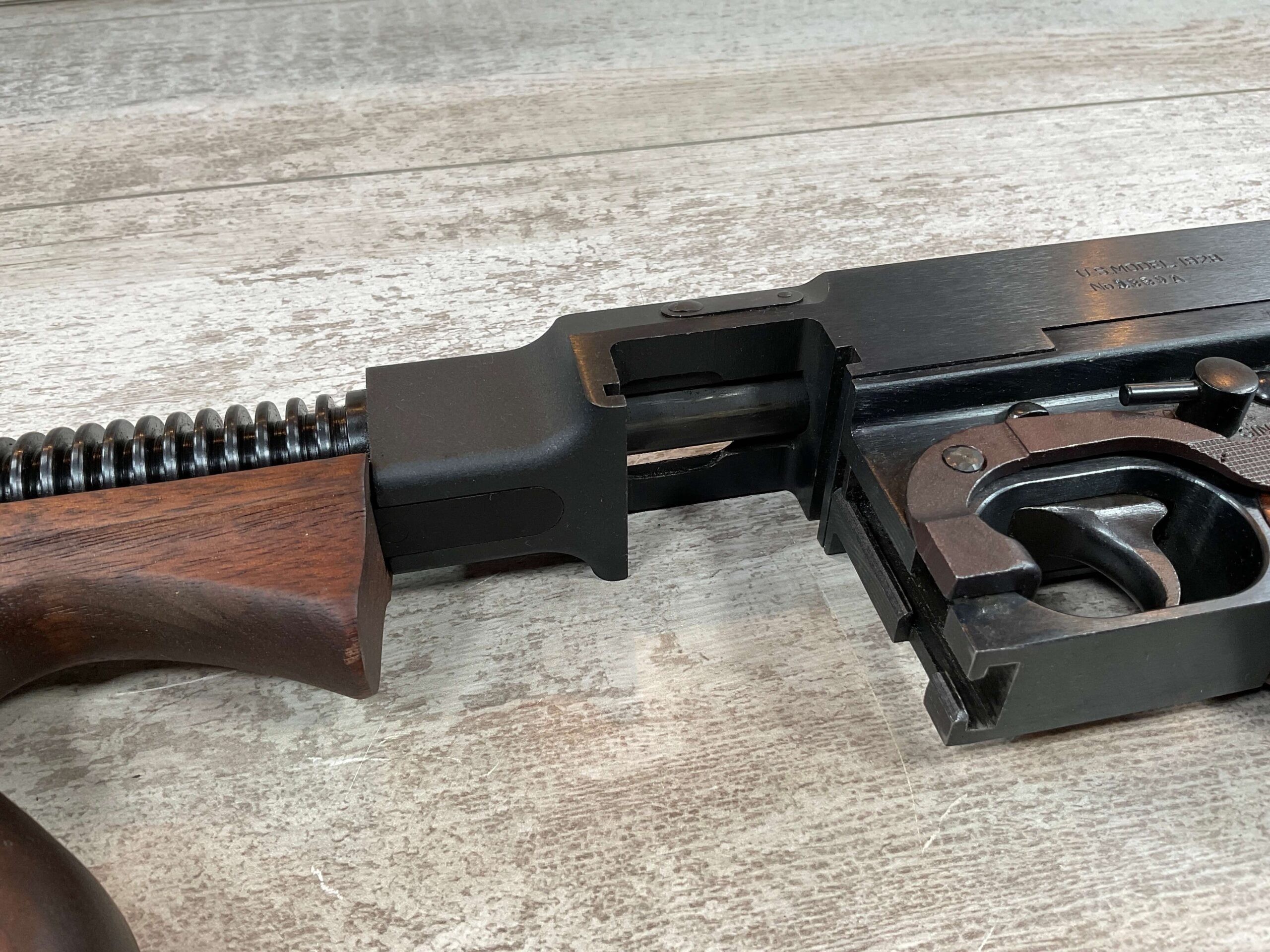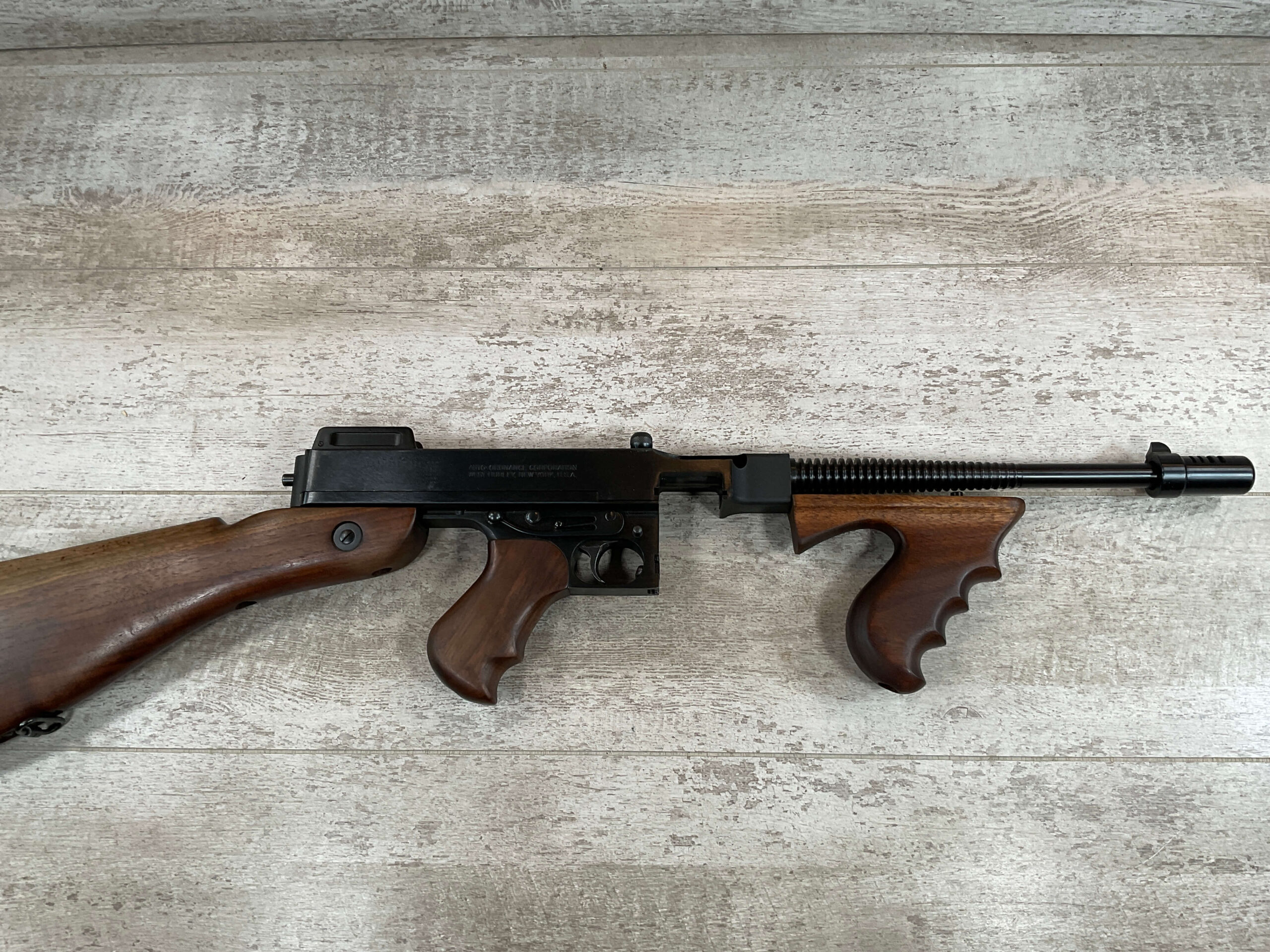 THIS IS AN EXCELLENT EXAMPLE OF A LATE PRODUCTION MODEL 1928 THOMPSON SUB-MACHINE GUN MANUFACTURED BY AUTO-ORDNANCE CORPORATION OF WEST HURLY, NEW YORK. THESE SMGS CAN BE EASILY IDENTIFIED BY THE “A†SERIAL NUMBER SUFFIX AS BEING PRODUCED CIRCA THE 1970S..