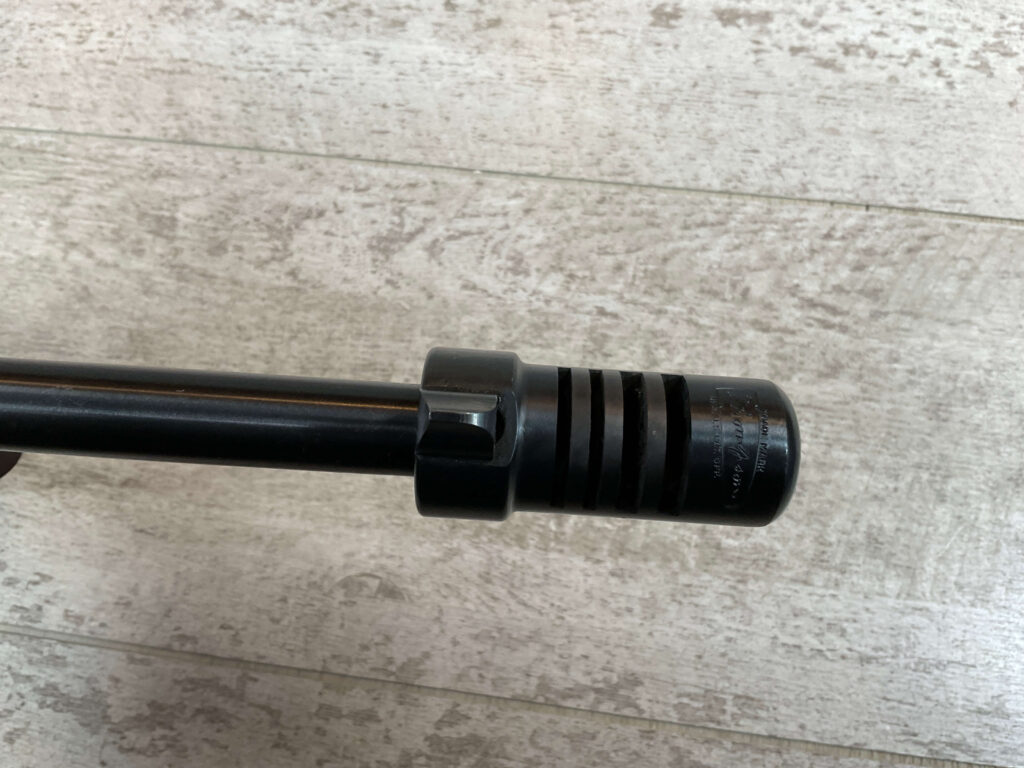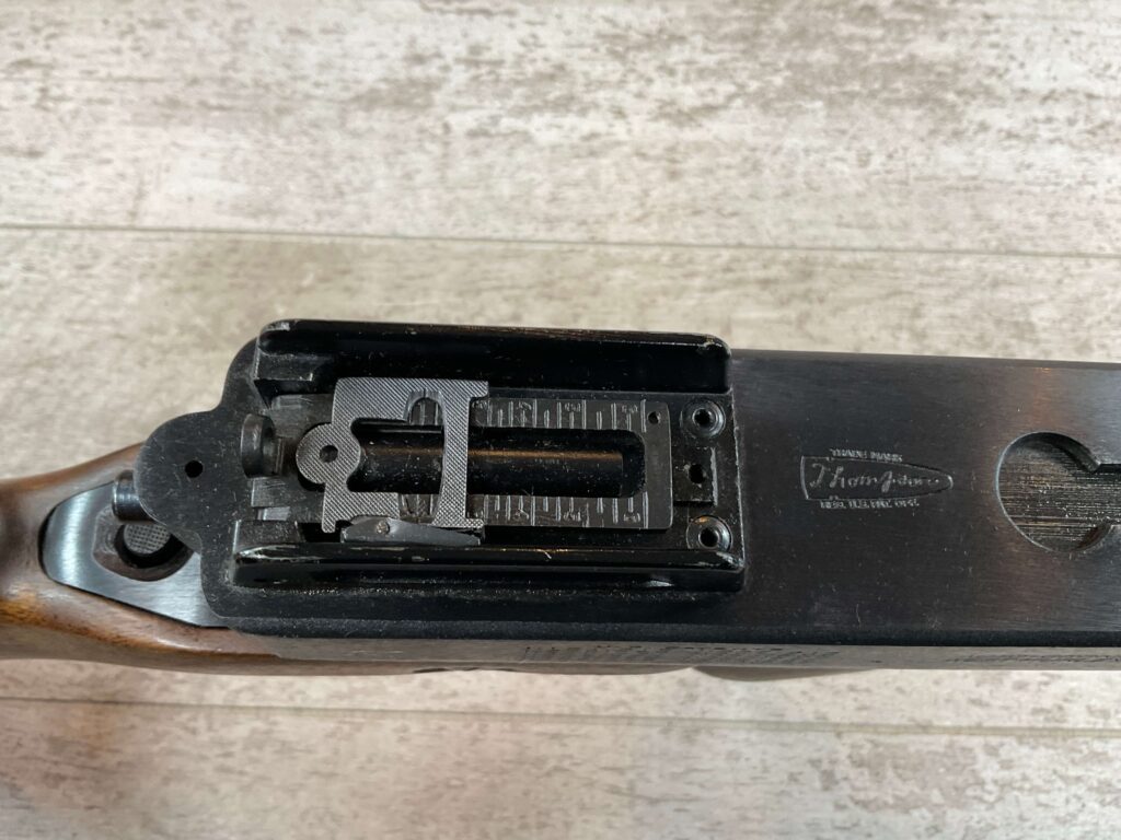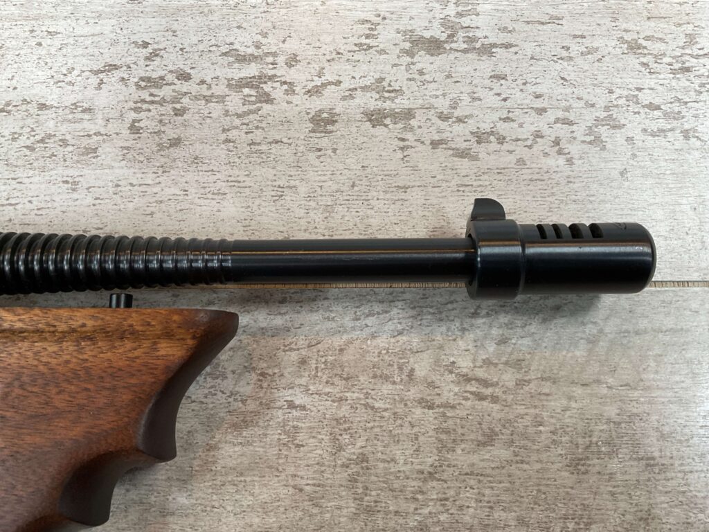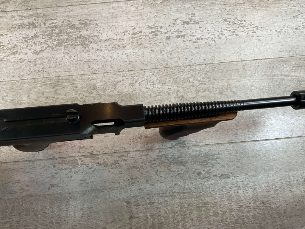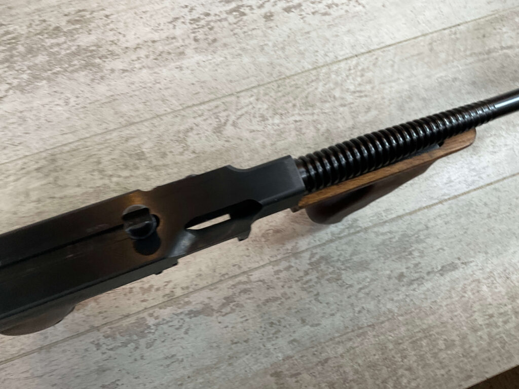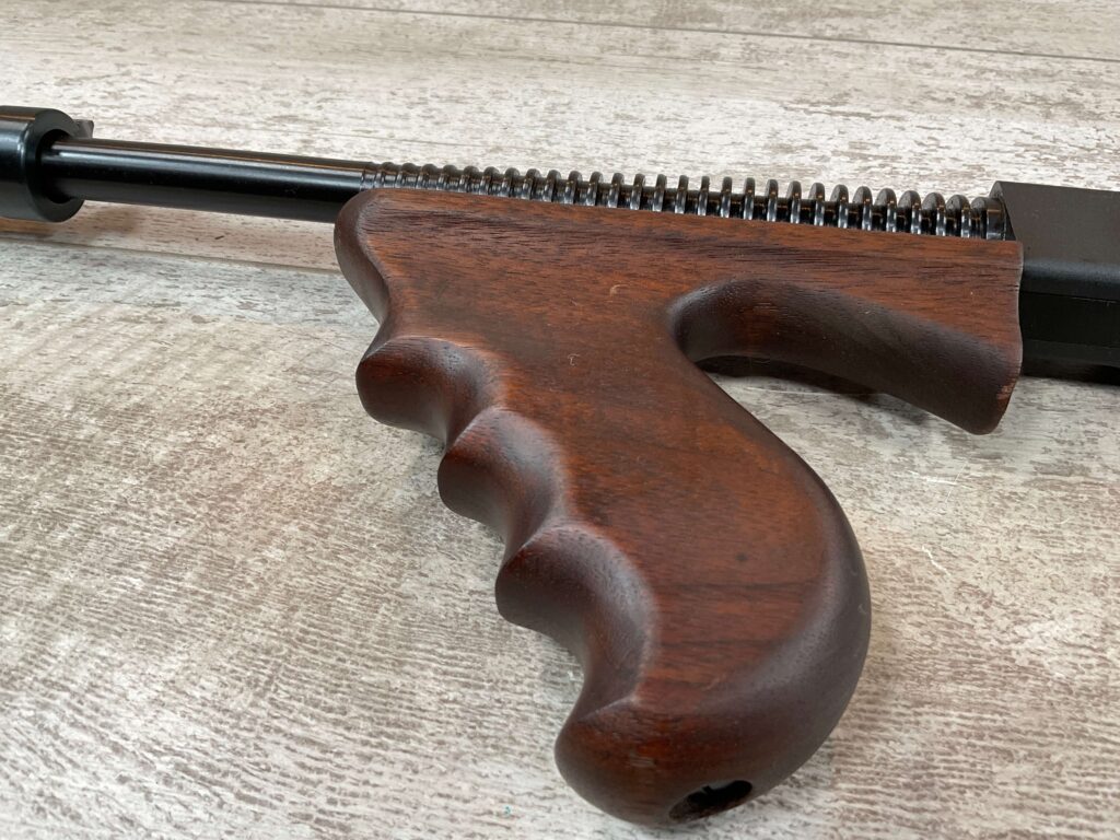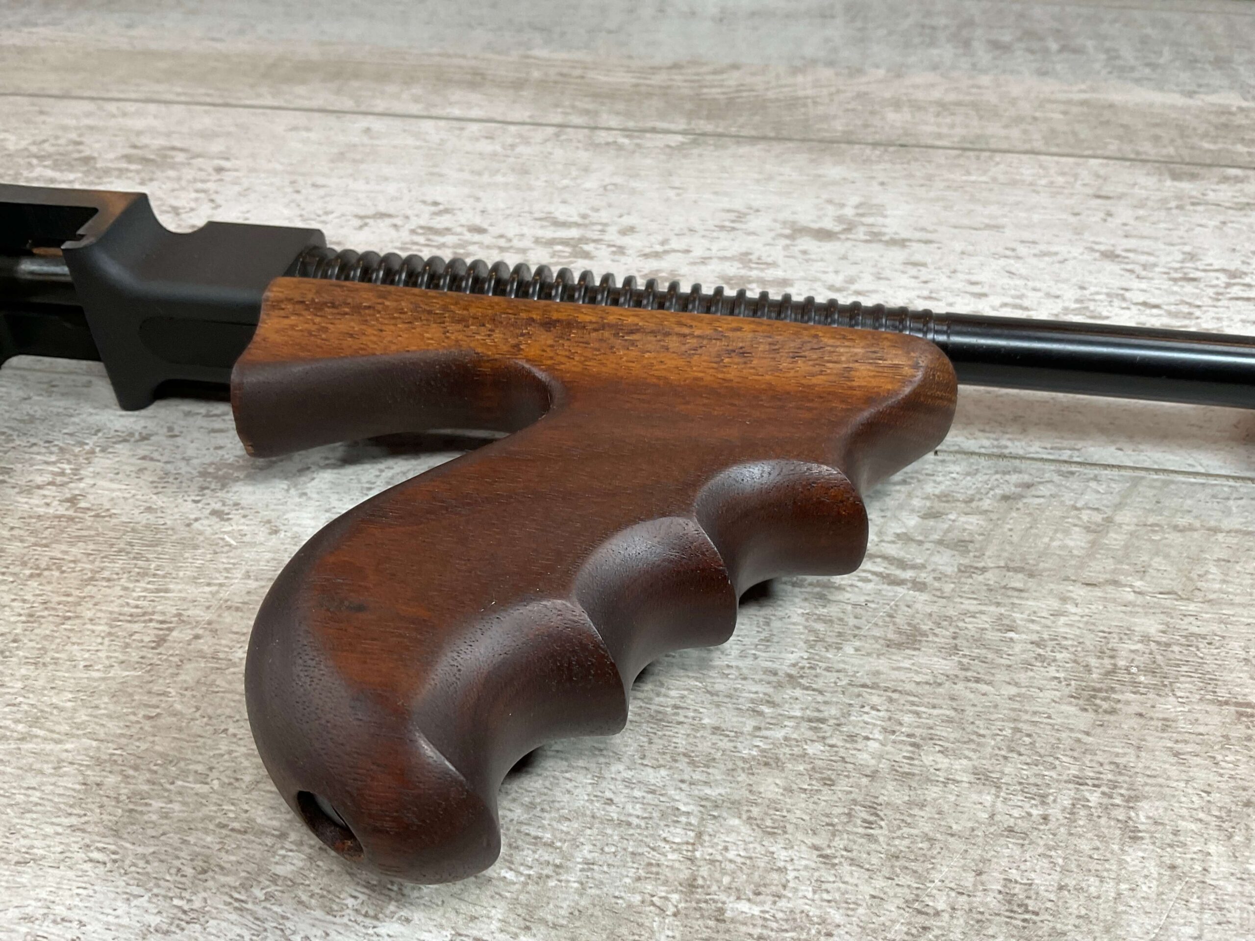 THIS IS AN EXCELLENT EXAMPLE OF A LATE PRODUCTION MODEL 1928 THOMPSON SUB-MACHINE GUN MANUFACTURED BY AUTO-ORDNANCE CORPORATION OF WEST HURLY, NEW YORK. THESE SMGS CAN BE EASILY IDENTIFIED BY THE “A†SERIAL NUMBER SUFFIX AS BEING PRODUCED CIRCA THE 1970S..