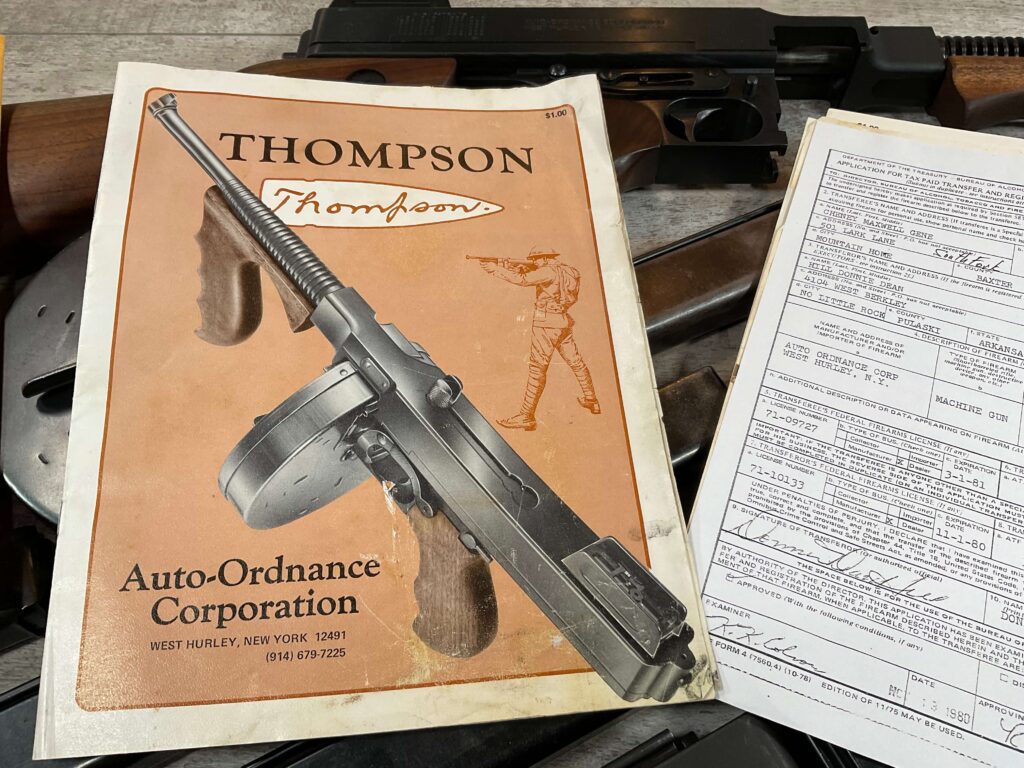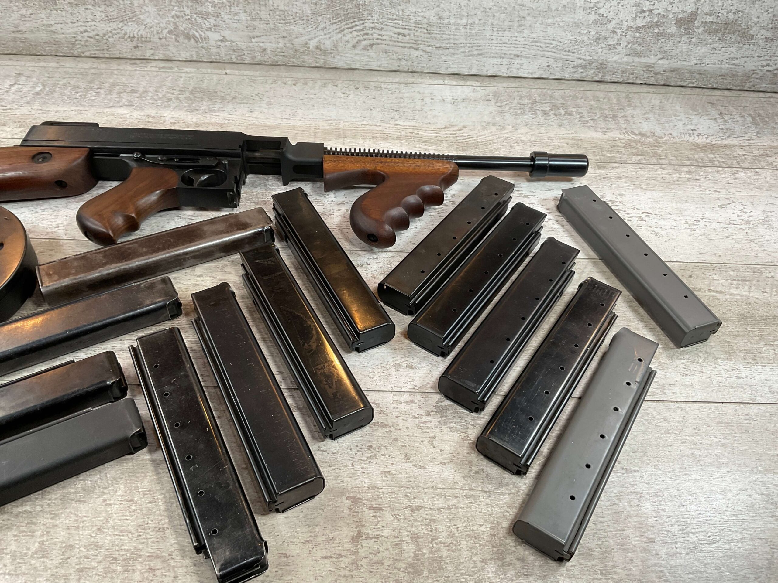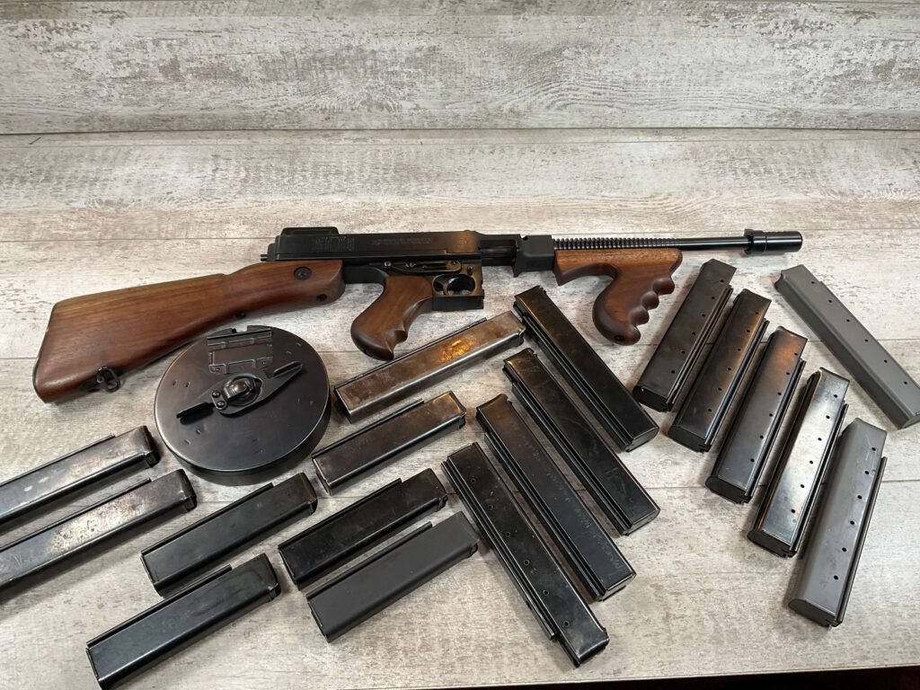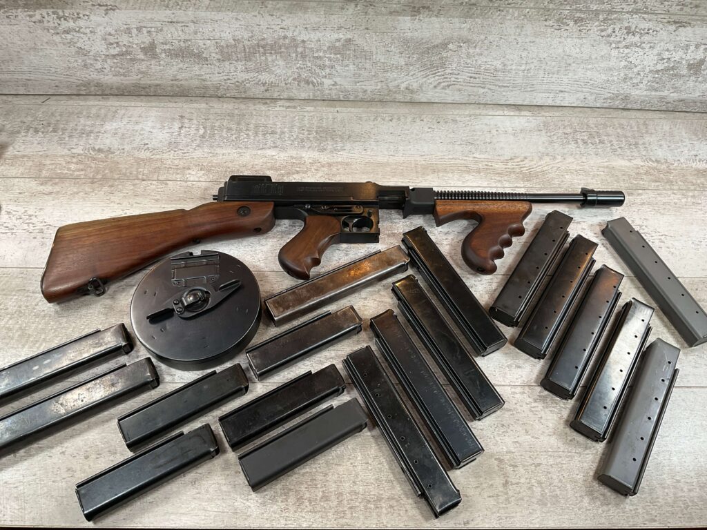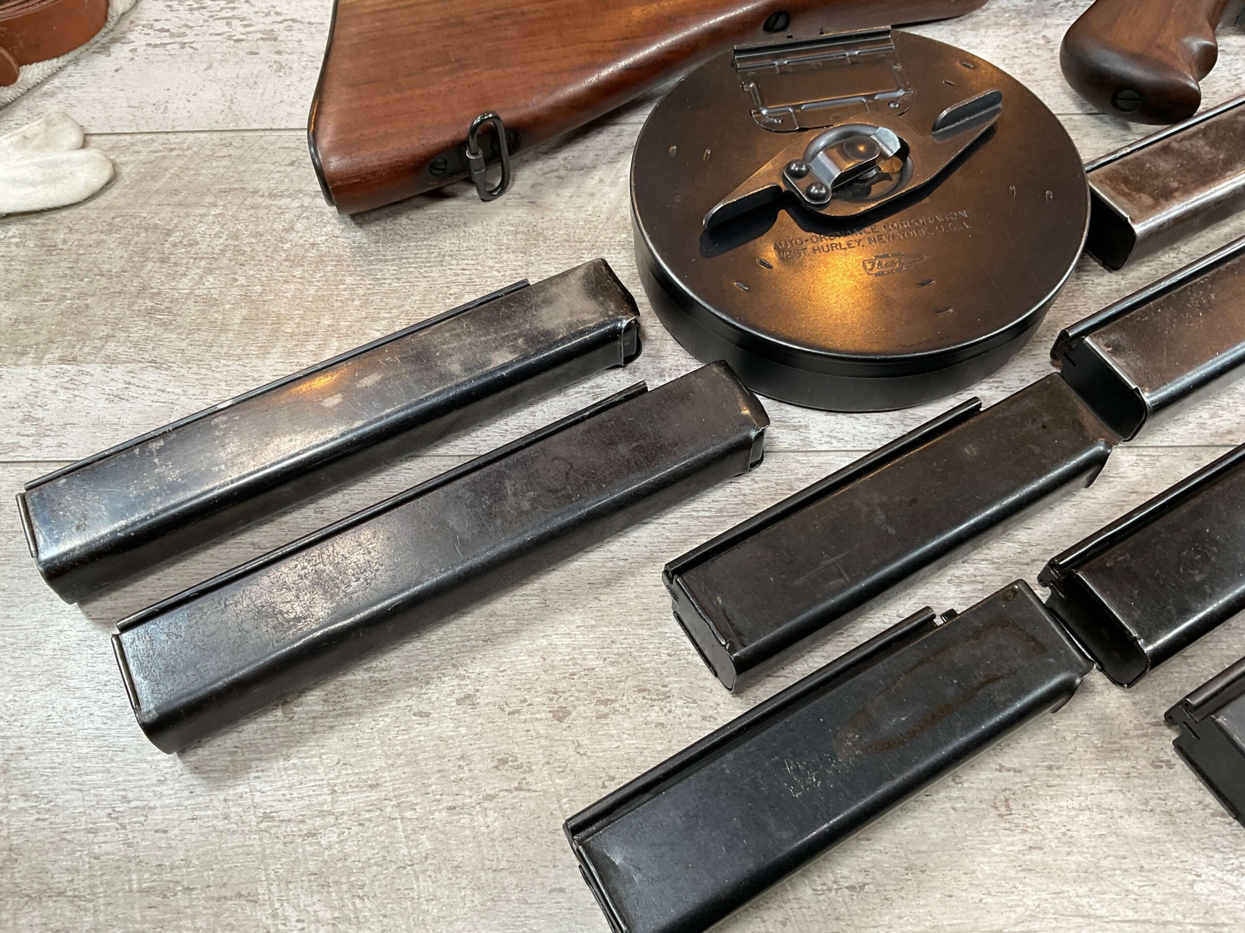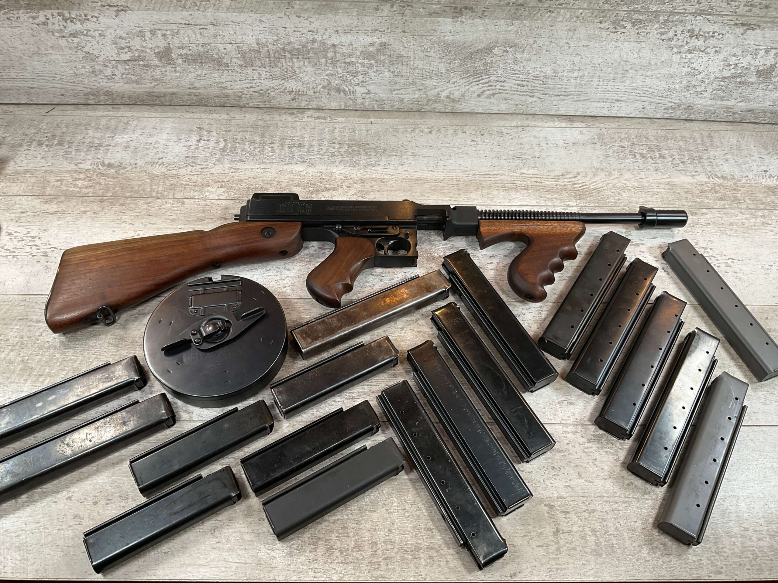 WEST HURLEY 1928 THOMPSON 45ACP TRANSFERABLE SUBMACHINE GUN #1389A, EXC BORE, EXC WALNUT WOOD, EXC BLUE W/NO FRECKLING OR SCRATCHES, AUTO-ORDNANCE MANUFACTURER, VERTICAL FORE END, COMPENSATOR, WEST HURLEY REAR SIGHT, 50 ROUND DRUM MAGAZINE, 13 30 ROUND MAGS, 5 20 ROUND MAGS, AMAZING CONDITION