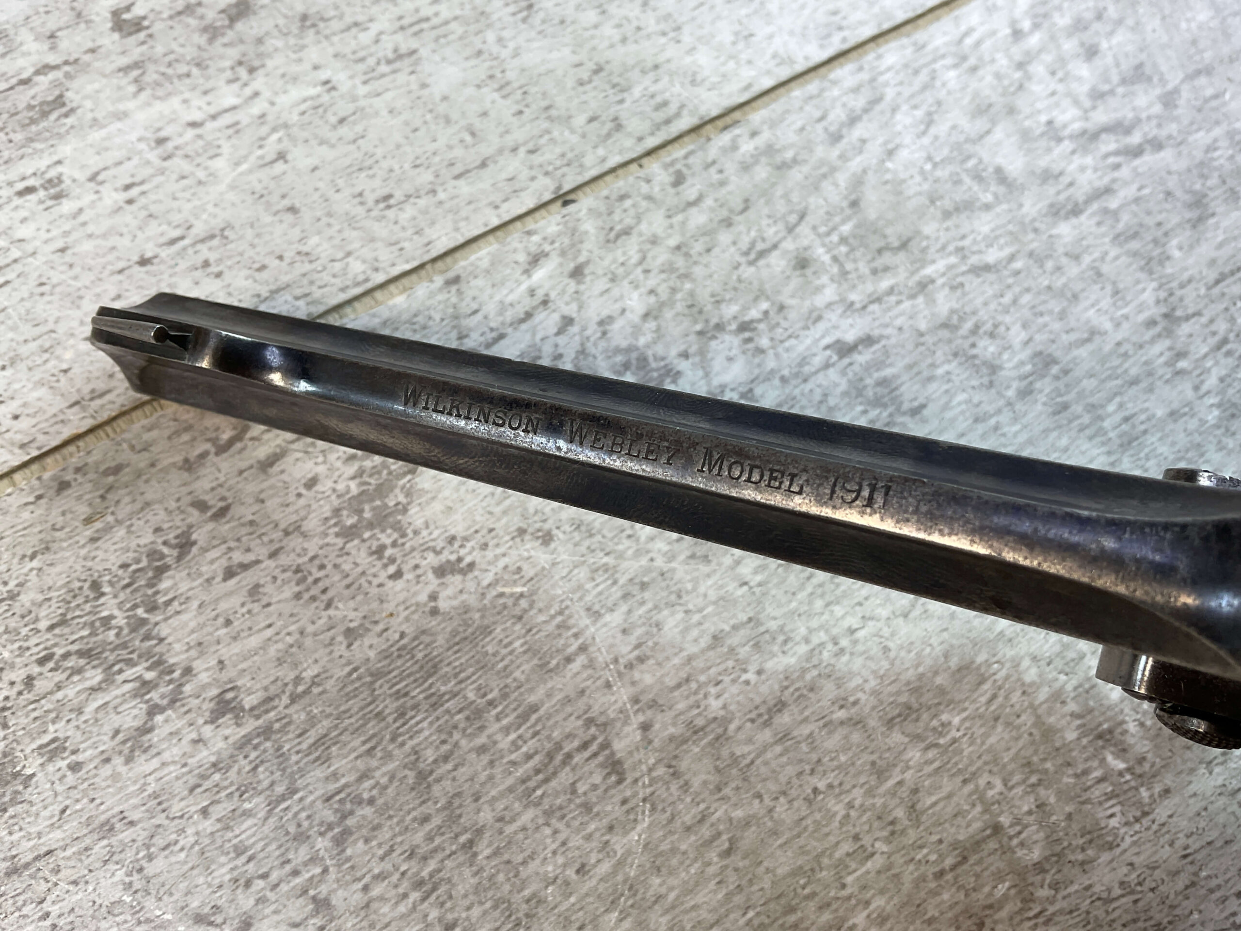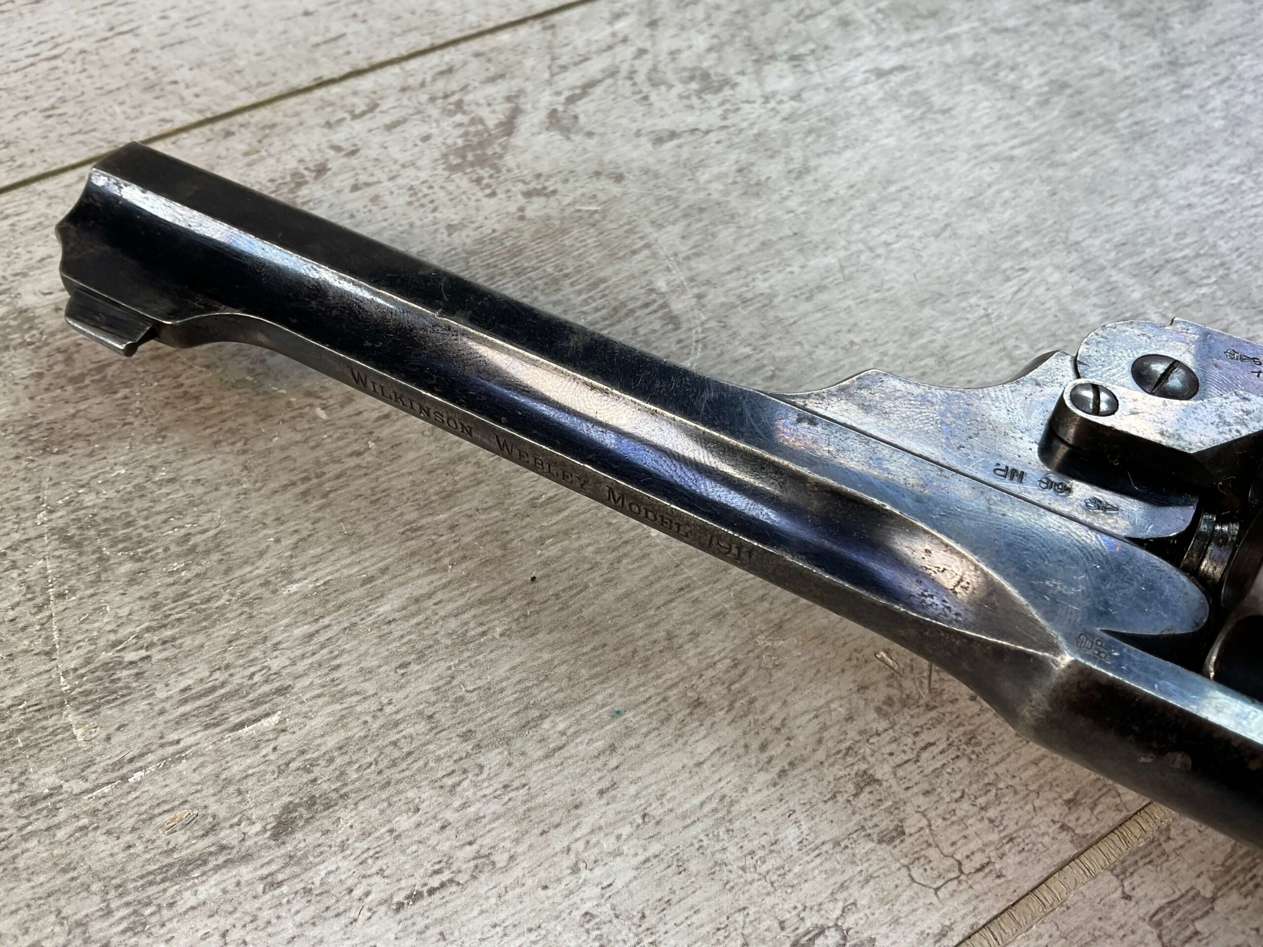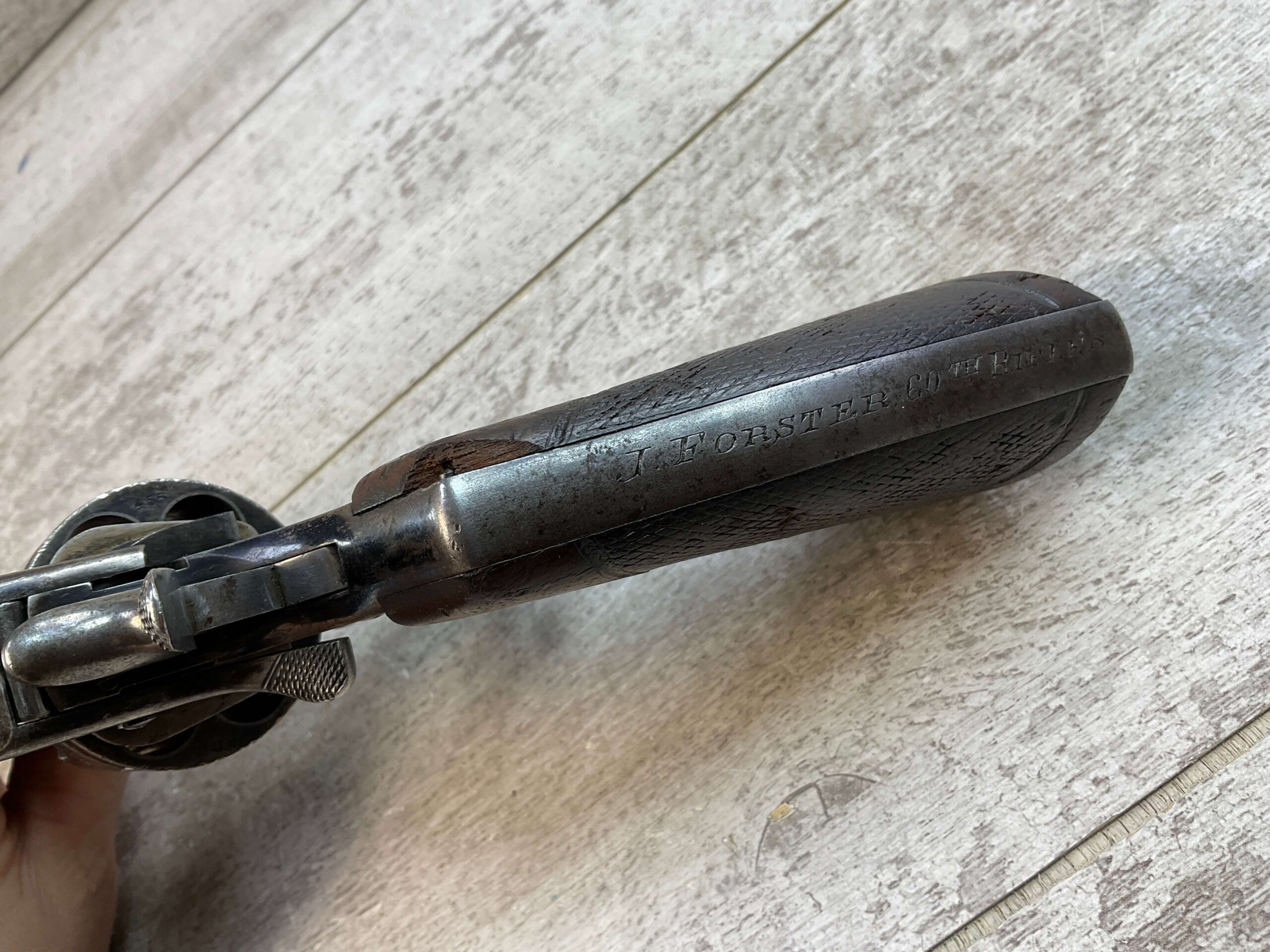 WILKINSON WEBLEY MODEL 1911 .450/.455 TARGET REVOLVER #128800, 7.5″ BARREL, ALL MATCHING INCLUDING THE GRIPS, 6 ROUND FLUTED CYLINDER, DRIFT ADJ REAR SIGHT, BLADE FRONT SIGHT, “WILKINSON WEBLEY MODEL 1911” ON TOP OF BARREL, “WILKINSON WEBLEY ’11” MARKED ABOVE CYLINDER ON TOP STRAP, VG ORIGINAL & MATCHING WALNUT GRIPS W/ WEAR & PIECES MISSING (SEE PHOTOS), TRIGGER GUARD MARKED “4115”, GRIP BACKSTRAP MARKED “J. FORSTER 60TH RIFLES” WHICH REFERS TO “JOHN FORSTER, 2ND LT KING’S ROYAL RIFLE CORPS 2ND BN” ATTACHED PROVINANCE, CONDITION AS SHOWN IN PICTURES, FROM THE JAMES EARL JONES “FAVORITES” COLLECTION W/ CERTIFICATE OF AUTHENTICITY.