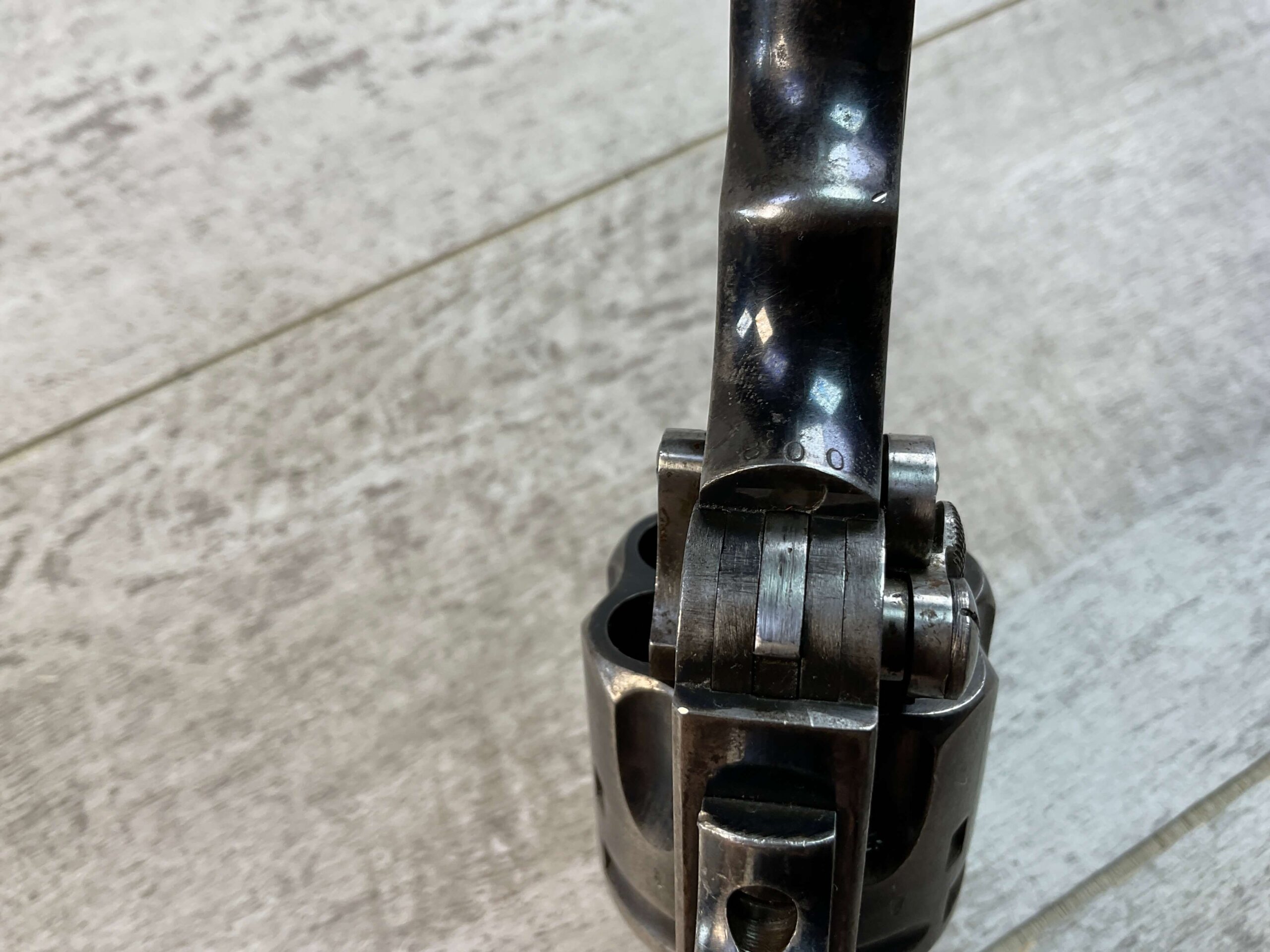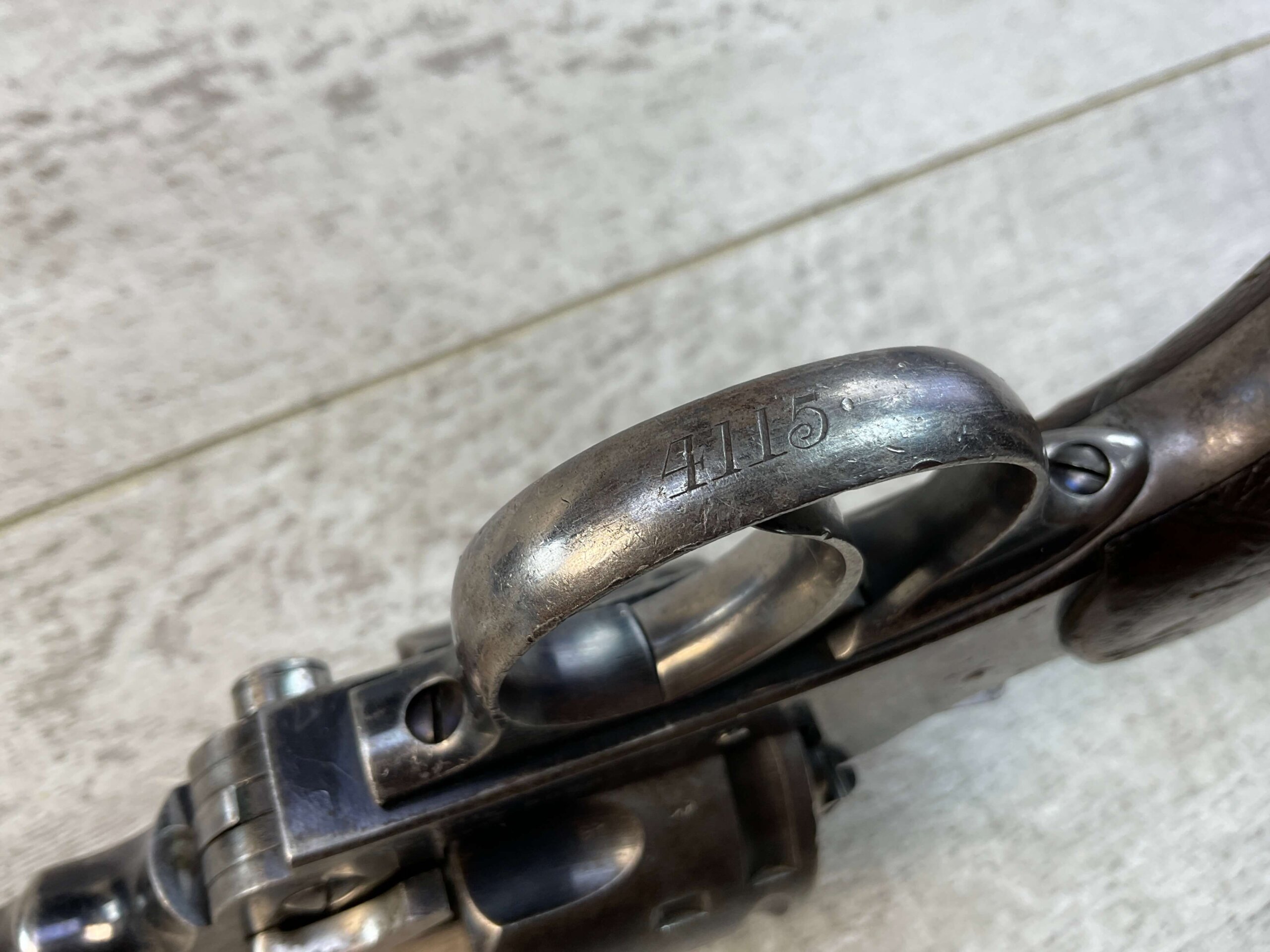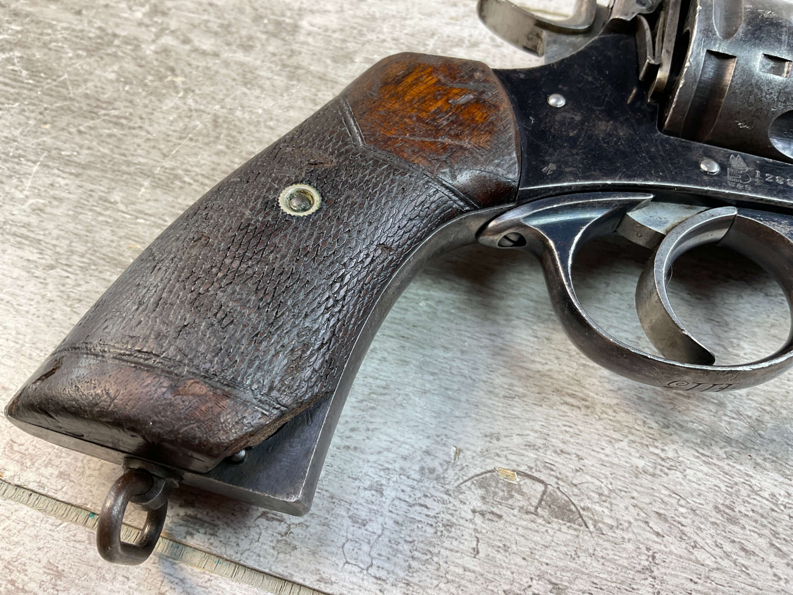 WILKINSON WEBLEY MODEL 1911 .450/.455 TARGET REVOLVER #128800, 7.5″ BARREL, ALL MATCHING INCLUDING THE GRIPS, 6 ROUND FLUTED CYLINDER, DRIFT ADJ REAR SIGHT, BLADE FRONT SIGHT, “WILKINSON WEBLEY MODEL 1911” ON TOP OF BARREL, “WILKINSON WEBLEY ’11” MARKED ABOVE CYLINDER ON TOP STRAP, VG ORIGINAL & MATCHING WALNUT GRIPS W/ WEAR & PIECES MISSING (SEE PHOTOS), TRIGGER GUARD MARKED “4115”, GRIP BACKSTRAP MARKED “J. FORSTER 60TH RIFLES” WHICH REFERS TO “JOHN FORSTER, 2ND LT KING’S ROYAL RIFLE CORPS 2ND BN” ATTACHED PROVINANCE, CONDITION AS SHOWN IN PICTURES, FROM THE JAMES EARL JONES “FAVORITES” COLLECTION W/ CERTIFICATE OF AUTHENTICITY.