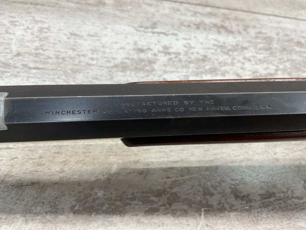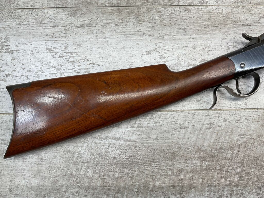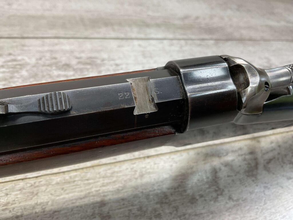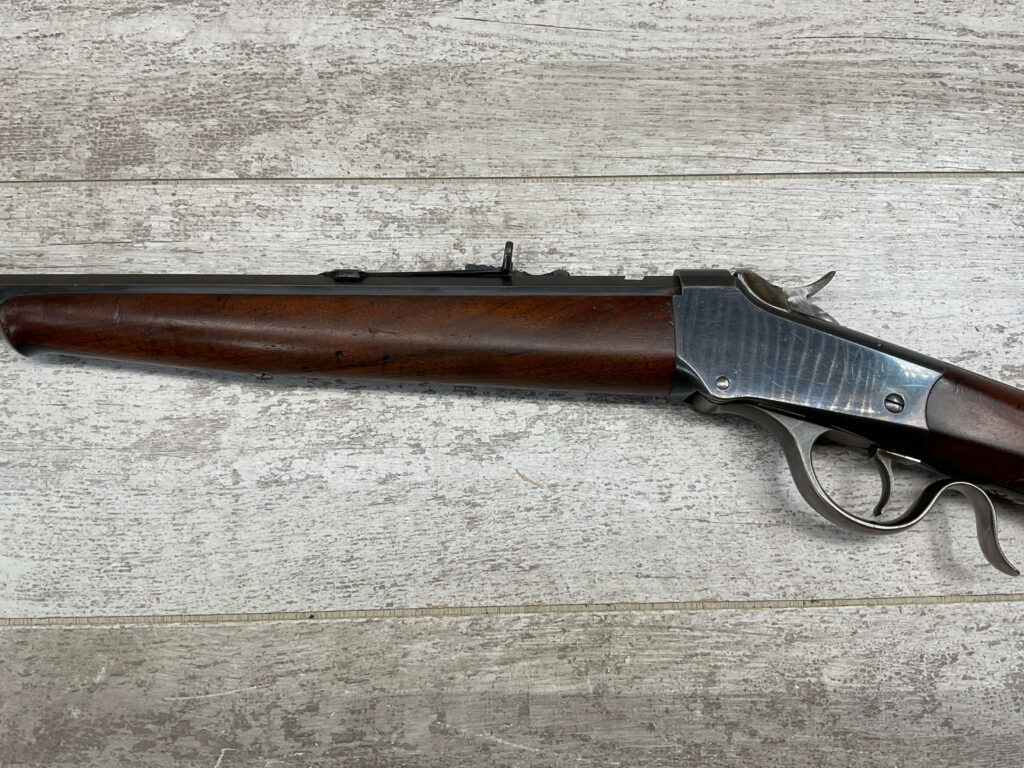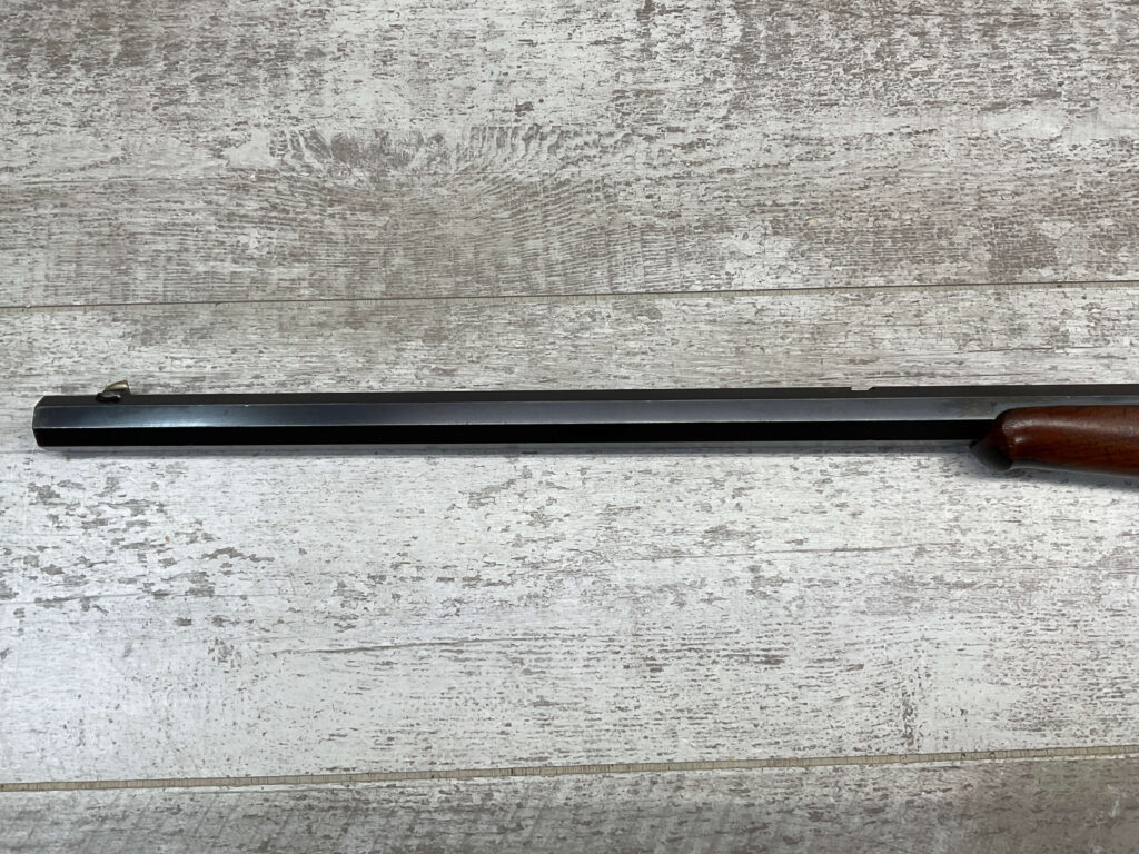 WINCHESTER 1885 LOW WALL SINGLE SHOT .22LR RIFLE, 1901 MFR #89819, 24 3/8″ OCTAGON BARREL, SINGLE SHOT FALLING BLOCK, 70%+ BLUE ON RECEIVER, VG WOOD STOCK W/ NORMAL DINGS NICKS FROM AGE / USE, EXC BORE & RIFLING (NEEDS CLEANING), CRESCENT BUTT STOCK W/ METAL PLATE, VG OVERALL NICE 100+YR OLD GUN!