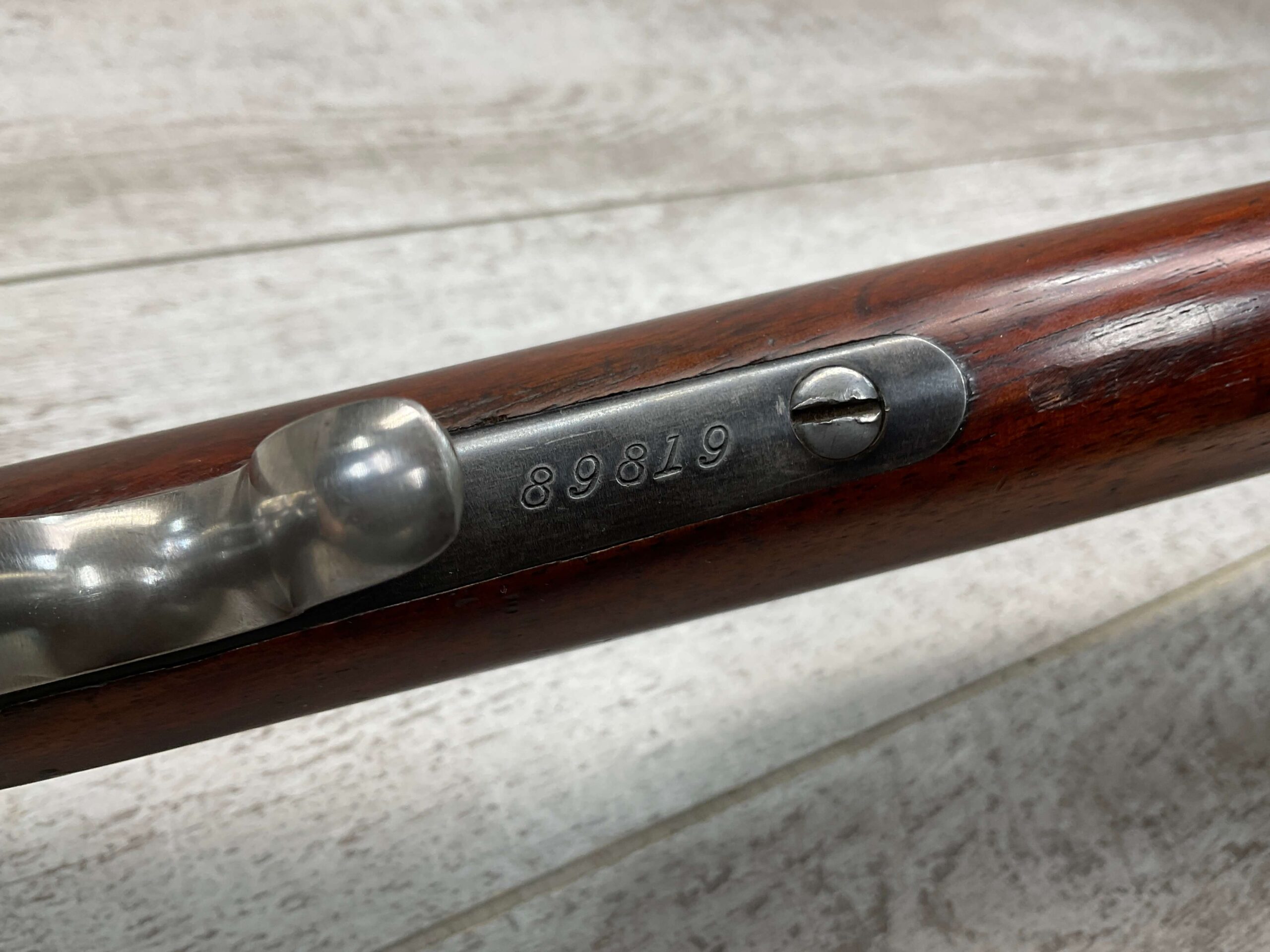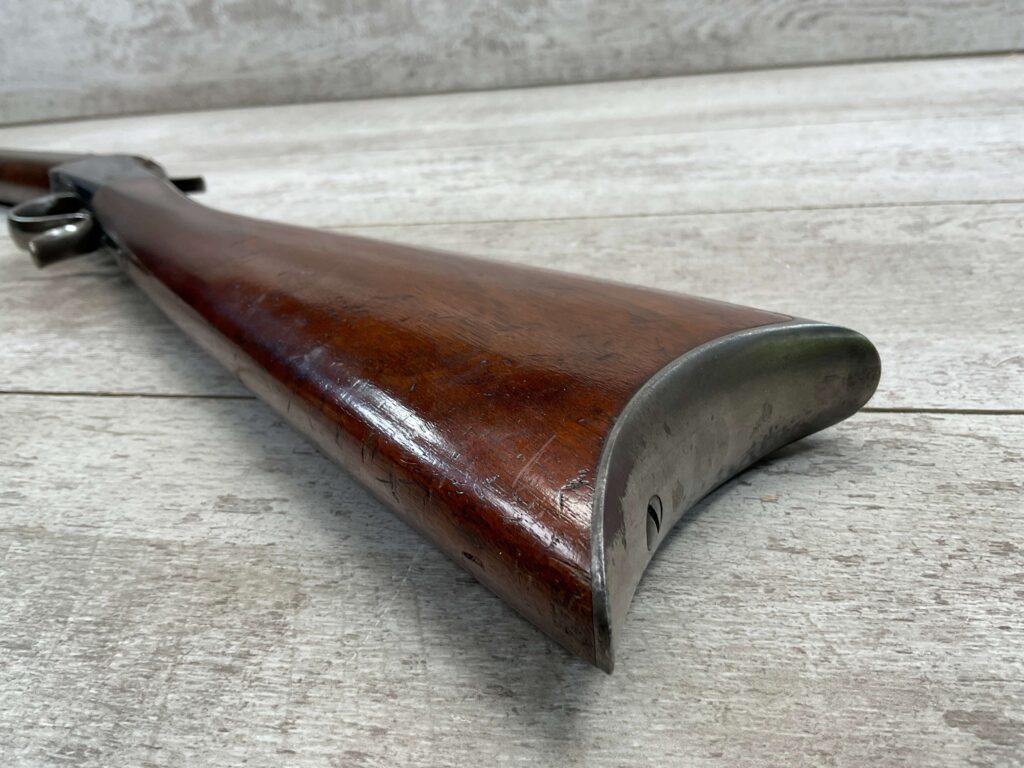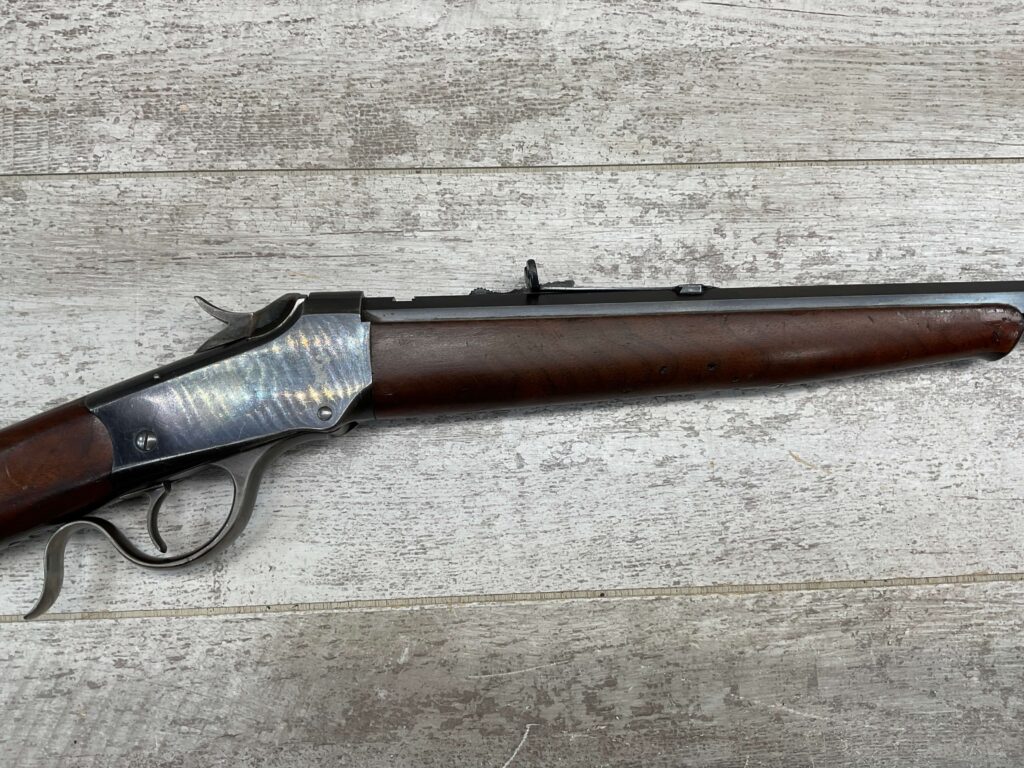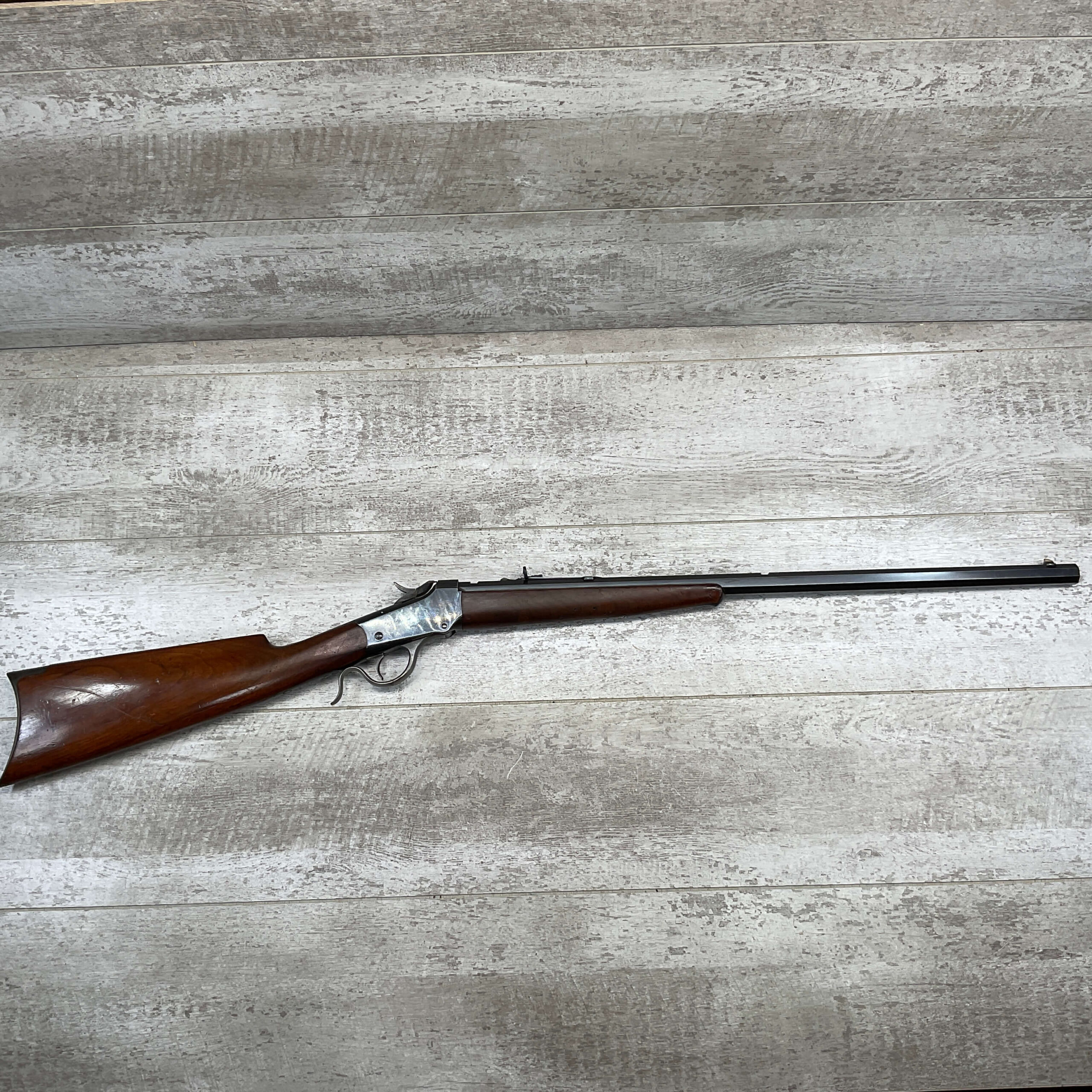 WINCHESTER 1885 LOW WALL SINGLE SHOT .22LR RIFLE, 1901 MFR #89819, 24 3/8″ OCTAGON BARREL, SINGLE SHOT FALLING BLOCK, 70%+ BLUE ON RECEIVER, VG WOOD STOCK W/ NORMAL DINGS NICKS FROM AGE / USE, EXC BORE & RIFLING (NEEDS CLEANING), CRESCENT BUTT STOCK W/ METAL PLATE, VG OVERALL NICE 100+YR OLD GUN!