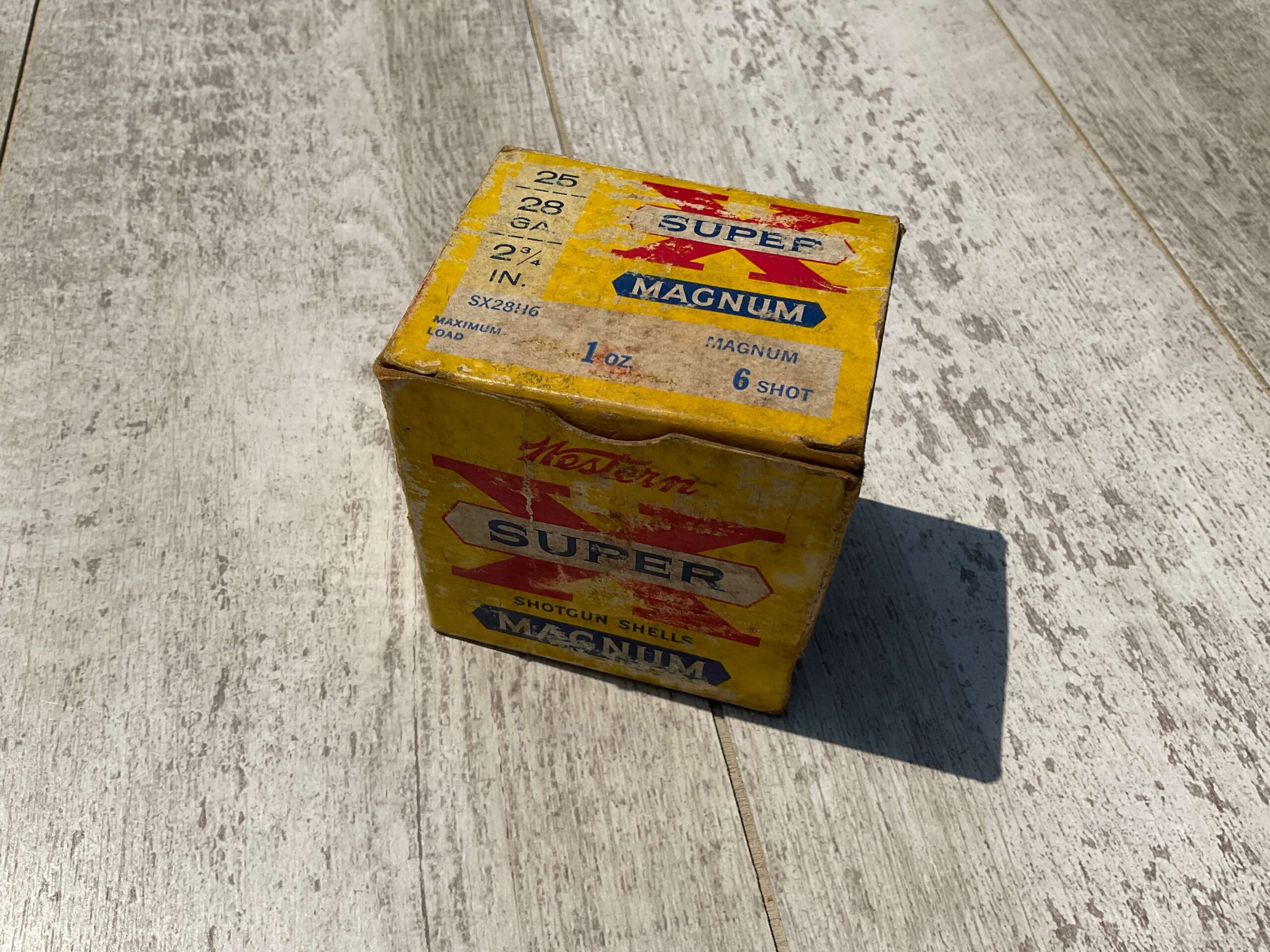 WINCHESTER 28 GA WESTERN SUPER X SHOTGUN SHELLS, SHORT SHOT STRING, QTY 25, VINTAGE #3-08537-BDH