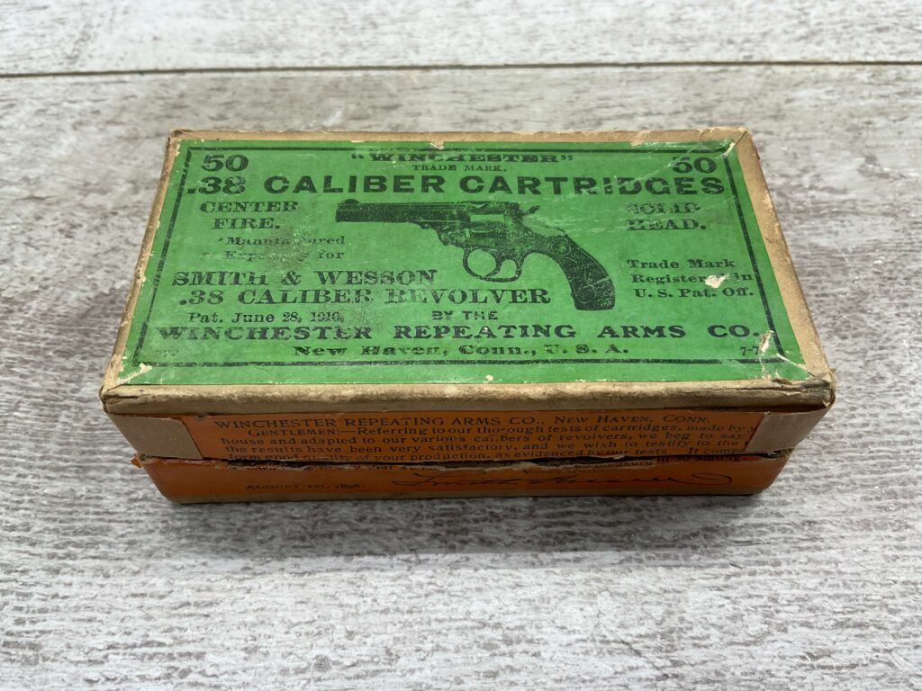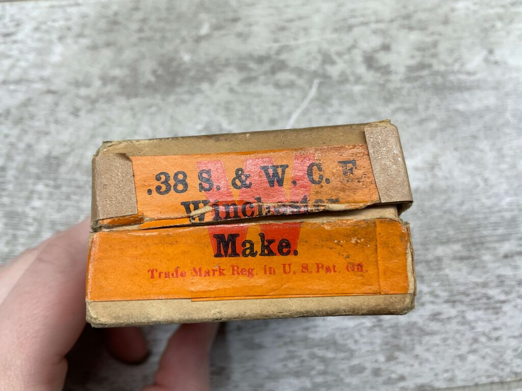 WINCHESTER .38 CAL S&W CENTER FIRE CARTRIDGES, VINTAGE, RARE, QTY 18, BOX IS IN GREAT CONDITION FOR AGE, NO MISSING PARTS OF BOX