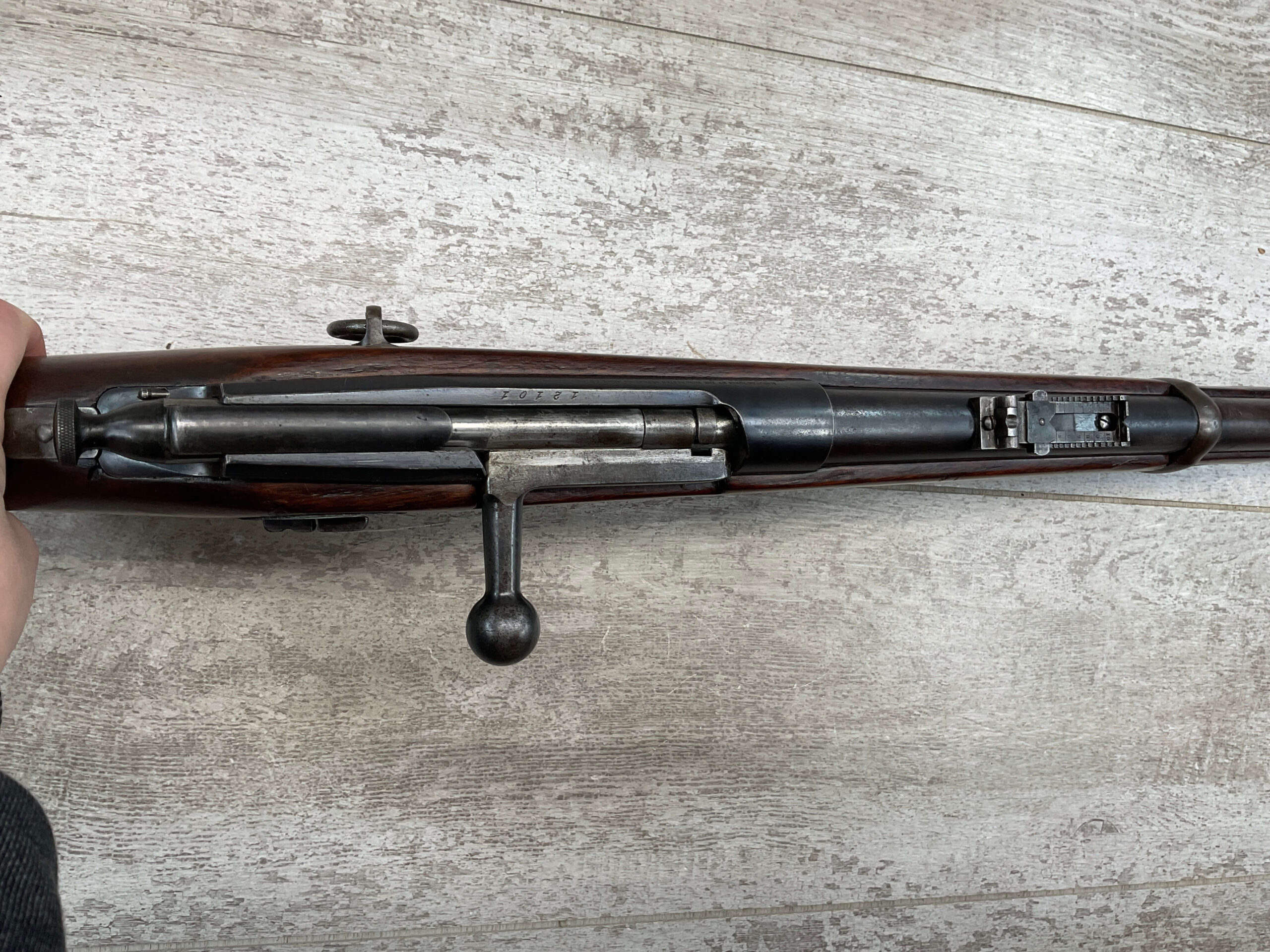 WINCHESTER HOTCHKISS .45-70 CARBINE BOLT ACTION RIFLE #12010, PART OF THE FIRST PRODUCTION CARBINE FOR THE CAVALRY, FEATURES ROTATING SAFETY/MAGAZINE CUT-OFF ON RIGHT SITE OF RECEIVER, ONE PIECE WOOD STOCK & FOREARM, NO CRACKS PRESENT, ORIGINAL SADDLE RING PRESENT, 24″ ROUND BBL, BLUE FINISH HAS TURNED TO A BLUE GREY PATINA, HIGH EDGE WEAR AS EXPECTED FROM USE, FIXED FRONT SIGHT W/ADJ REAR SIGHT, EXC CONDITION, BLUE METAL BUTT-PLATE, ONE PIECE CARBINE WOOD STOCK & FOREARM IN EXC CONDITION W/COMPRESSION MARKS & LIGHT DISCOLORATION FROM AGE, RECEIVER & BOLT SHOW WEAR FROM SLIDE & ROTATION ACTION AS EXPECTED, EXC OVERALL CONDITION & WOULD BE A GREAT ADDITION TO A COLLECTION.